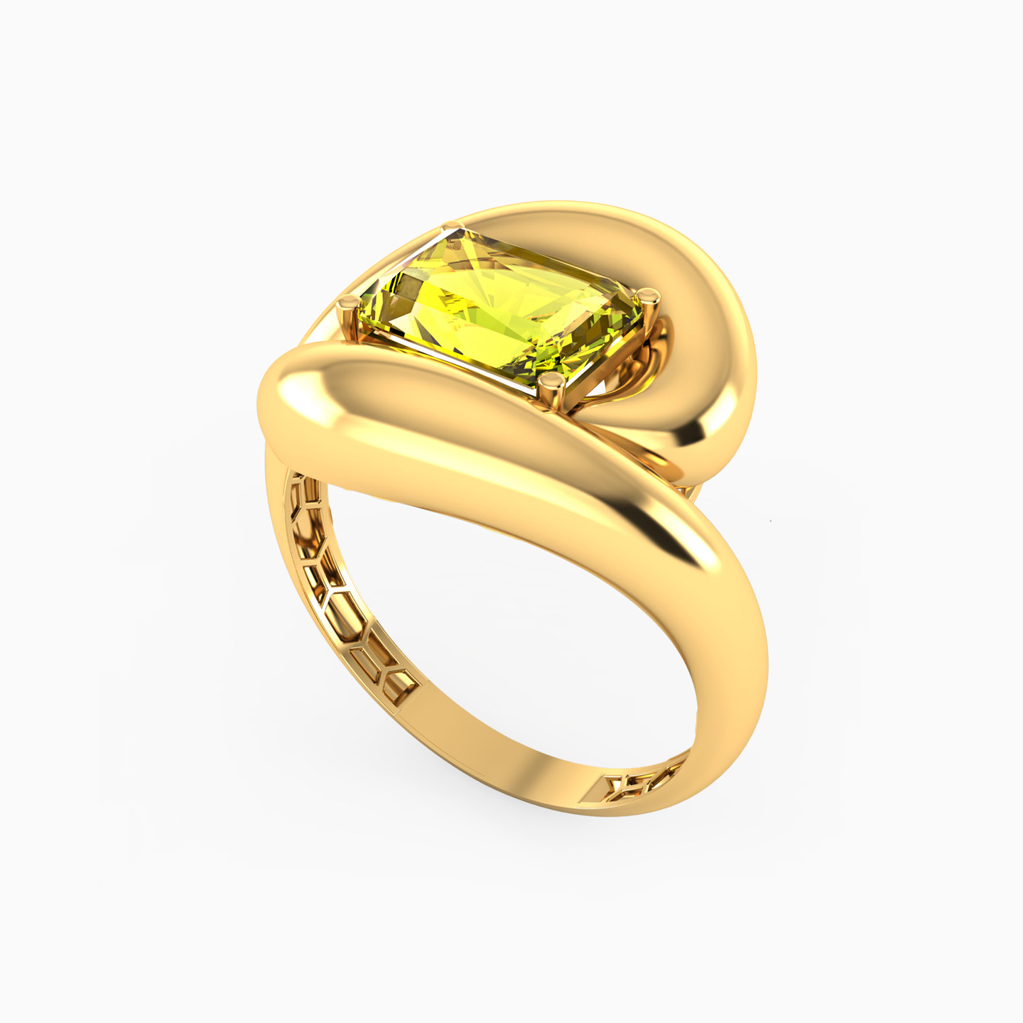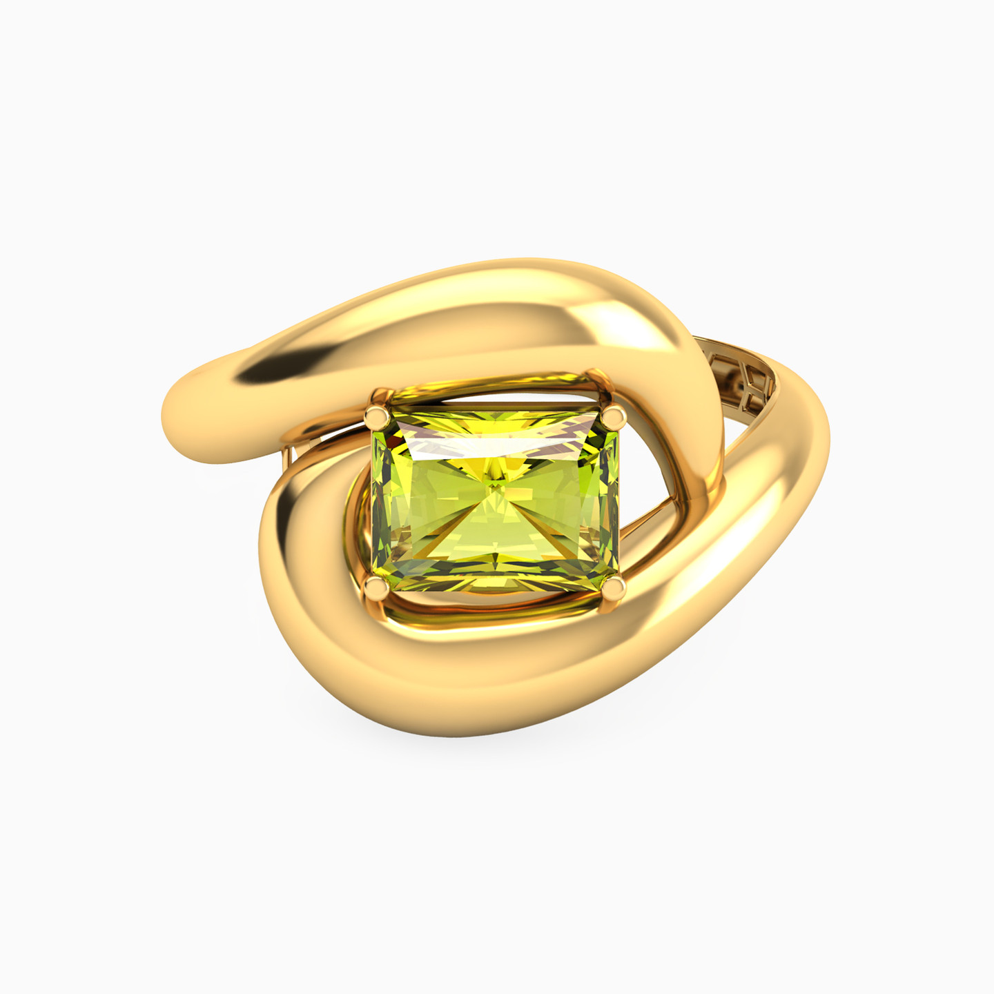 Turn heads with this breathtaking statement ring from L'azurde Gold. Beautifully crafted in highly polished 18-karat yellow gold, this captivating ring features a vibrant baguette-shaped green colored stone at the center of a stunning swirl of gold, adding a charming feminine touch to all of your favorite looks. The perfect anytime choice, this gorgeous ring suits your unique style.