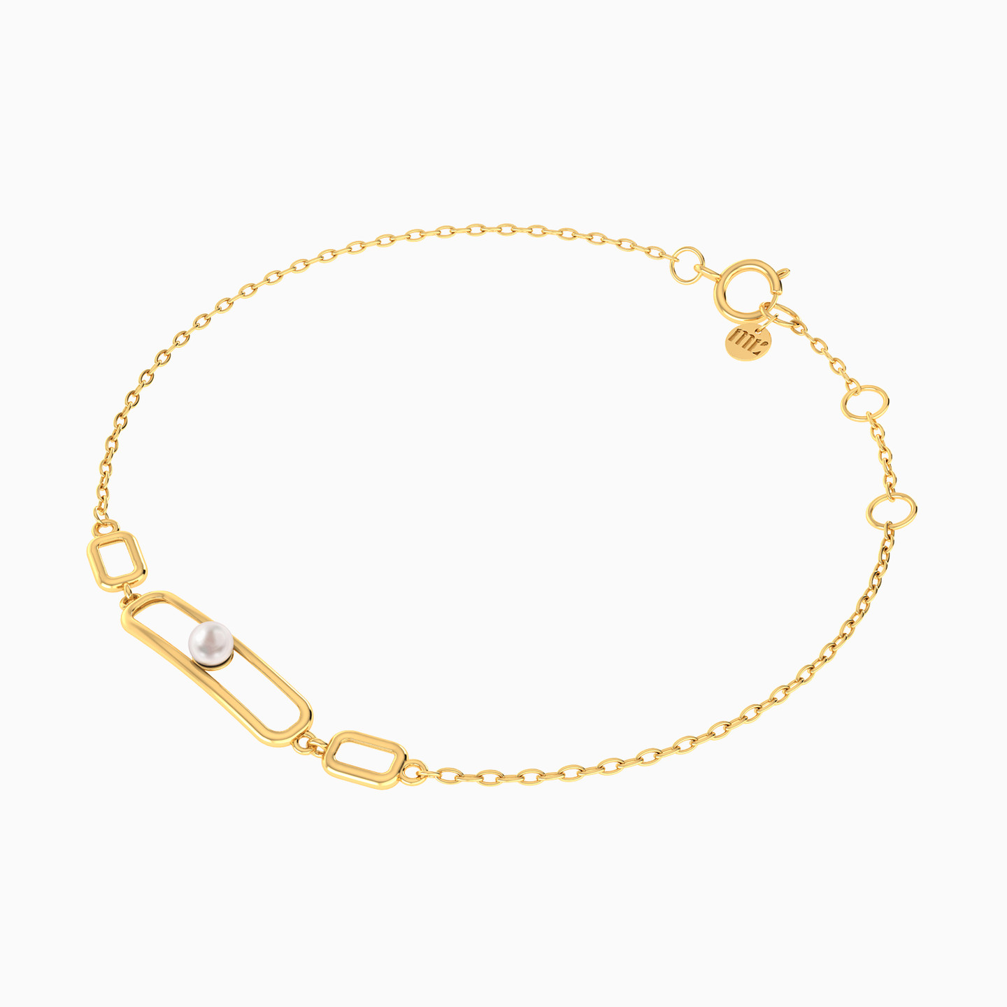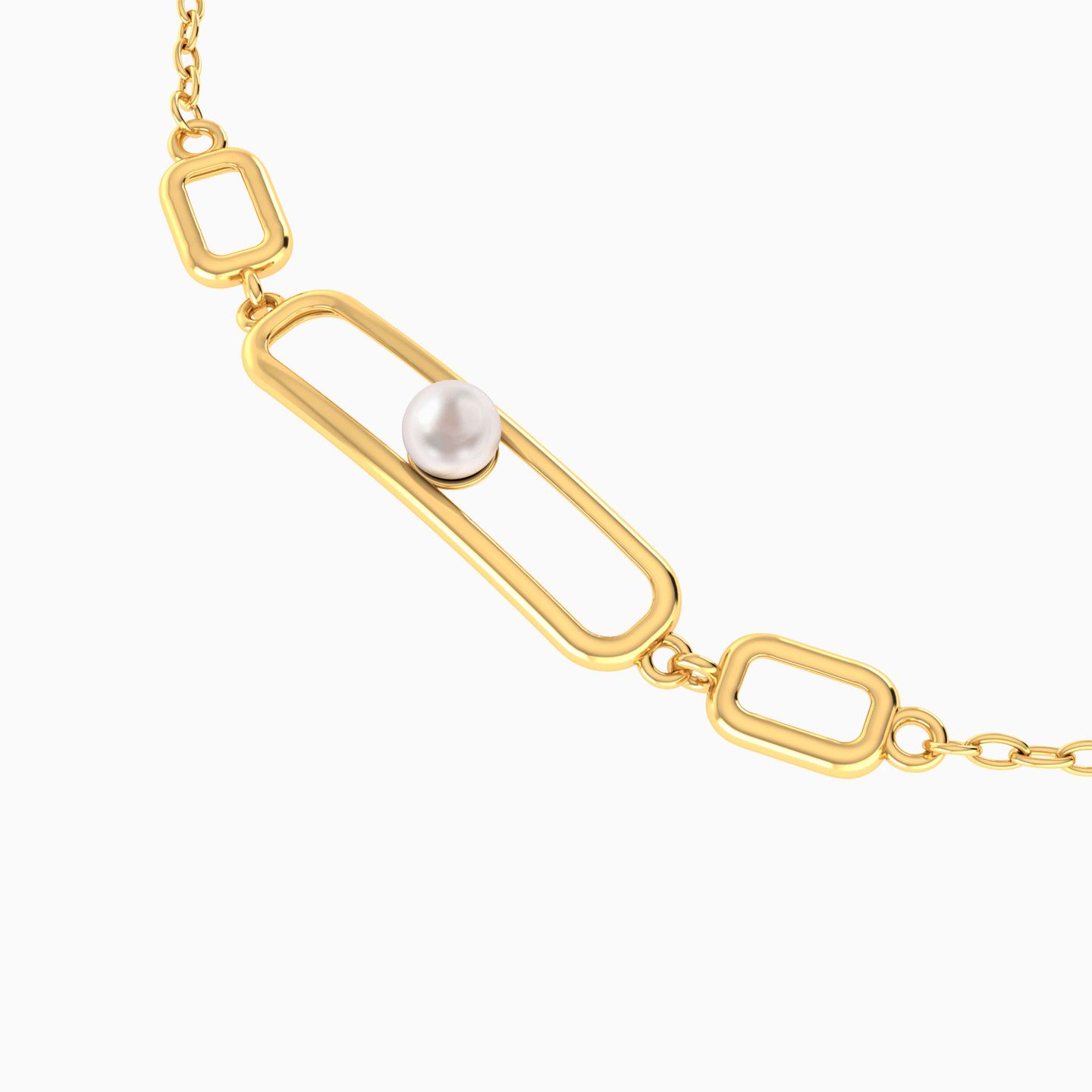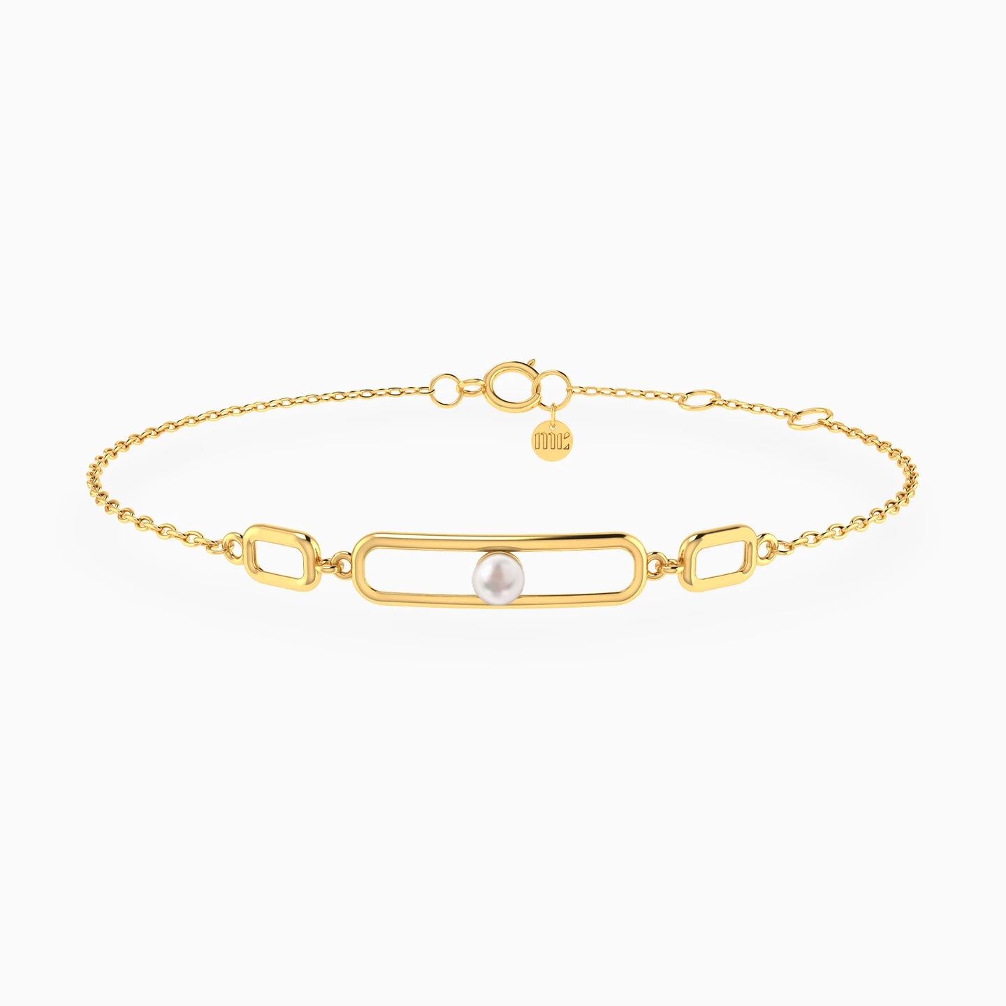 A refined play on shapes and softness. This bracelet features a central elongated link embracing a delicate pearl, balanced by geometric motifs on each side. Elegant on its own or stacked with others for a modern layered look.