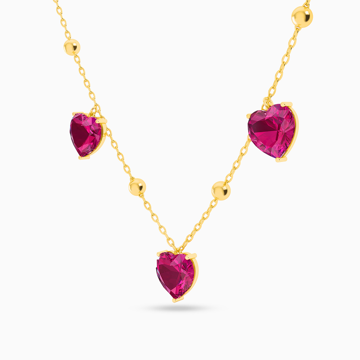 Lending a touch of royalty to your look with its deep pink hue, this hearts necklace from L’azurde Instyle will bring unmatched glamor to your outfit. The hearts line up and beautifully contrast with the 18-karat yellow gold chain. Wear yours with matching accessories from our collection to complete the look.