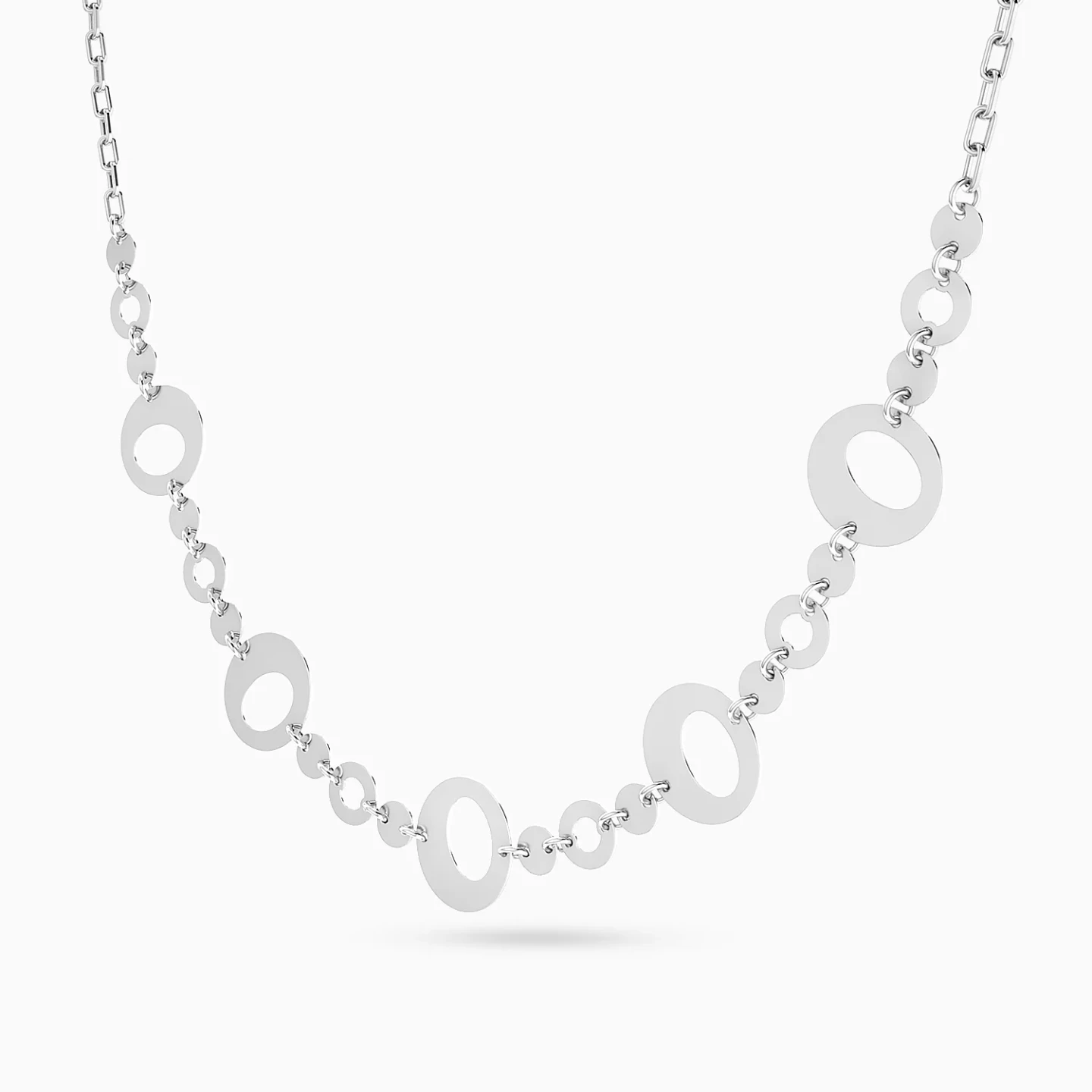 A rhythm of curves unfolding with effortless grace. This Waves silver necklace from the Equinox Collection features a delicate chain accented with round loops alternating with larger abstract loops, creating a fluid interplay of shapes along the neckline. Modern and expressive, it reflects individuality and quiet confidence—an elegant everyday piece and a thoughtful gift for someone who appreciates artistic, contemporary design.