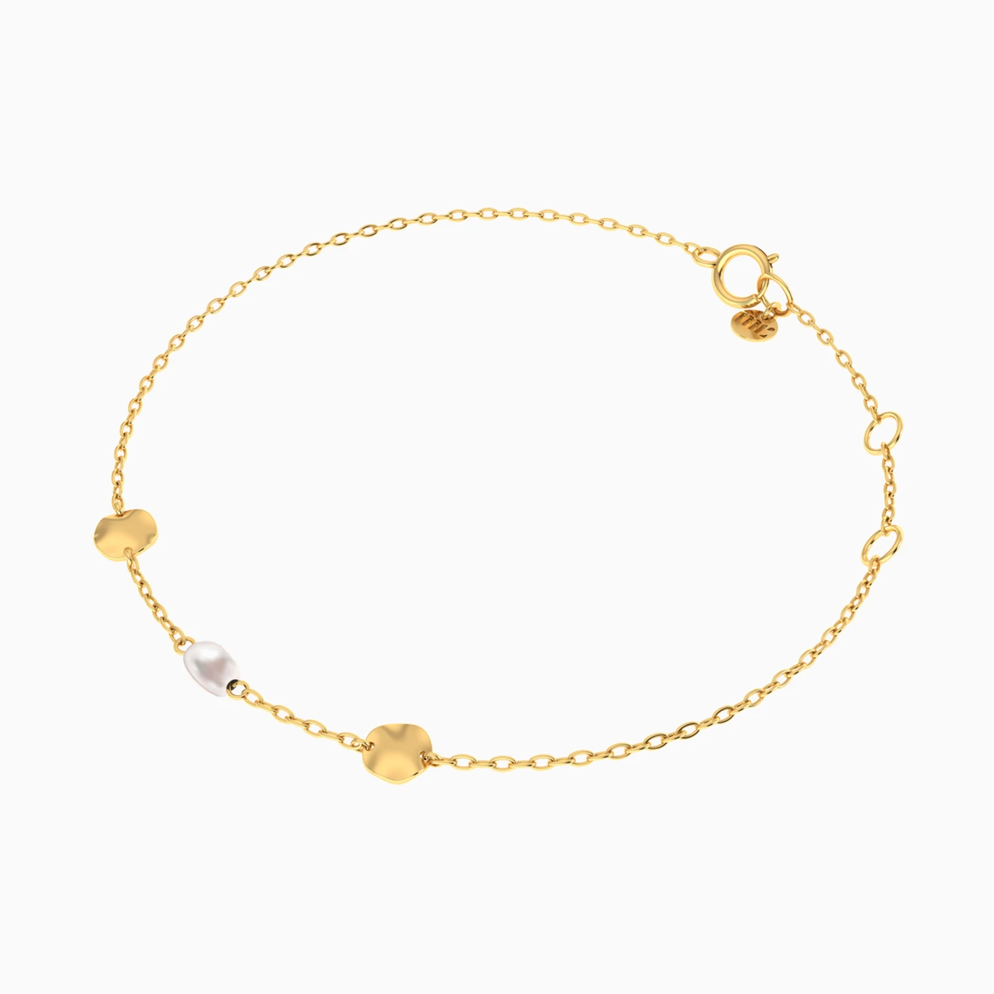 A quiet dialogue of light and gold. This chain bracelet features a delicate sequence of round gold discs balanced with a luminous pearl, creating a look that feels calm yet expressive. Designed for effortless everyday wear, it reflects understated confidence and makes a thoughtful gift for someone who values meaning in the smallest details.