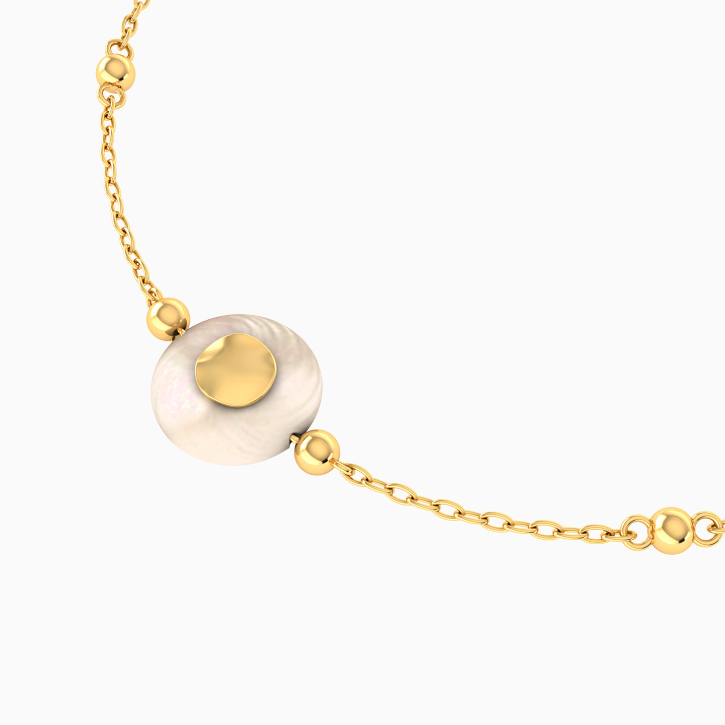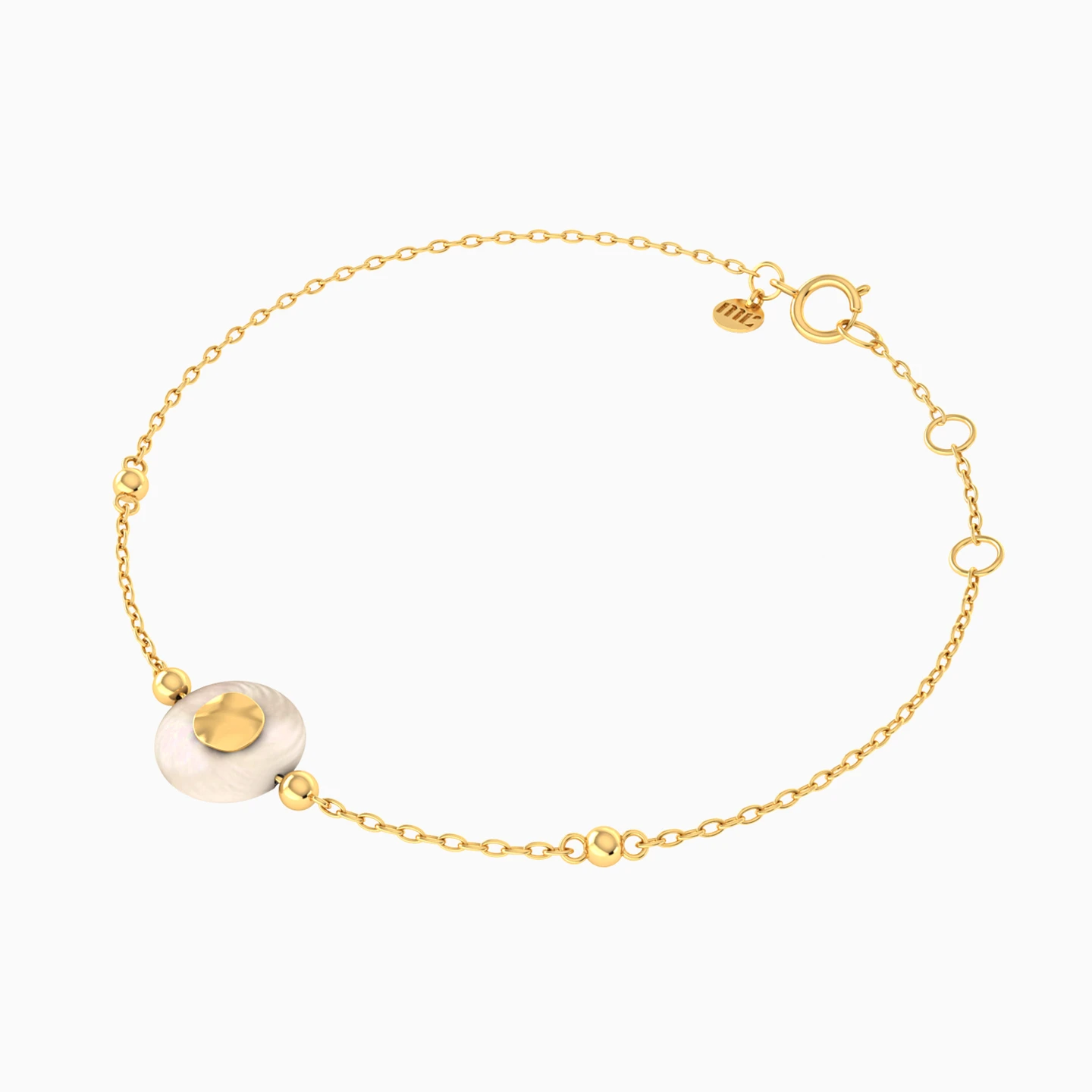 A quiet glow takes center stage. This chain bracelet features a round mother of pearl disc framed with a subtle golden accent, complemented by delicate gold beads along the chain for a softly balanced look. Designed for those who express elegance with ease, it’s a thoughtful gift that feels personal, refined, and effortlessly timeless.