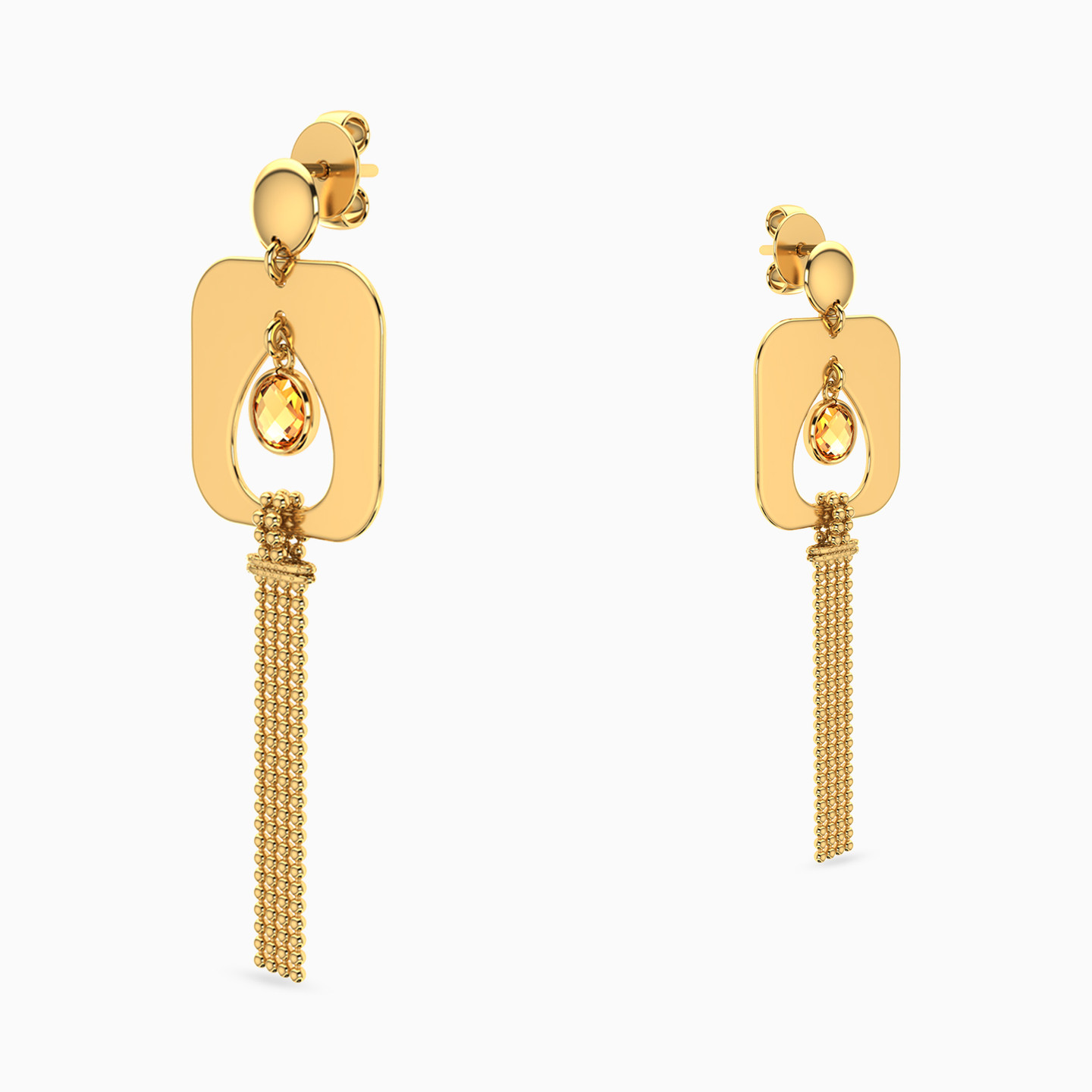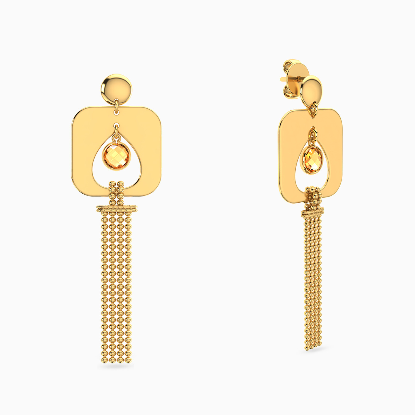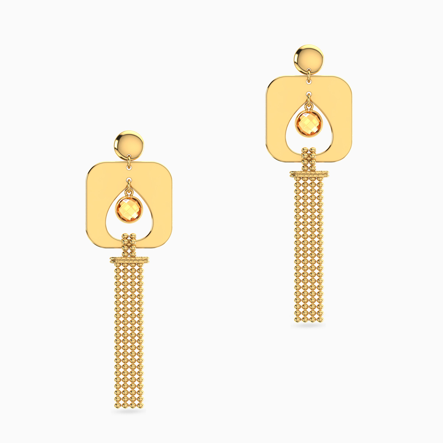 Add an elegant touch and a sophisticated pop of color to your chic looks with L'azurde Gold. Created in warm 18-karat yellow gold, these earrings feature bold squares with teardrop cutouts and amber colored stones at the center. Dainty chains dangling from the design offer a glamorous look and feel, making these fabulous earrings for dinners and parties.
