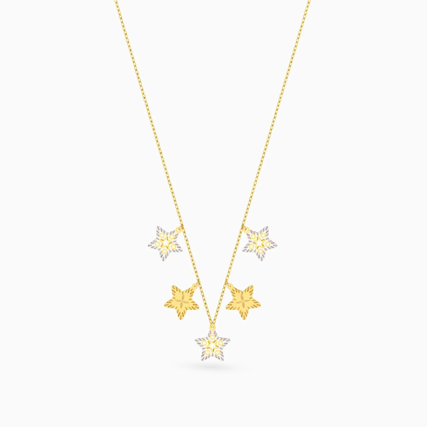 We love the shine this necklace from Miss L’ adds to any day to evening look. The two-tone stars stringed on an 18-karat yellow gold chain lend a playful appeal. We recommend you pair this necklace with a matching starry bracelet to complete the look.