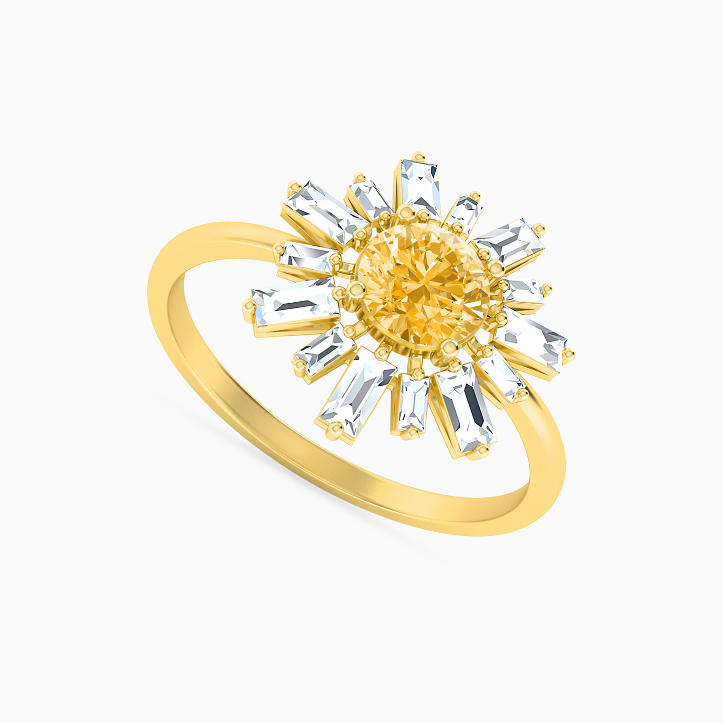 We cannot get over how distinctly charming this ring looks. Resembling a daisy with its baguette cut white stones, it is cast in 18-karat yellow gold and makes a fitting choice with evening wear. We recommend you up the look of this piece with a matching bracelet from our collection.