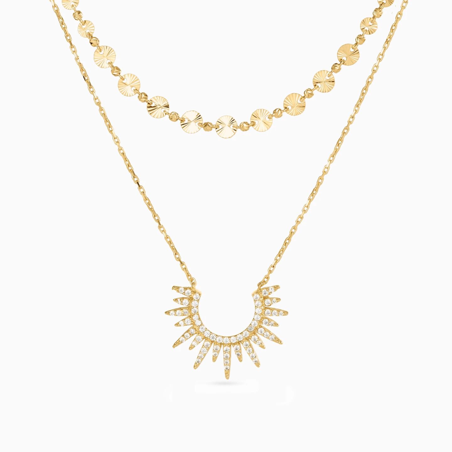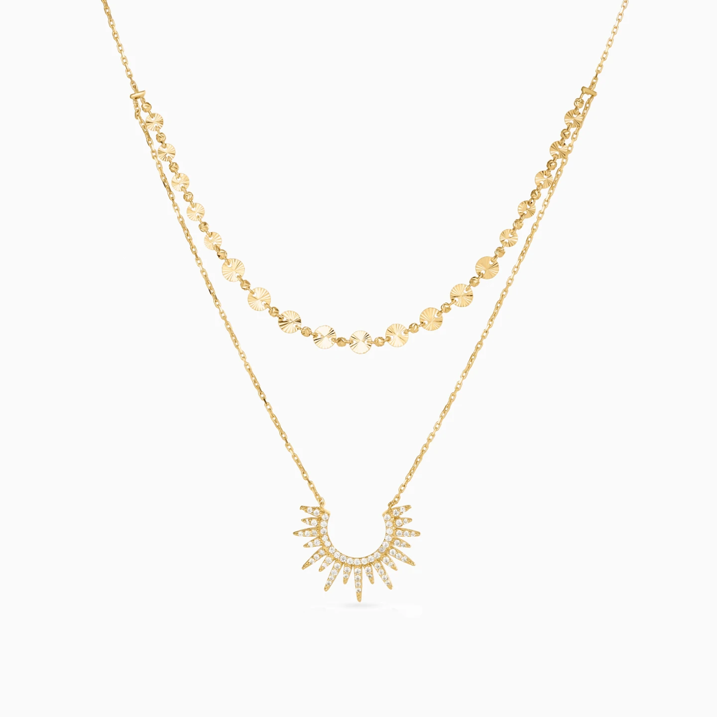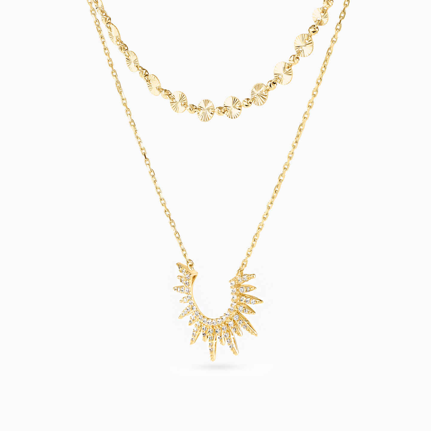 Introducing an 18-karat yellow gold layered chain necklace from L'azurde Gold, a stunning embodiment of timeless elegance and modern allure. The short chain, adorned with lustrous sequins alternating with gleaming gold beads, creates a captivating play of light and texture. The longer dainty chain features a mesmerizing sun-like pendant, its radiant rays adorned with sparkling round-shaped cubic zirconia stones, making this necklace a radiant accessory for any occasion.