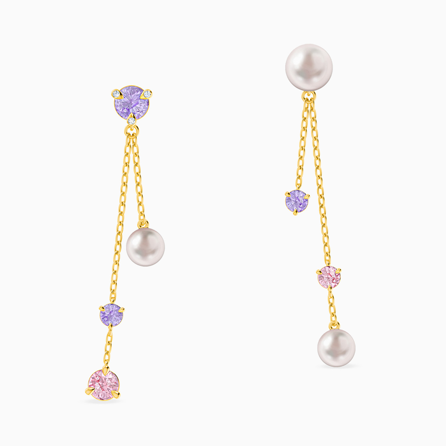 What can be more gratifying than to watch these petite danglers as they rock back and forth. We are in awe of the graceful design that features pearly tops dropping in yellow gold chains to pink and blue stones. A perfect accessory with your evening wear, they will steal the show.
