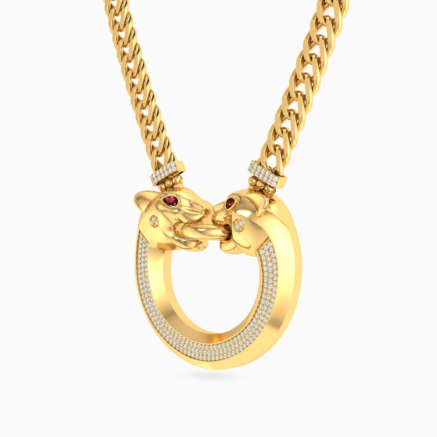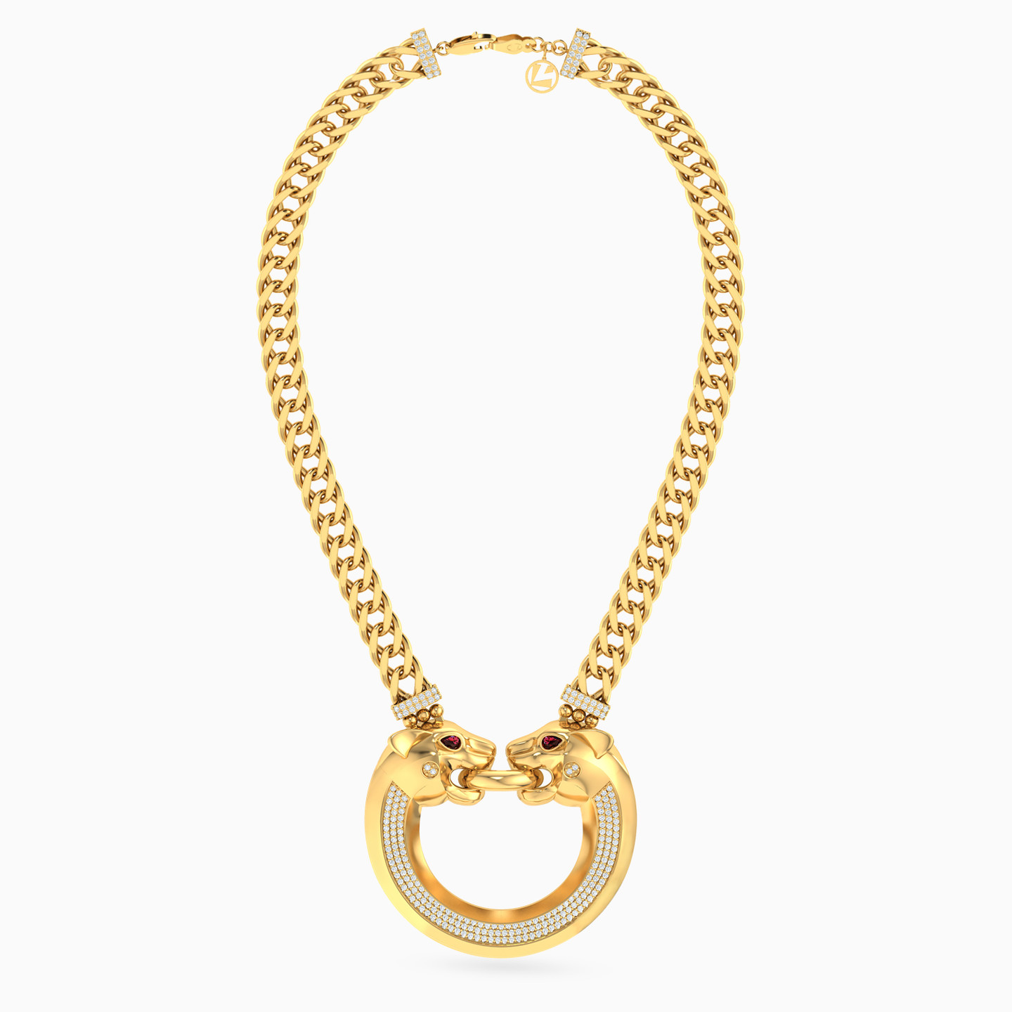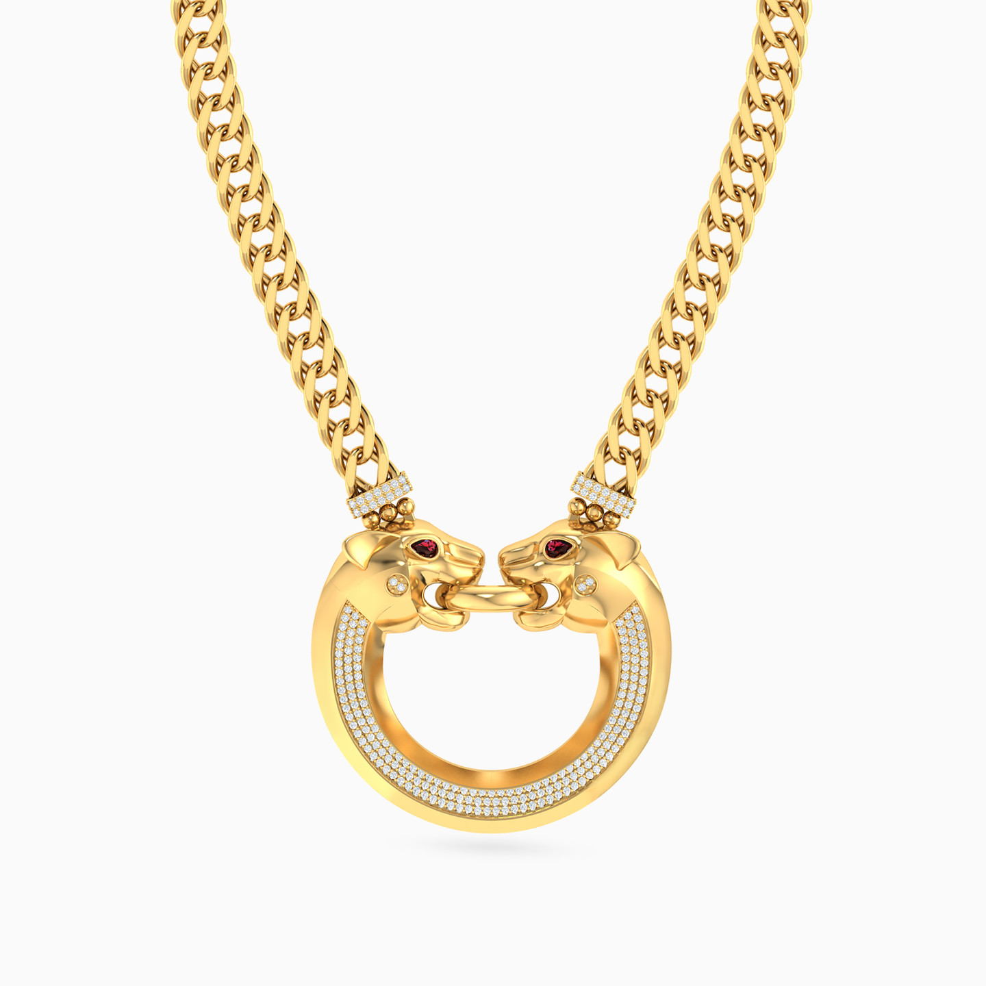 Unleash your wild side with this 18-karat yellow gold pendant necklace from L'azurde Gold, a daring fusion of glamour and fierceness! The bold and chunky links chain commands attention, leading to a show-stopping pendant featuring a wide circular frame embedded with three rows of dazzling cubic zirconia in a channel setting. Adding a touch of untamed elegance, two exquisitely detailed panther heads grace both ends, fiercely tugging at a circular ring in their mouths and their eyes sparkling with ruby-red pear-shaped colored stones. This pendant necklace is here to make you roar with style and sophistication!
