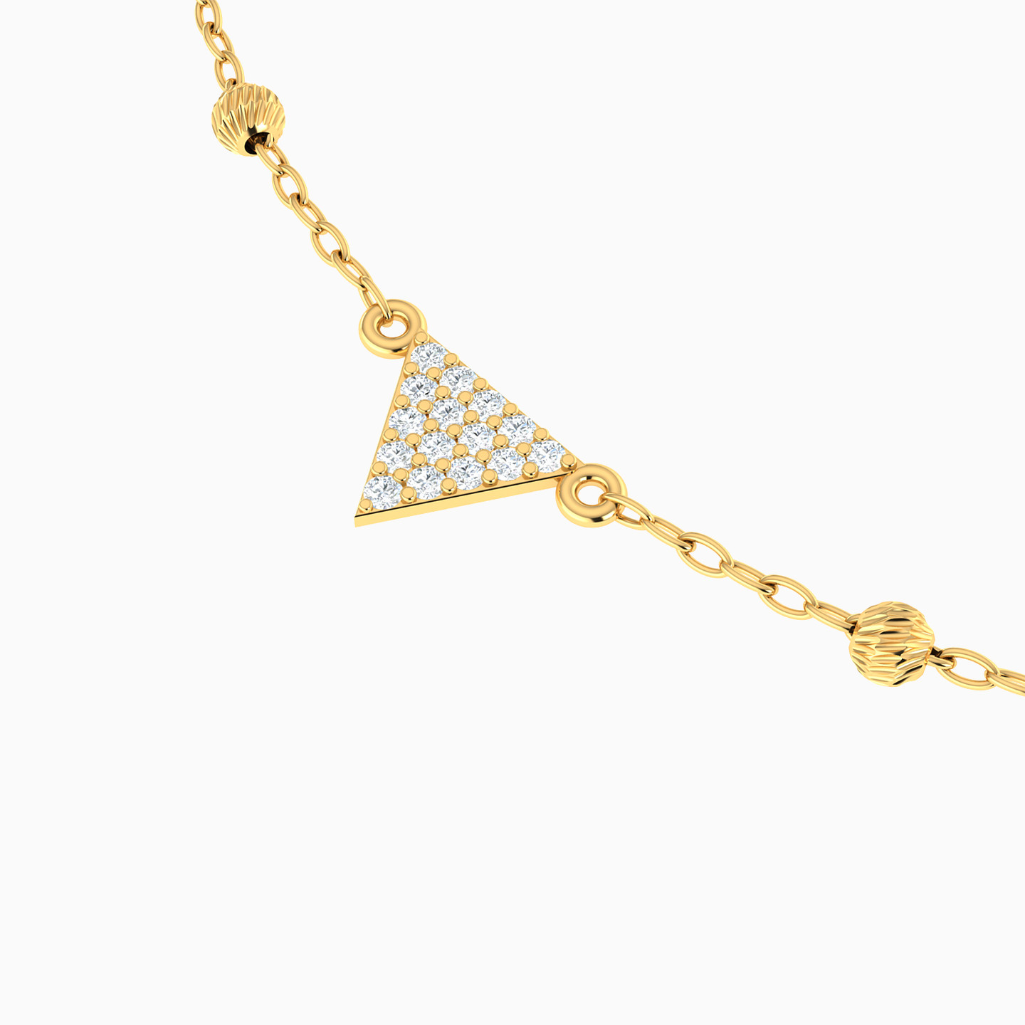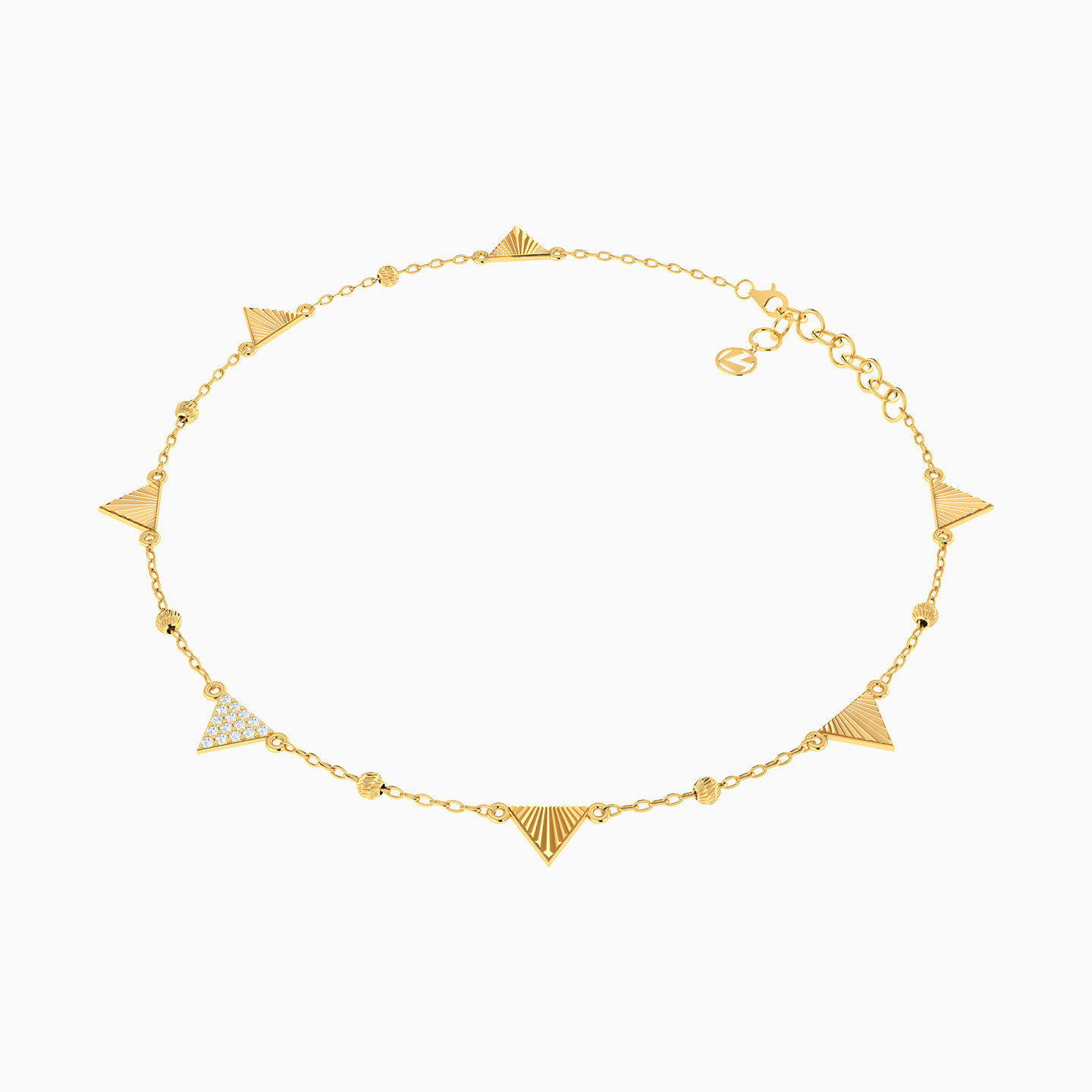 Wrap your wrist in a triangle tango with this 18-karat yellow gold chain bracelet from L'azurde Gold! It features a delightful design of alternating small triangle motifs, each adorned with charming ribbed textures and interspersed with tiny gold beads for that extra touch of flair. The star of the show is the central triangle, stealing the spotlight with a dazzling twist – studded with round cubic zirconia, turning this bracelet into a dance of sophistication and fun for your wrist!