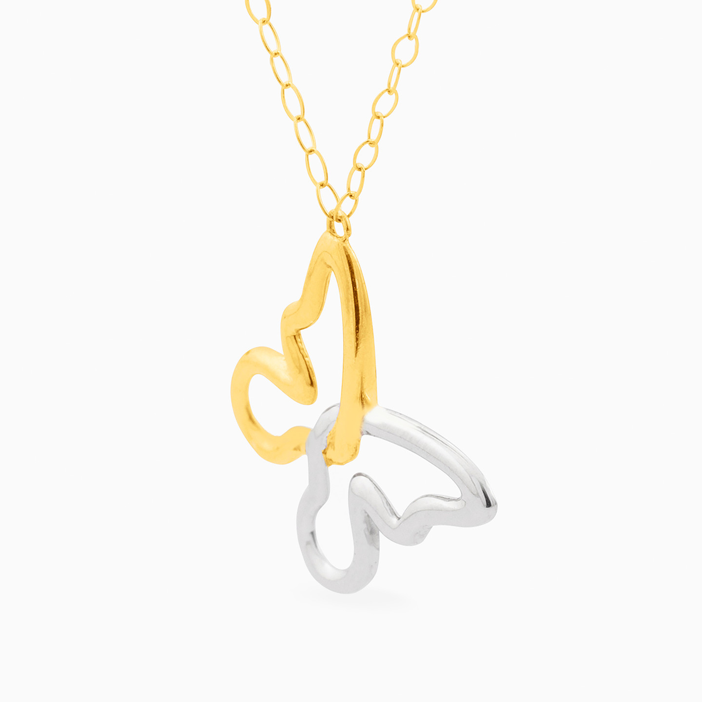 Spread your wings and soar confidently wearing this simply sophisticated butterfly pendant necklace from Miss L’. Two tones of polished 18-karat gold intertwine to create a stunning butterfly pendant that is guaranteed to capture attention. This is the ideal accessory for special occasions and is equally perfect for every day.