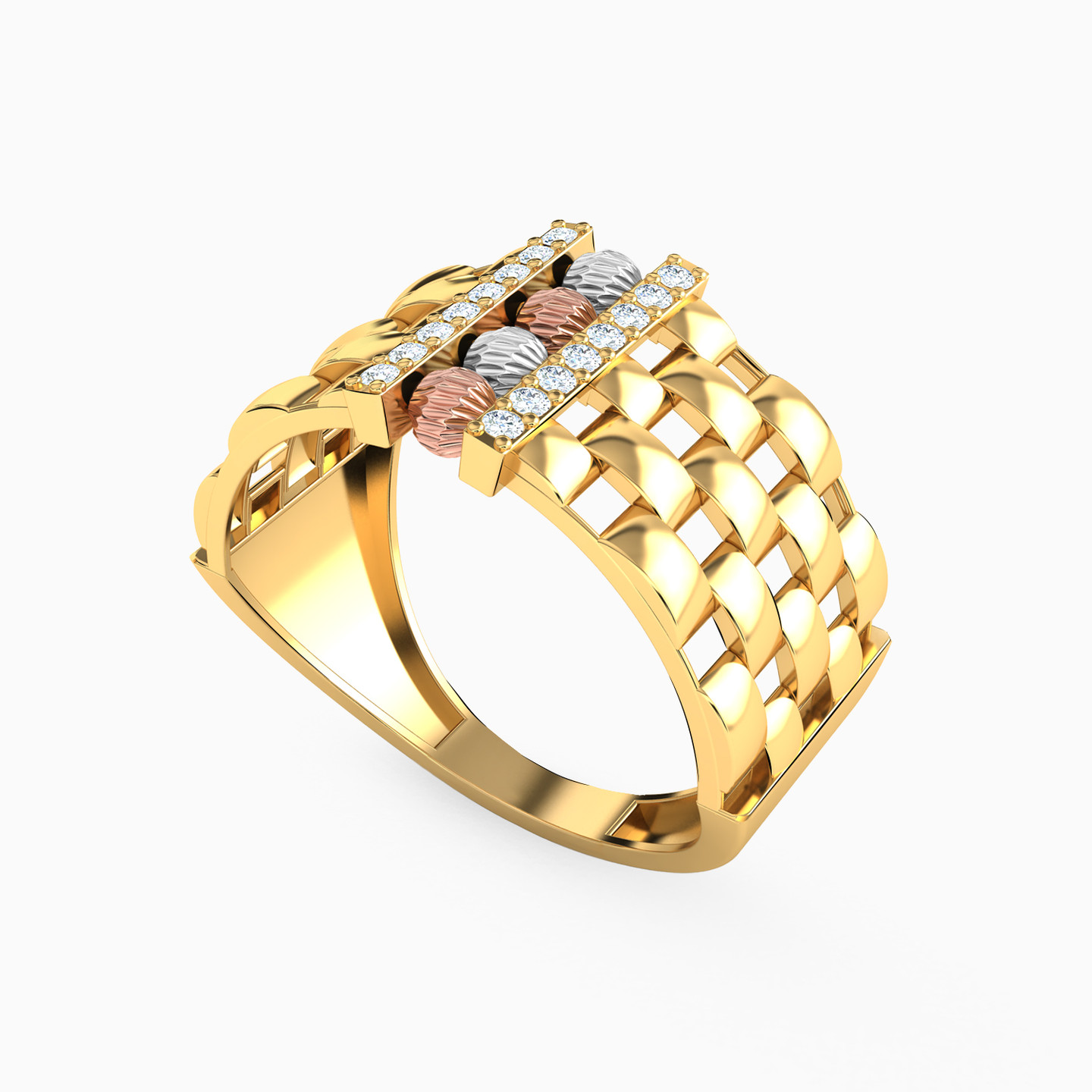 Step up donning the ultimate sophistication with this ring from L'azurde Gold. Crafted with links on the broad band in 21-karat yellow gold, this number is enhanced with rose and white gold beads to the center and a slim line of zirconia that accentuates the beads. Keep this as your go-to for the next time you want to spill some style.
