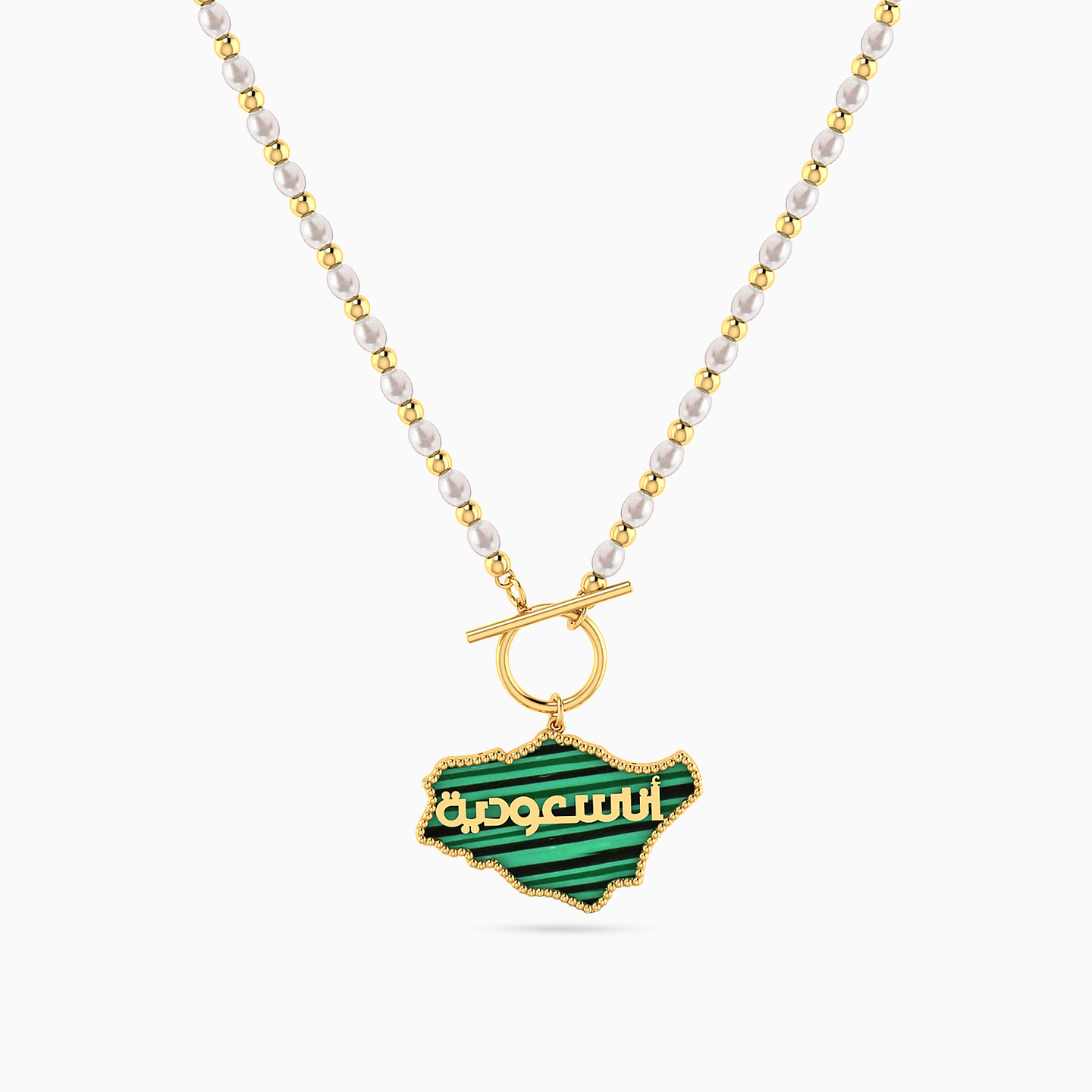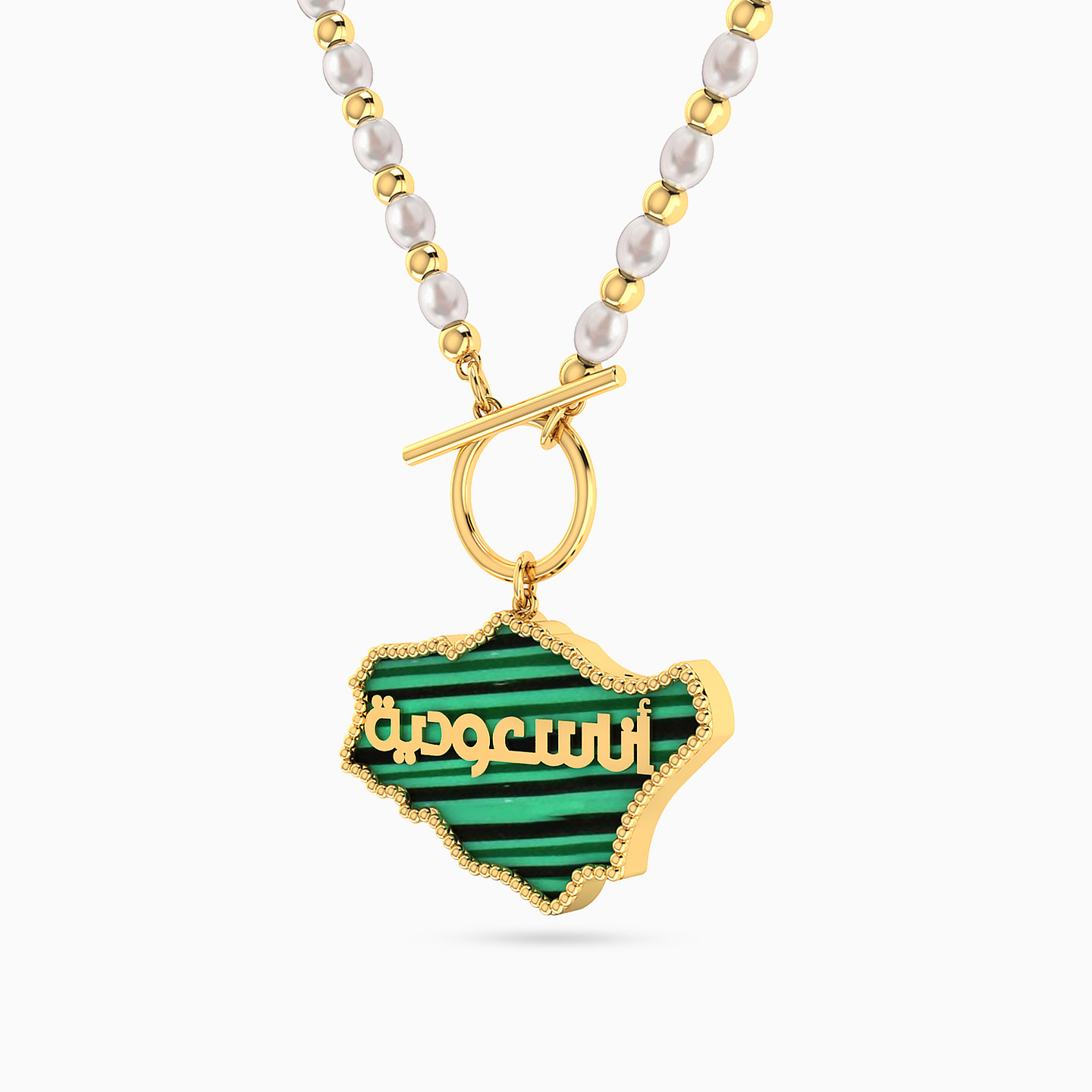 A tribute to heritage in a modern touch. This Lazurde Gold lariat necklace features a golden chain beaded with pearls, dazzled with a striking green stone pendant shaped like the map of Saudi Arabia, highlighted with delicate "Ana Saudeya" Arabic calligraphy. A meaningful piece that celebrates identity and makes a thoughtful gift of pride and belonging.