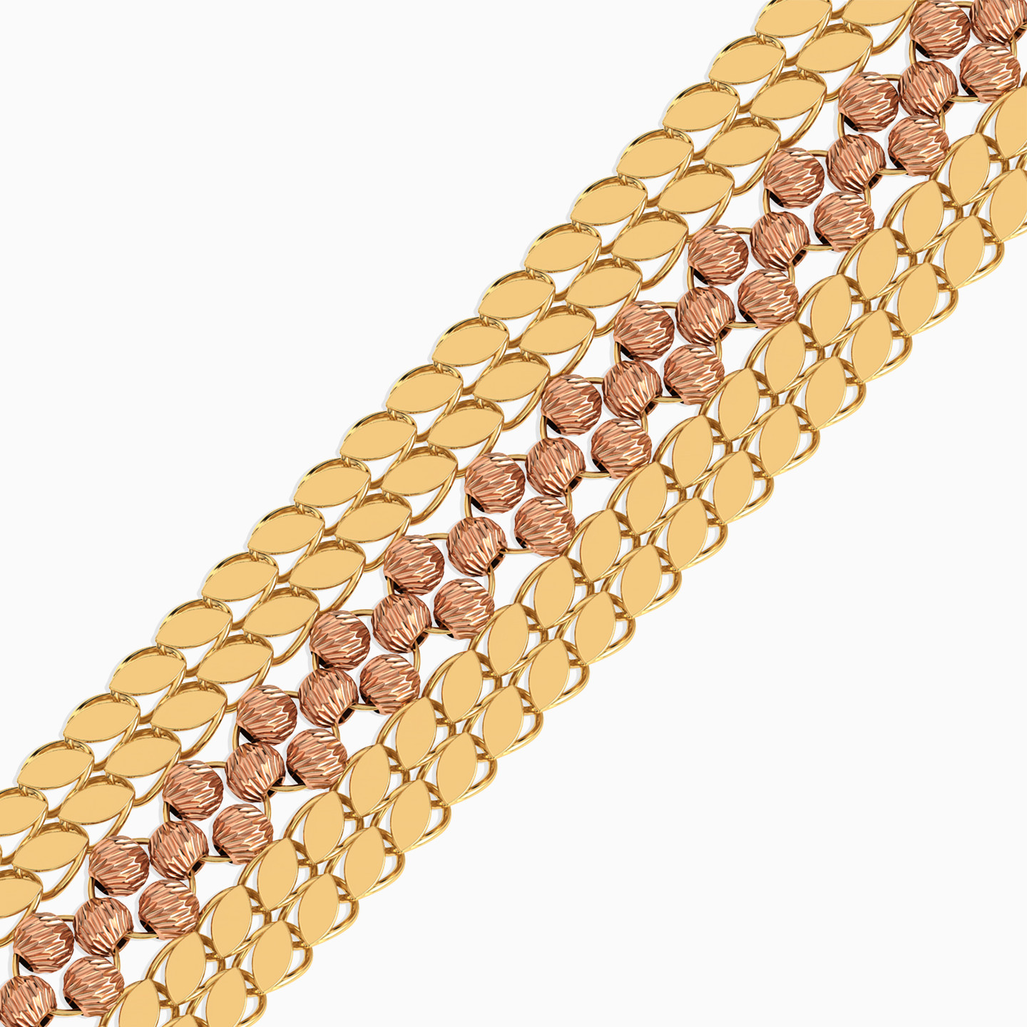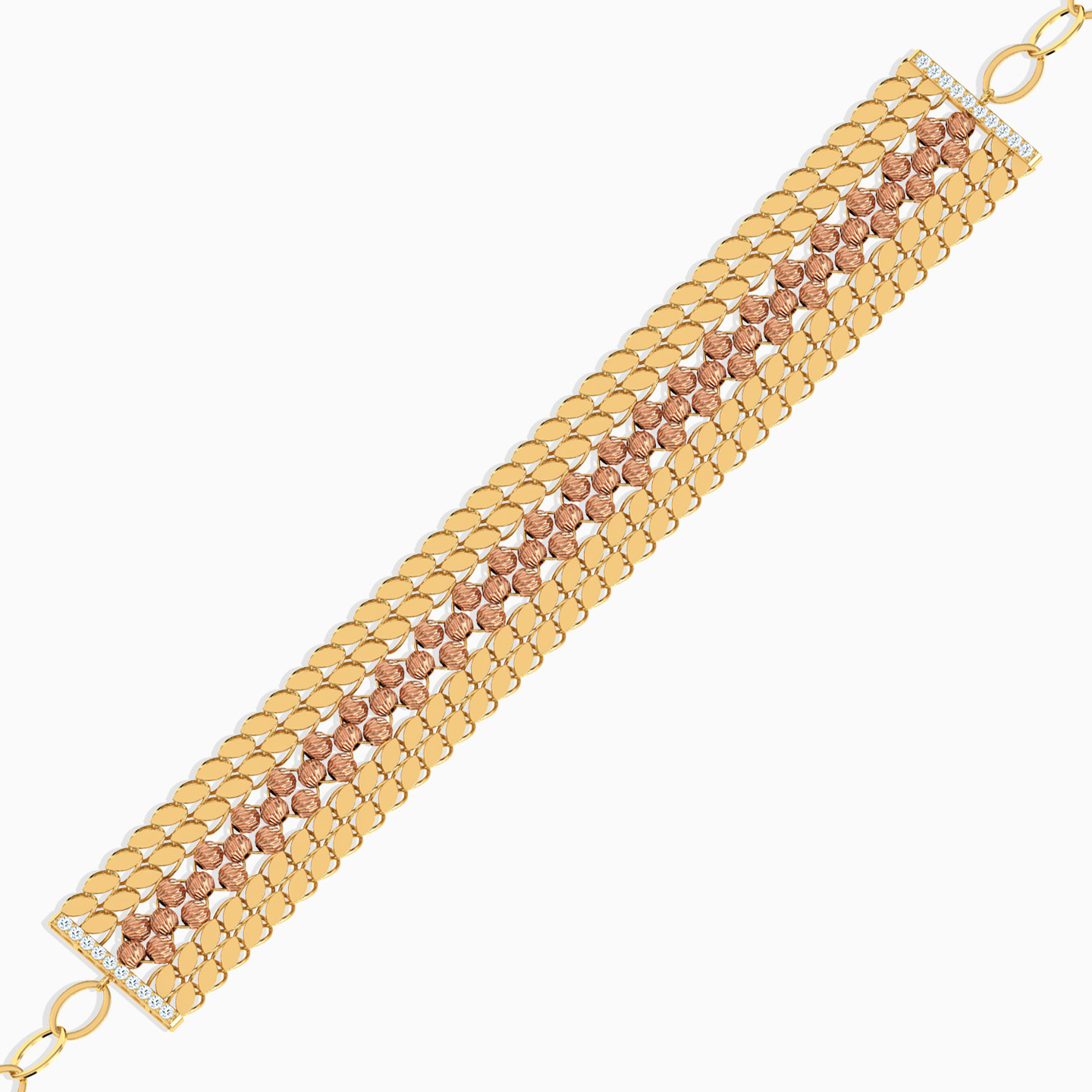 Get ready to dazzle with this gleaming 21-karat gold bracelet from L’azurde Gold. This stunning bracelet adds elegance and luxury to any ensemble. Gorgeous rose gold beads grace the center of this divine bracelet with bands of yellow gold discs and shimmering cubic zirconia completing the look. You’ll love how this chic accessory will always make an impression wherever you go.