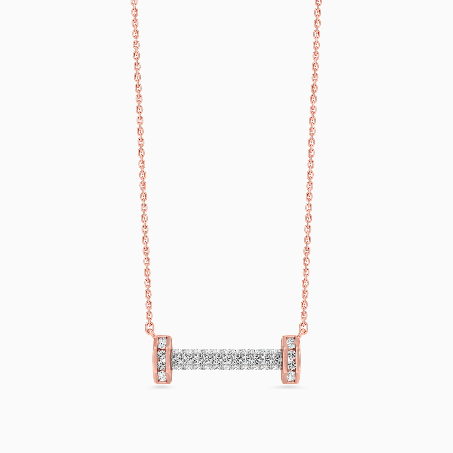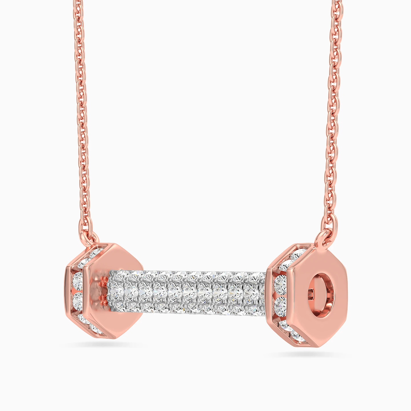 Show off your quirky and playful side with this 18-karat rose gold pendant necklace from the L'azurde Diamonds! The classic links chain elegantly cradles a horizontal bolt pendant, meticulously studded with brilliant cut diamonds on all sides, ensuring you shine from every angle. And just when you thought it couldn't get any more fabulous, two nuts on each end bring a touch of whimsy, adorned with their own dazzling brilliance. This necklace is one unique sparkling party for your neckline!