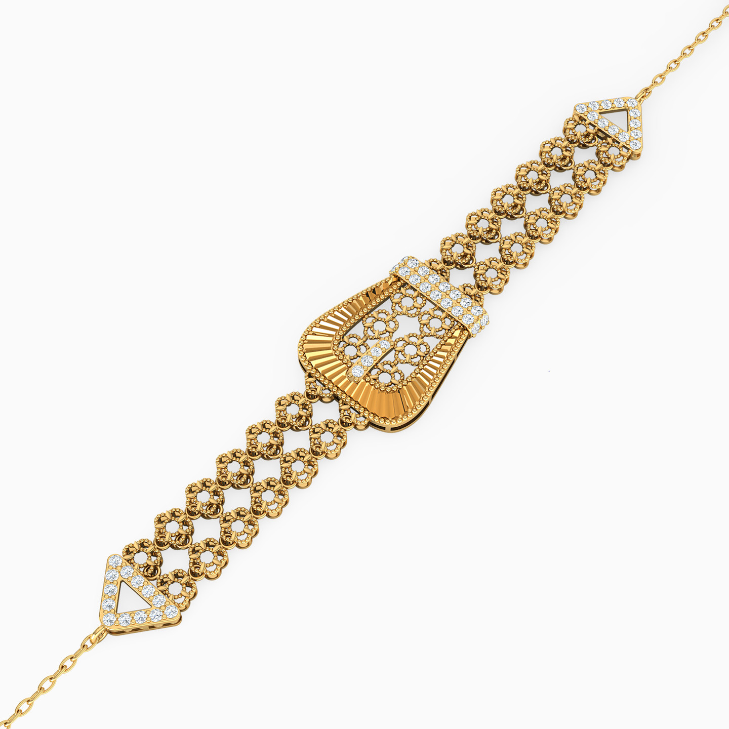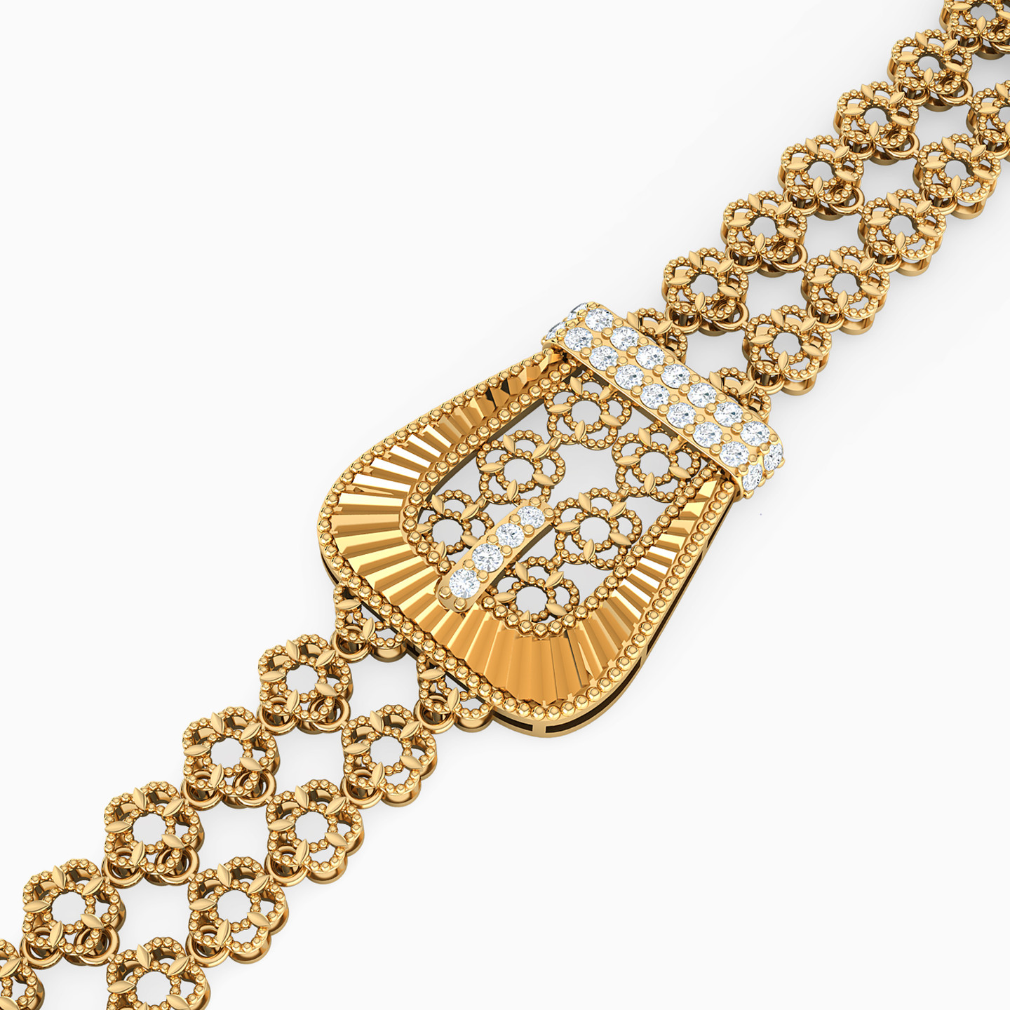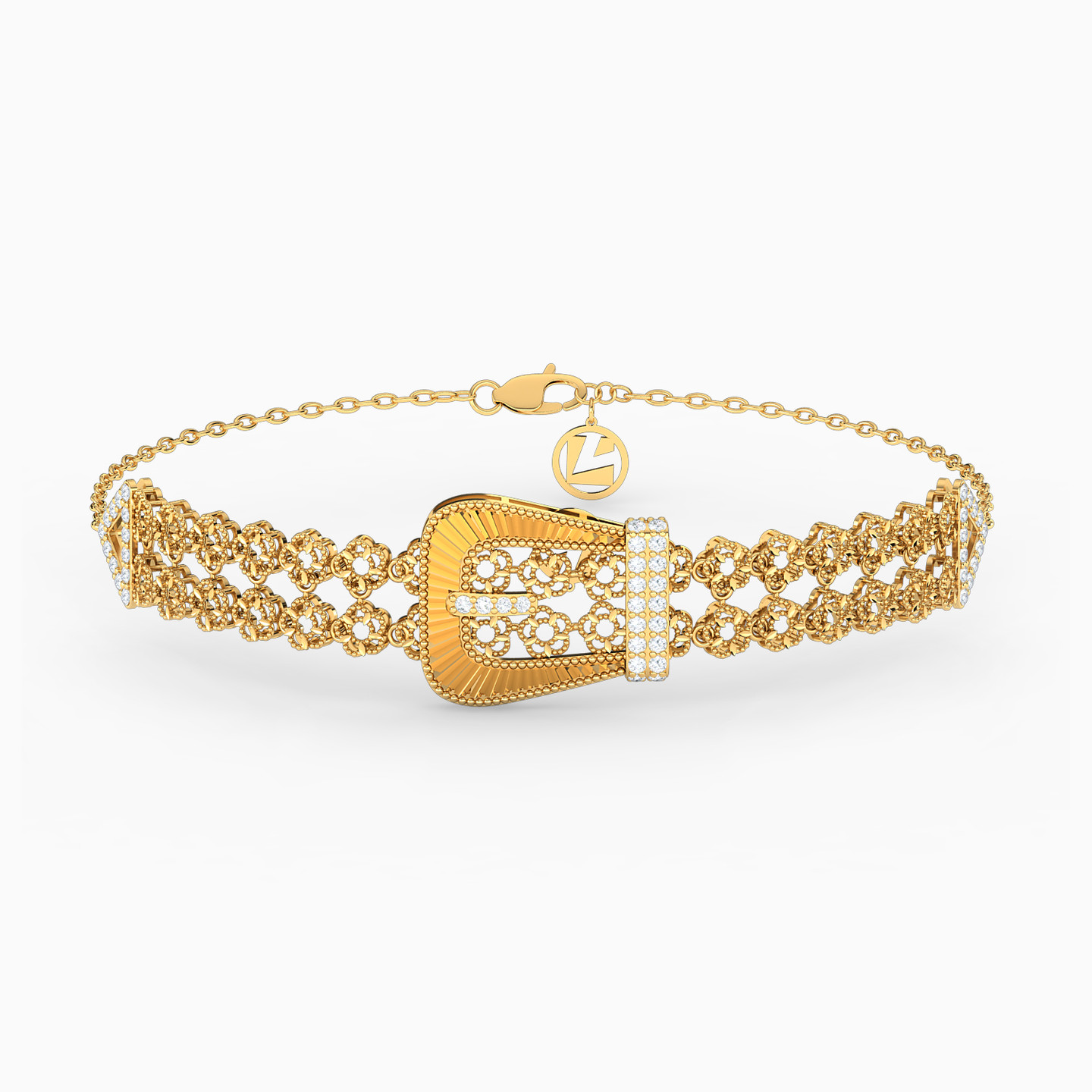 A beautifully detailed “buckle” decorates this head-turning bracelet from L’azurde Gold. Elegantly comprised of two rows of pretty 21-karat yellow gold flowers, accented with sparkling cubic zirconia, this stunning bracelet is a real show-stopper no matter where you go. It’s the perfect accessory to wear solo to showcase your femininity.
