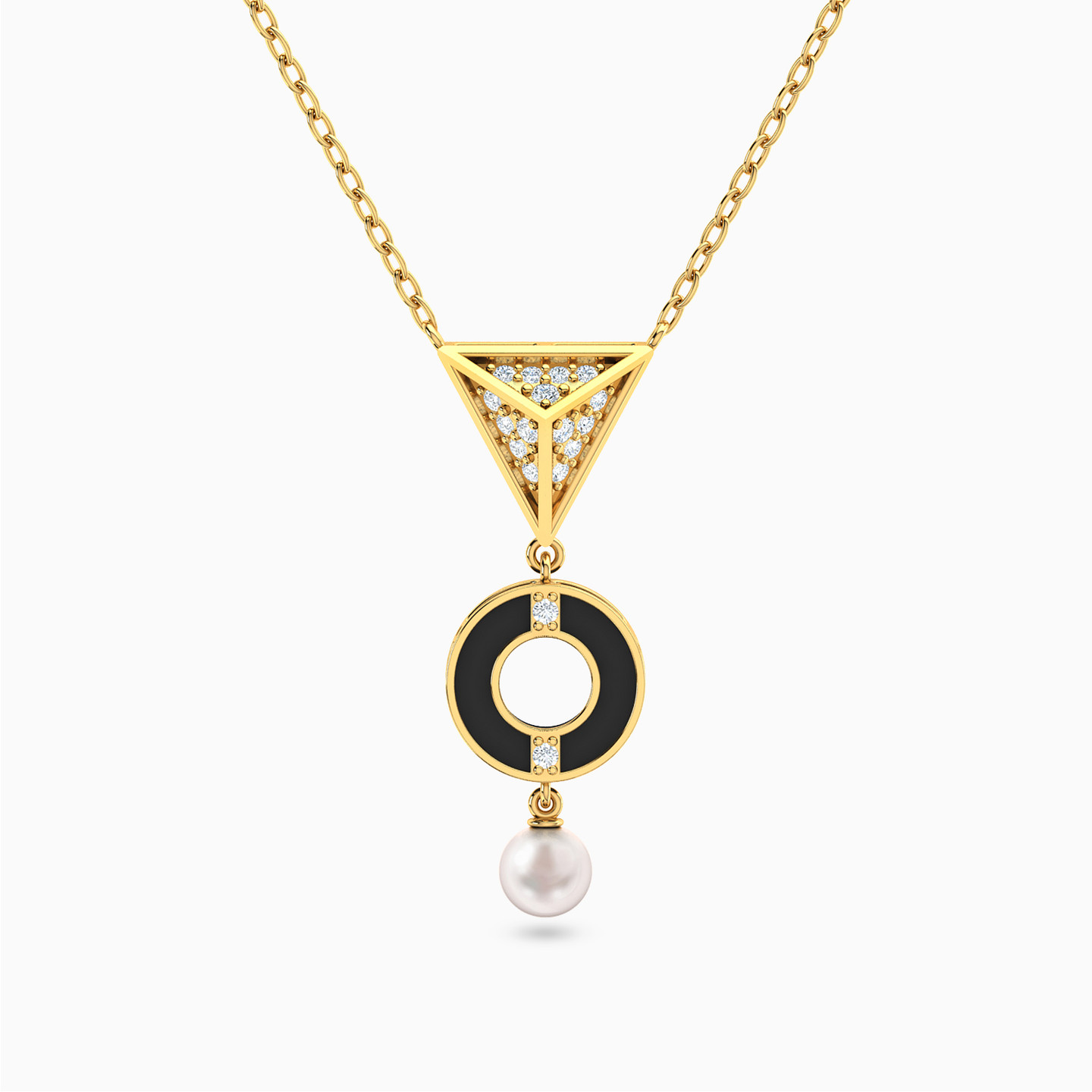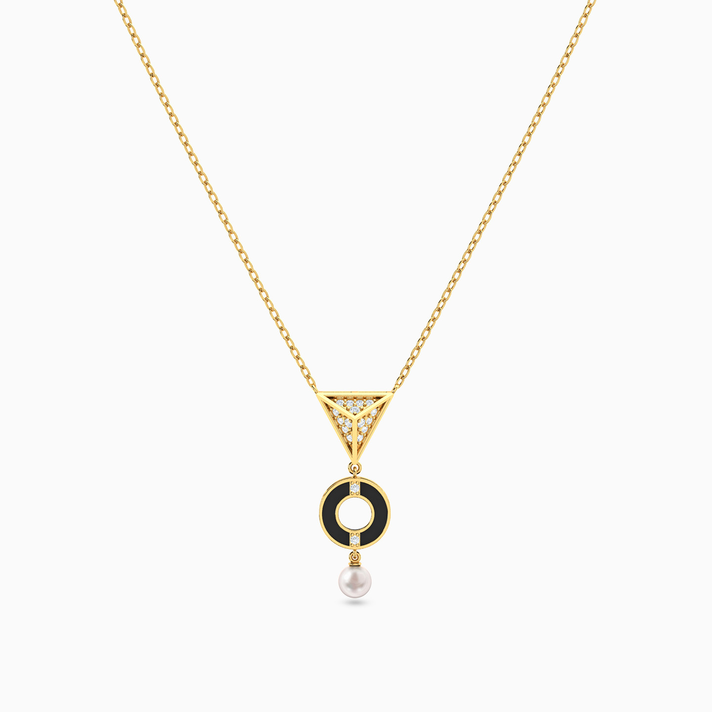 Matching tradition with trends, this necklace from L'azurde Instyle is a vibe. Crafted in 18-karat yellow gold and suspended from a dainty chain, the pendant captures an Arabesque vibe with its stone studded triangle and circle motifs and pearl drop detail. Wear it over your day to evening outfit with petite pearl ear studs to complete the look.