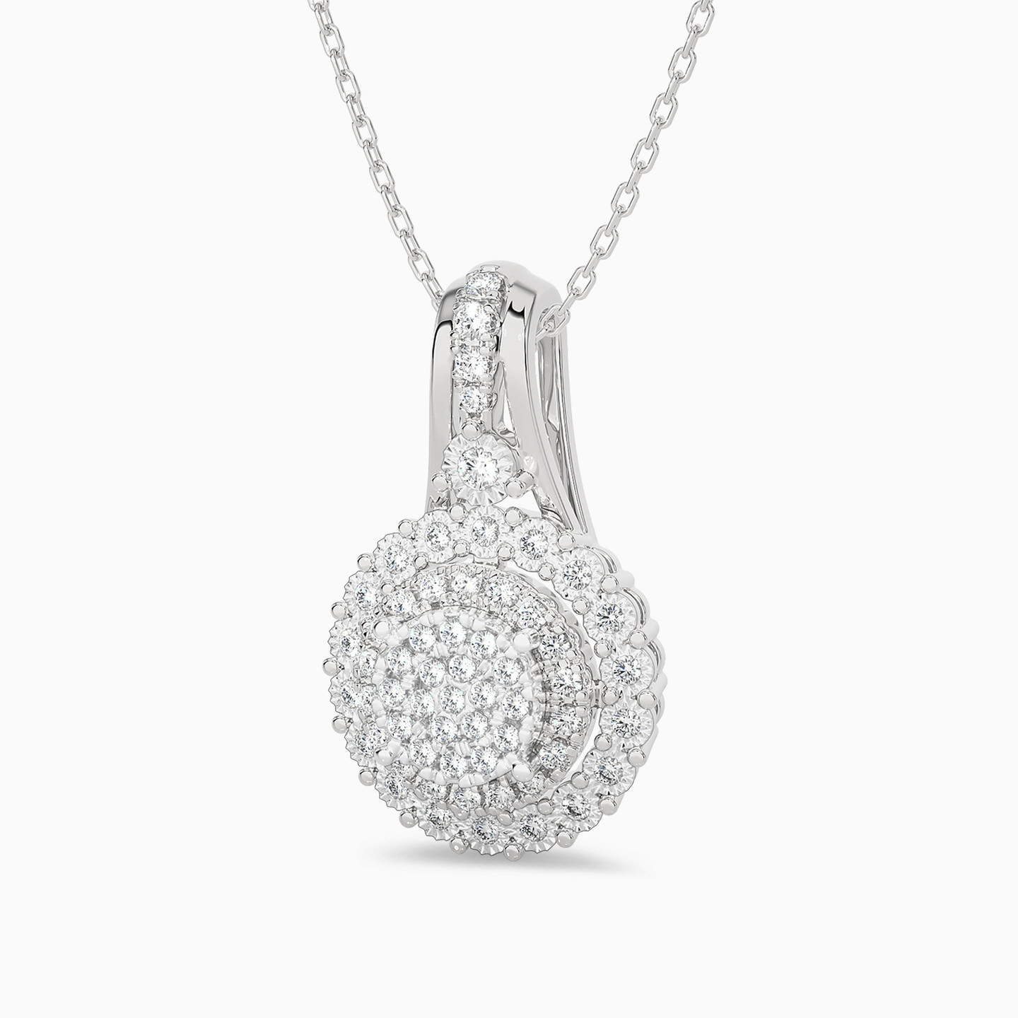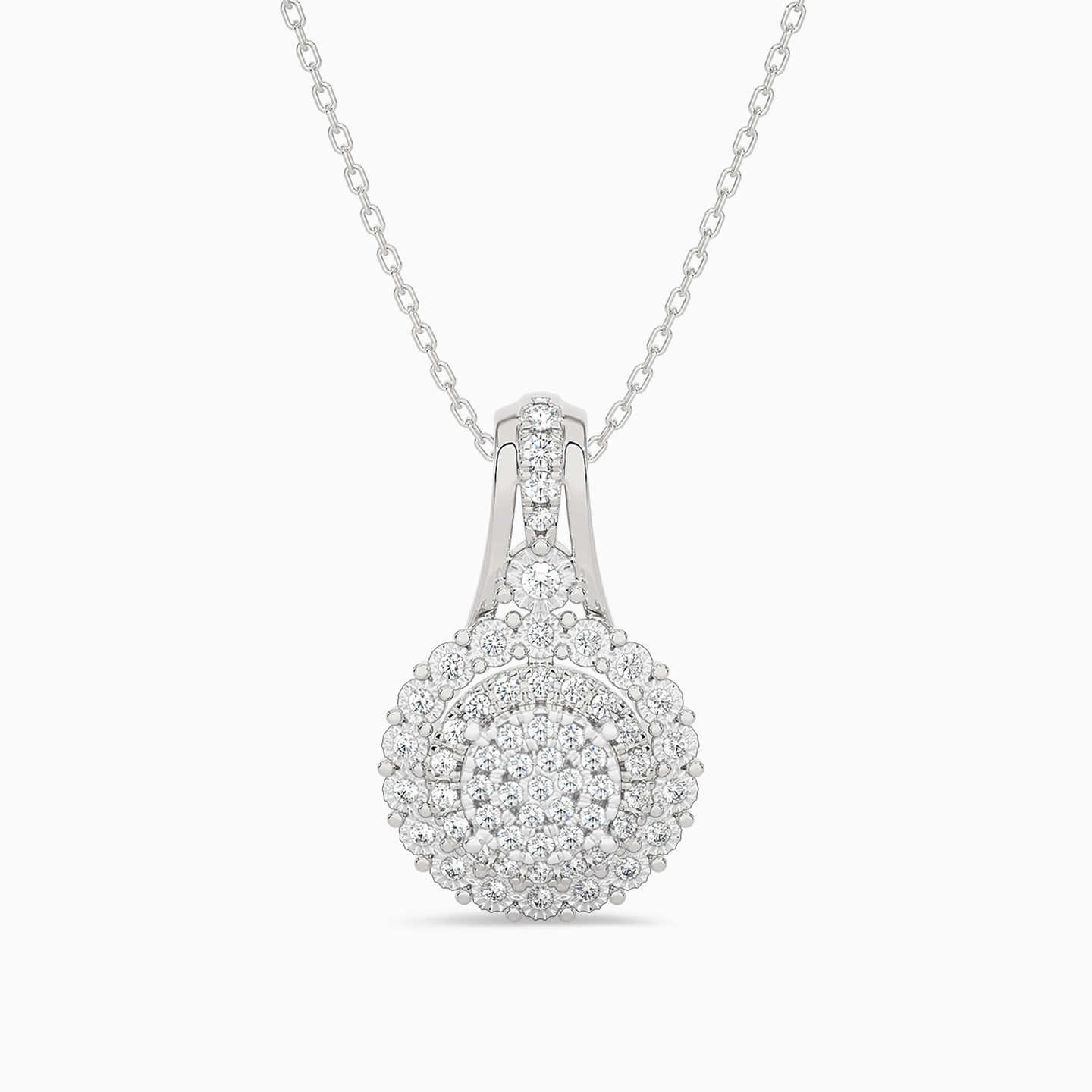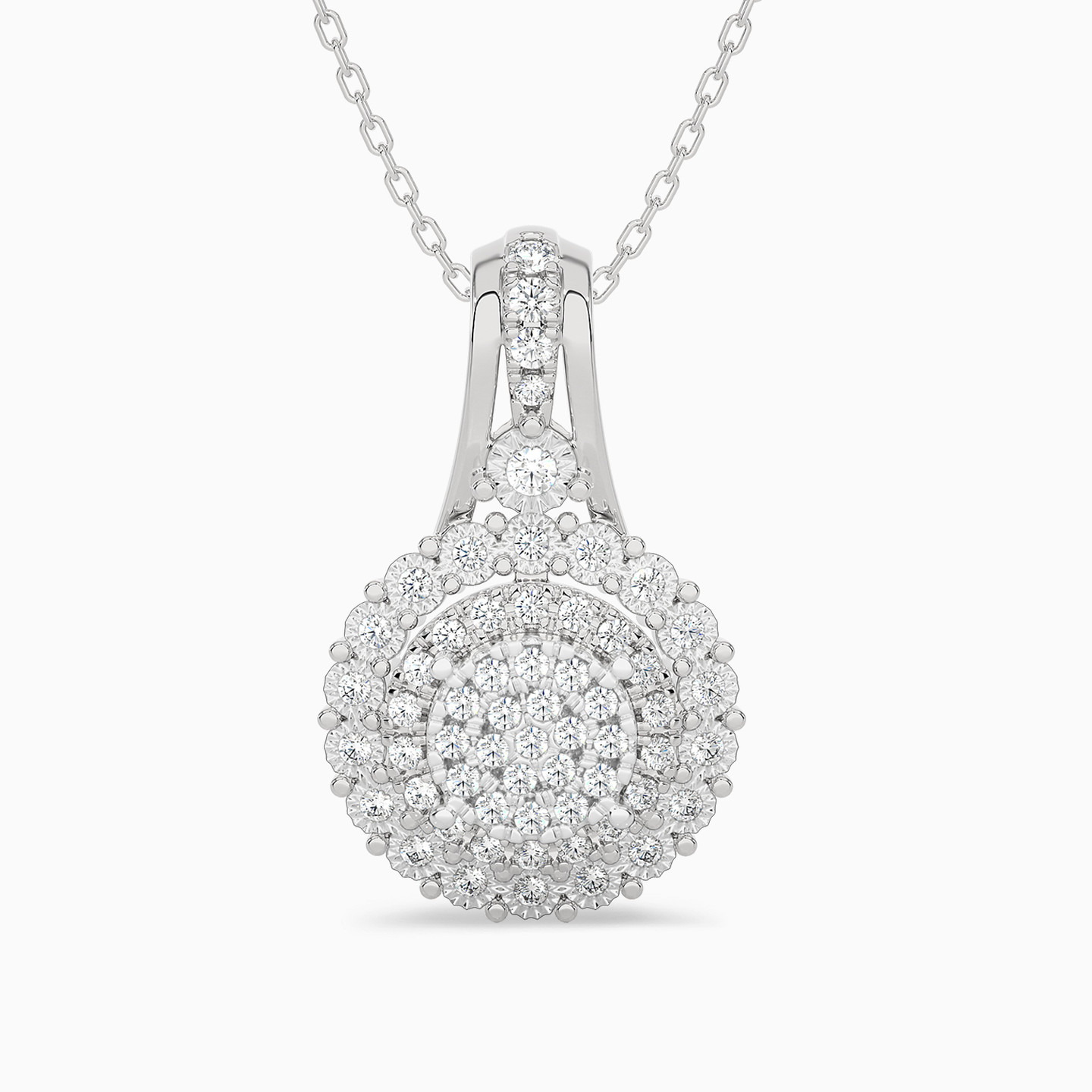 An 18-karat white gold pendant necklace from L'azurde Diamonds showcasing radiance and style in the finest way possible. It features a captivating pendant made of a central circular motif adorned with prong-set 0.22-carat brilliant cut diamonds, elegantly encircled by two layers of shimmering brilliance. Completing the enchanting design is a diamond-studded loop that further enhances the pendant's stunning sparkle, making this necklace. The fine artistry and attention to detail make this pendant necklace a true masterpiece.