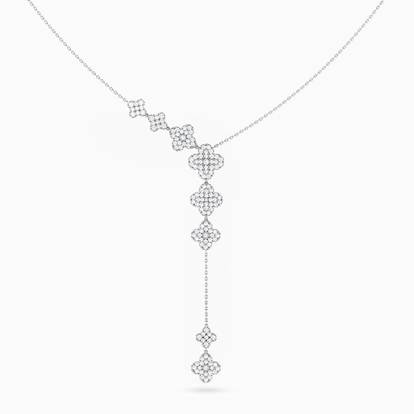 Indulge in the enchanting beauty of this 18-karat white gold lariat drop necklace from L'azurde Diamonds, a masterpiece that captures elegance and allure. The classic chain leads to a stunning display of ascending floral motifs, each adorned with 0.84-carat brilliant cut diamonds, creating a captivating cascade that mirrors the beauty of blooming flowers. The necklace gracefully transitions into a Y-shaped chain, drawing the eye downward to two tiny diamond-studded floral motifs that delicately complete this mesmerizing piece. Wear this necklace on days when you want something special.