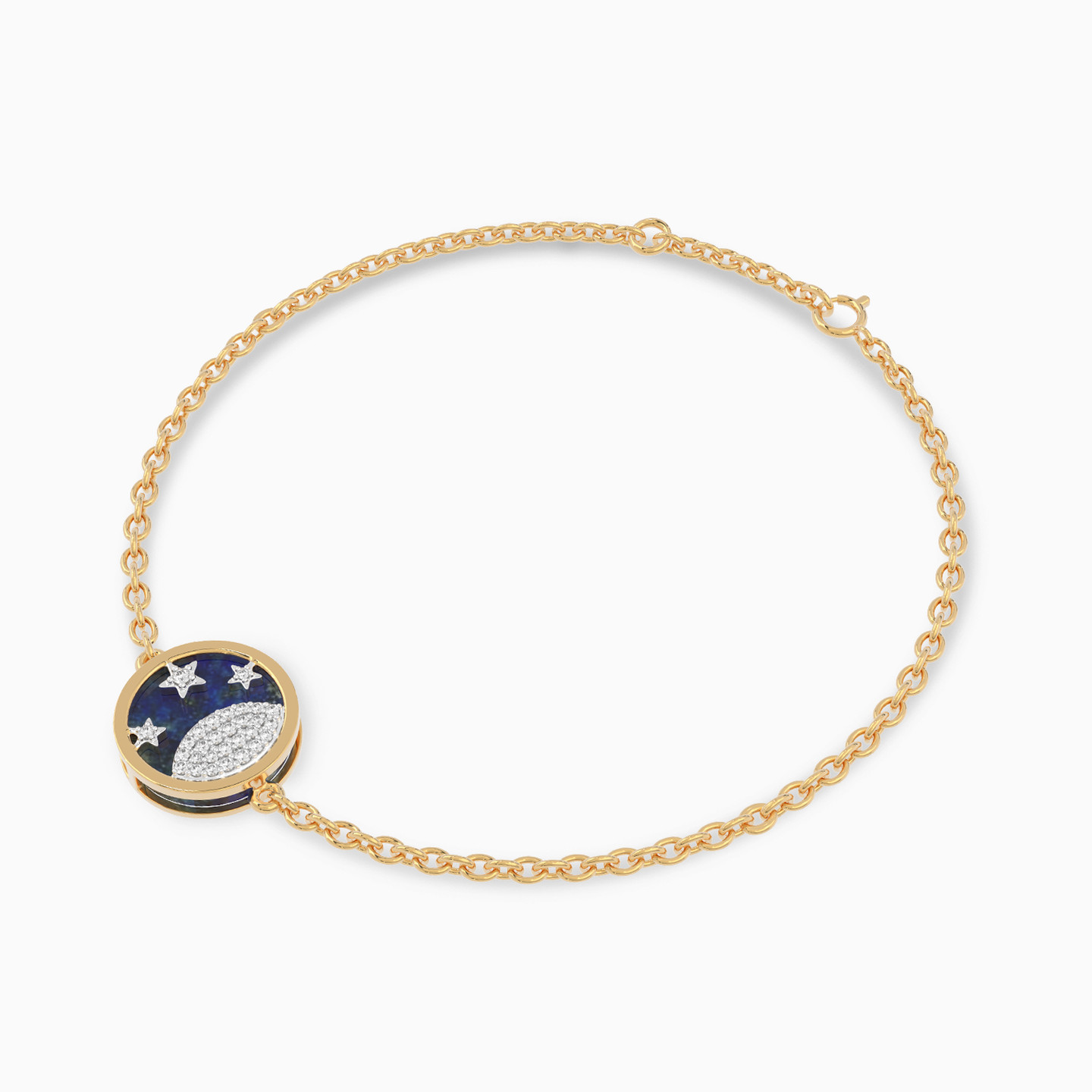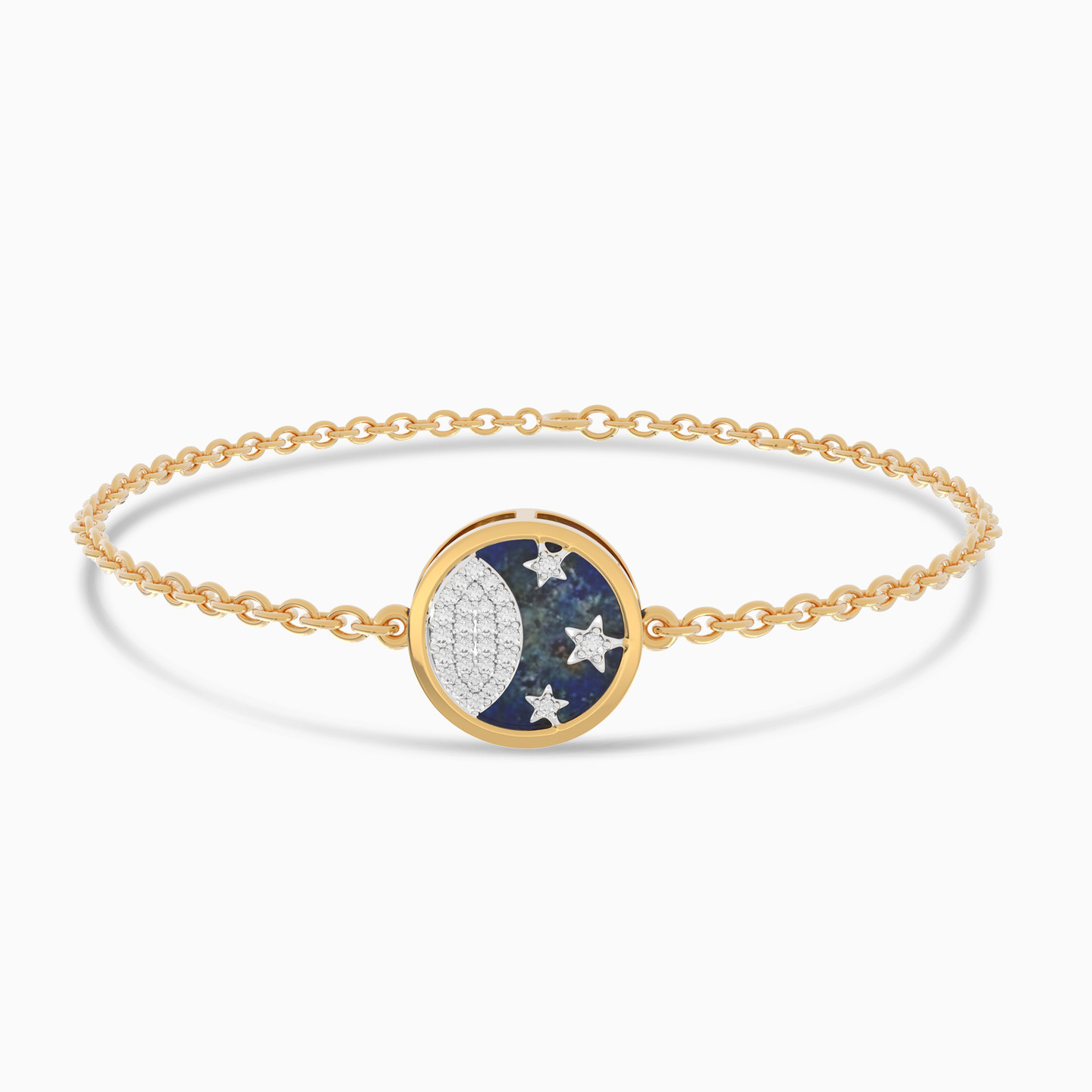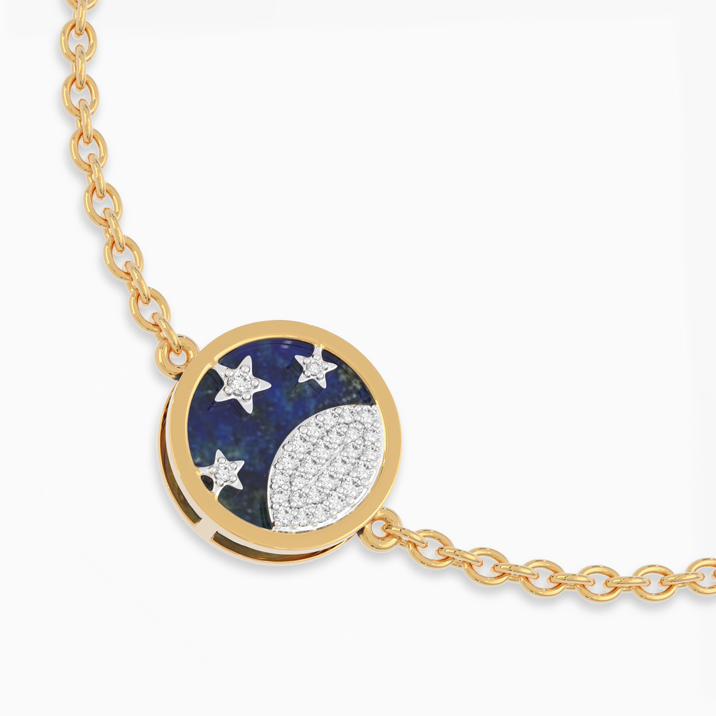Elevate your look to luxury with this shiny piece from Lazurde Diamonds! This exquisite 18K yellow gold chain bracelet features a captivating round pendant with a crescent-shaped blue stone, gracefully adorned with sparkling diamond-studded stars. Designed to capture the brilliance of the night sky, this minimal yet celestial-inspired piece adds a touch of elegance and mystique to any look. Whether worn alone or layered, this bracelet is a timeless expression of beauty and sophistication.