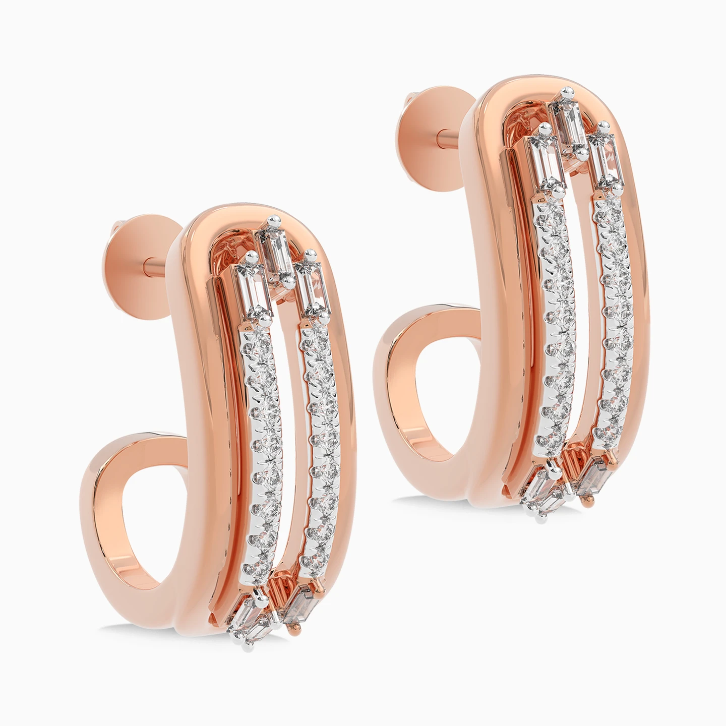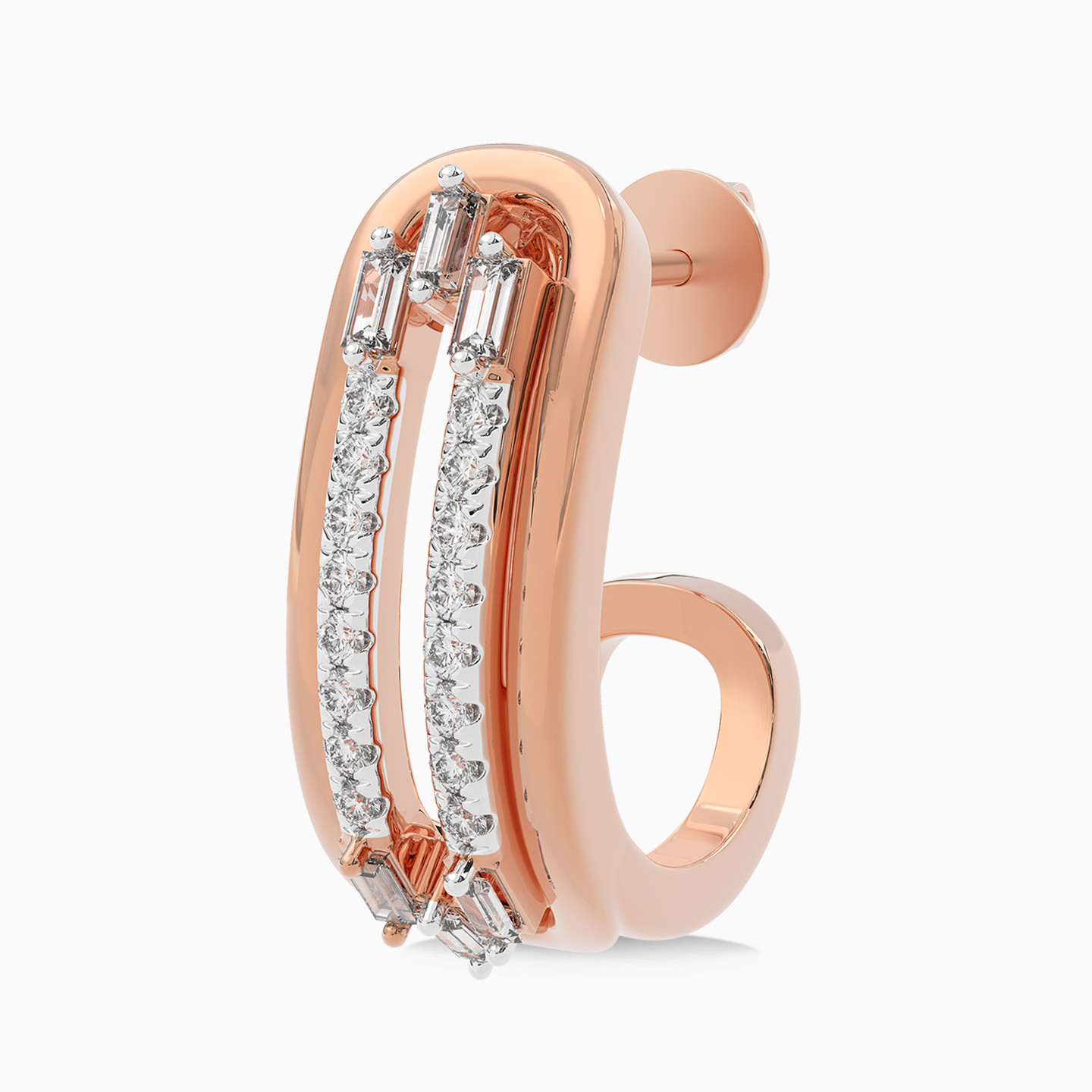 Bold and intricate, these 18k rose gold earrings are designed in a unique curved shape adorned with diamond accents, creating a stunning interplay of light and form. The modern, open design exudes sophistication, making them a perfect choice for those who embrace contemporary elegance.