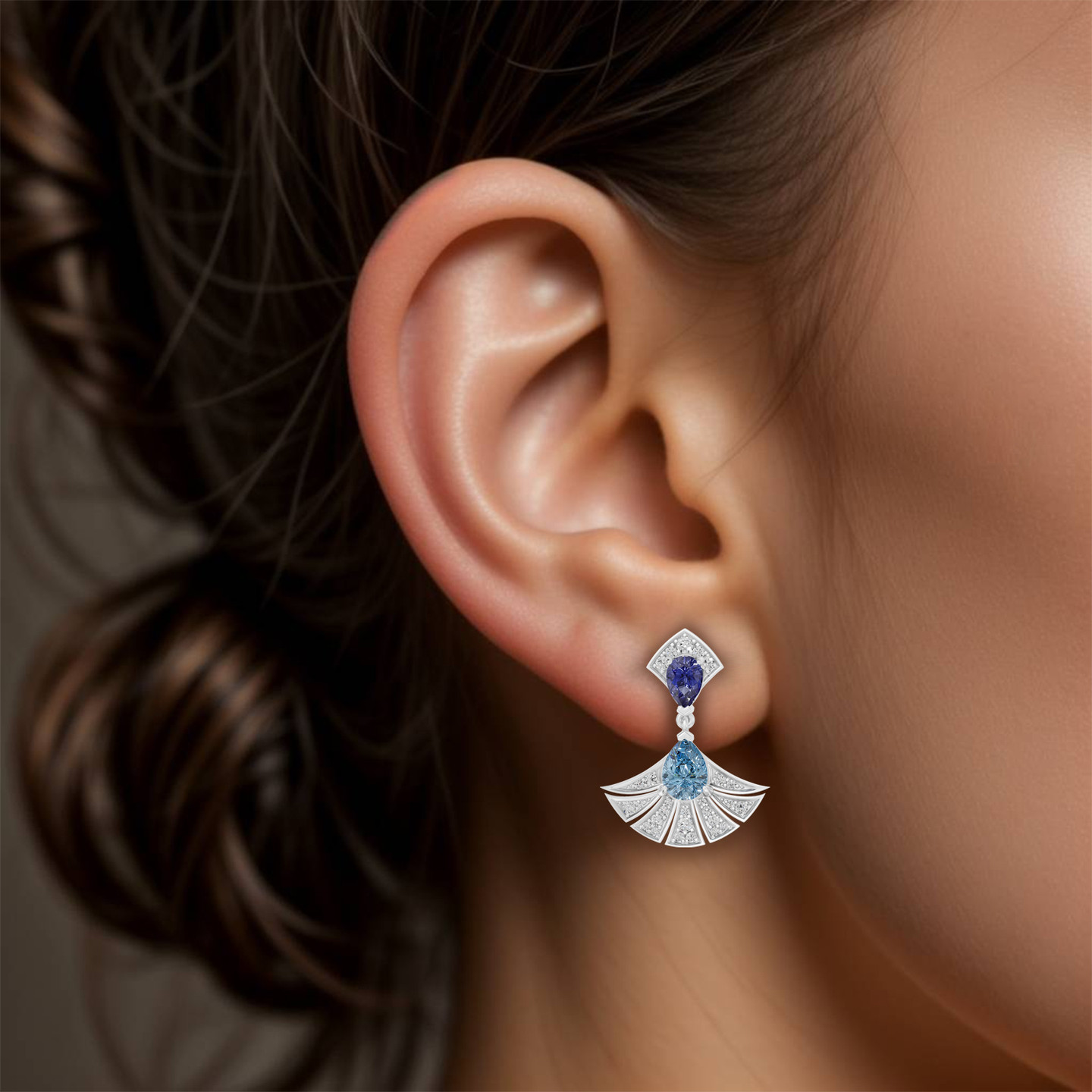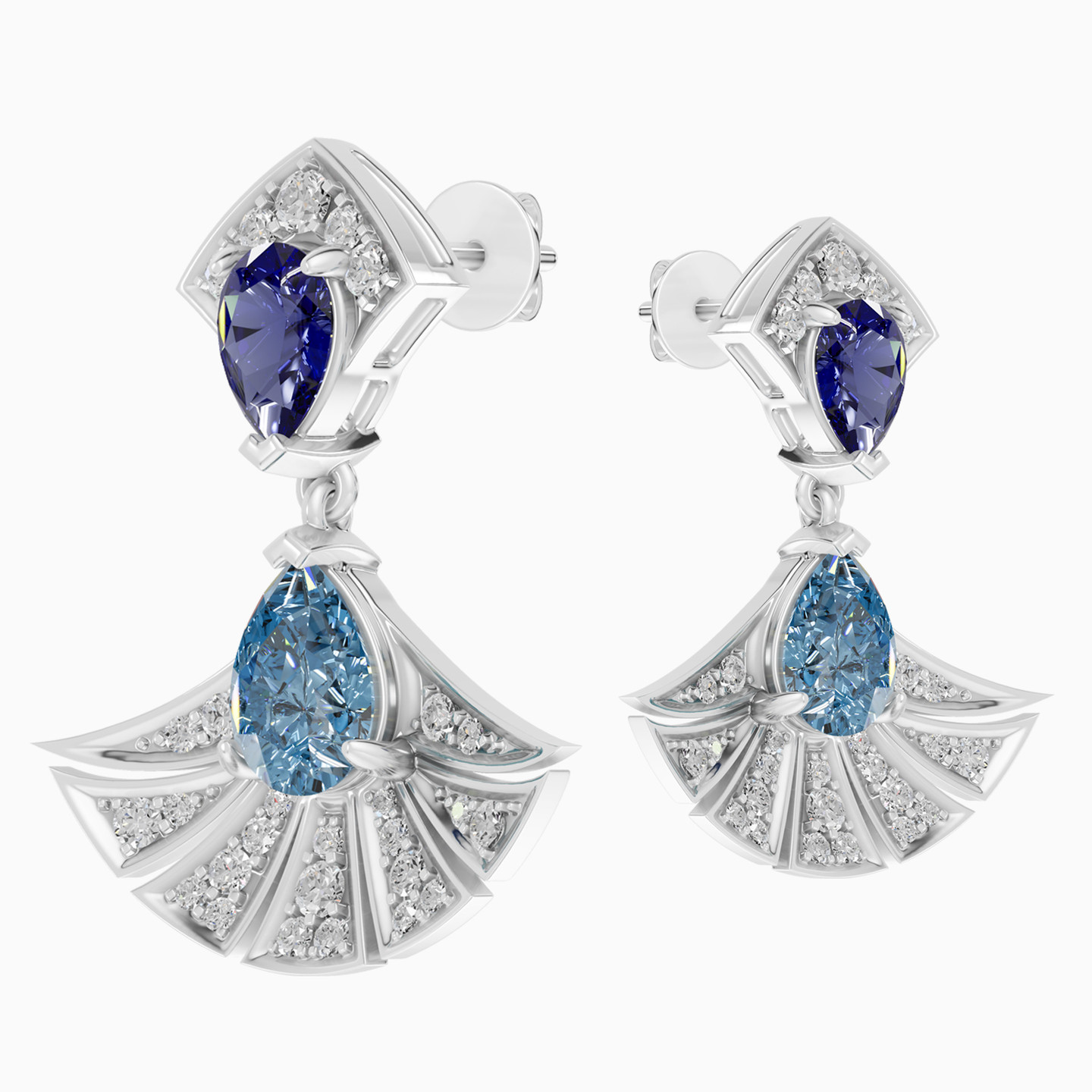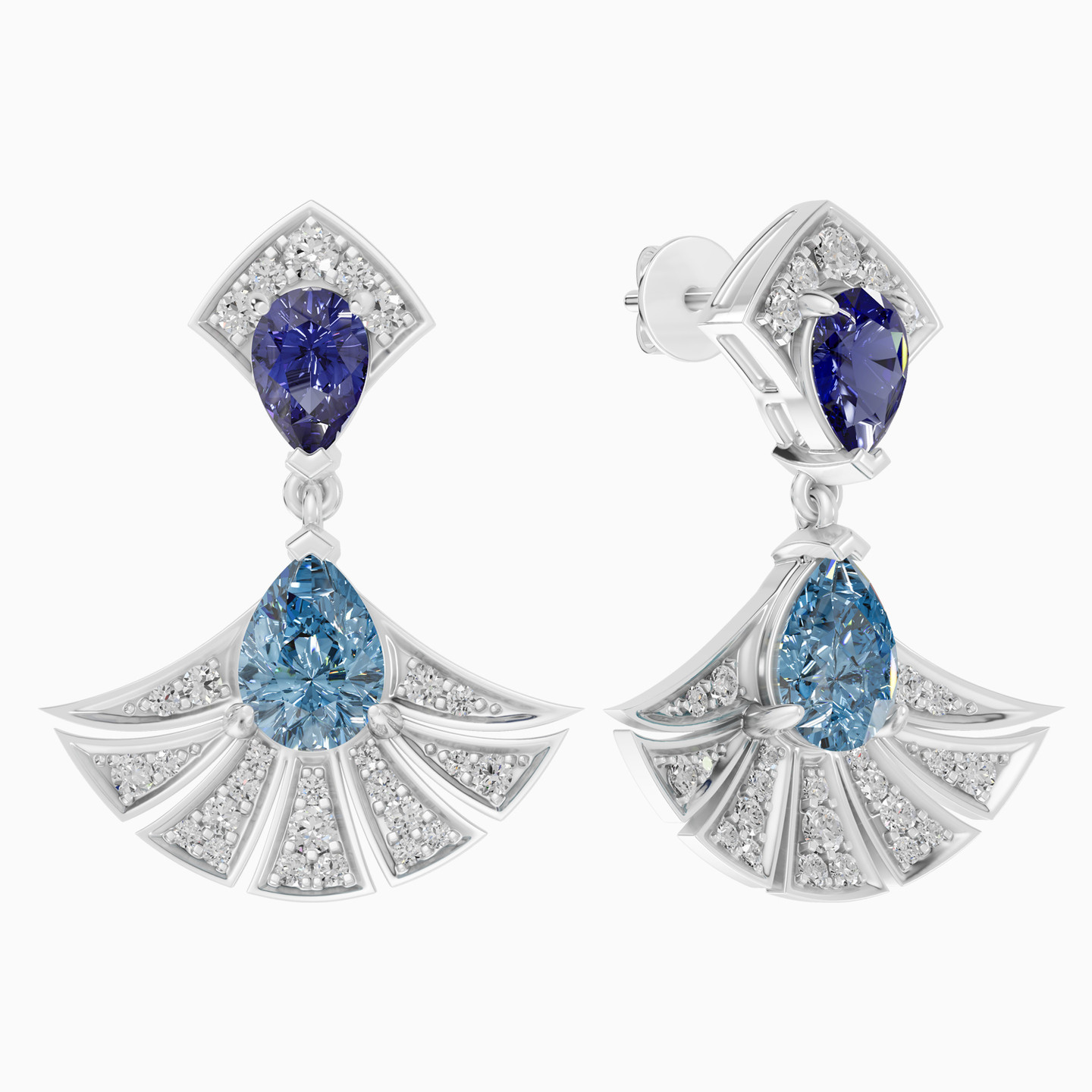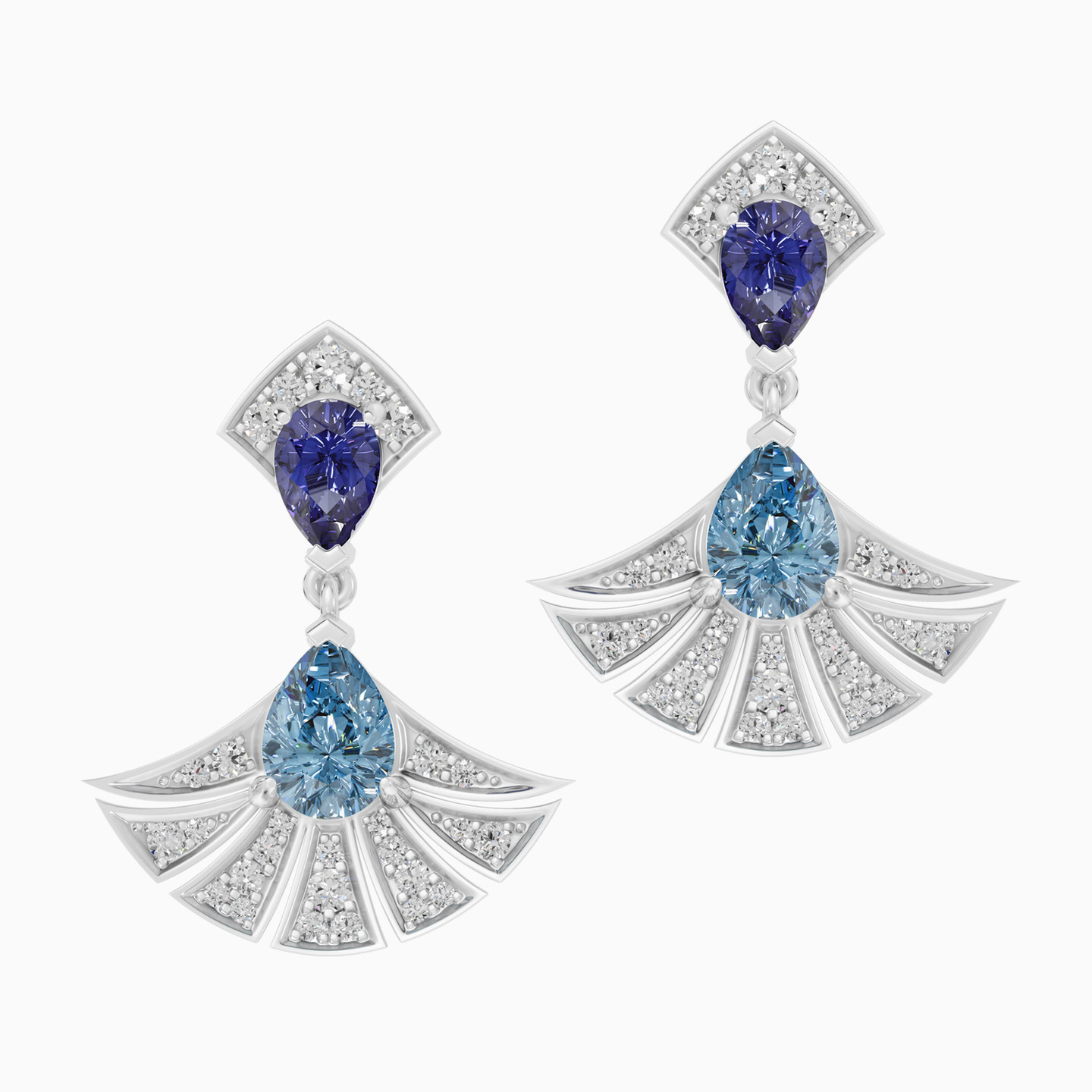 A dance of colors and light. This Lazurde Diamonds Earrings features a fan-shaped pendant accented with shimmering diamonds, crowned with a pear-shaped blue stone and a deep violet stone. A striking composition that symbolizes elegance in motion, making it a statement piece for a lifetime.