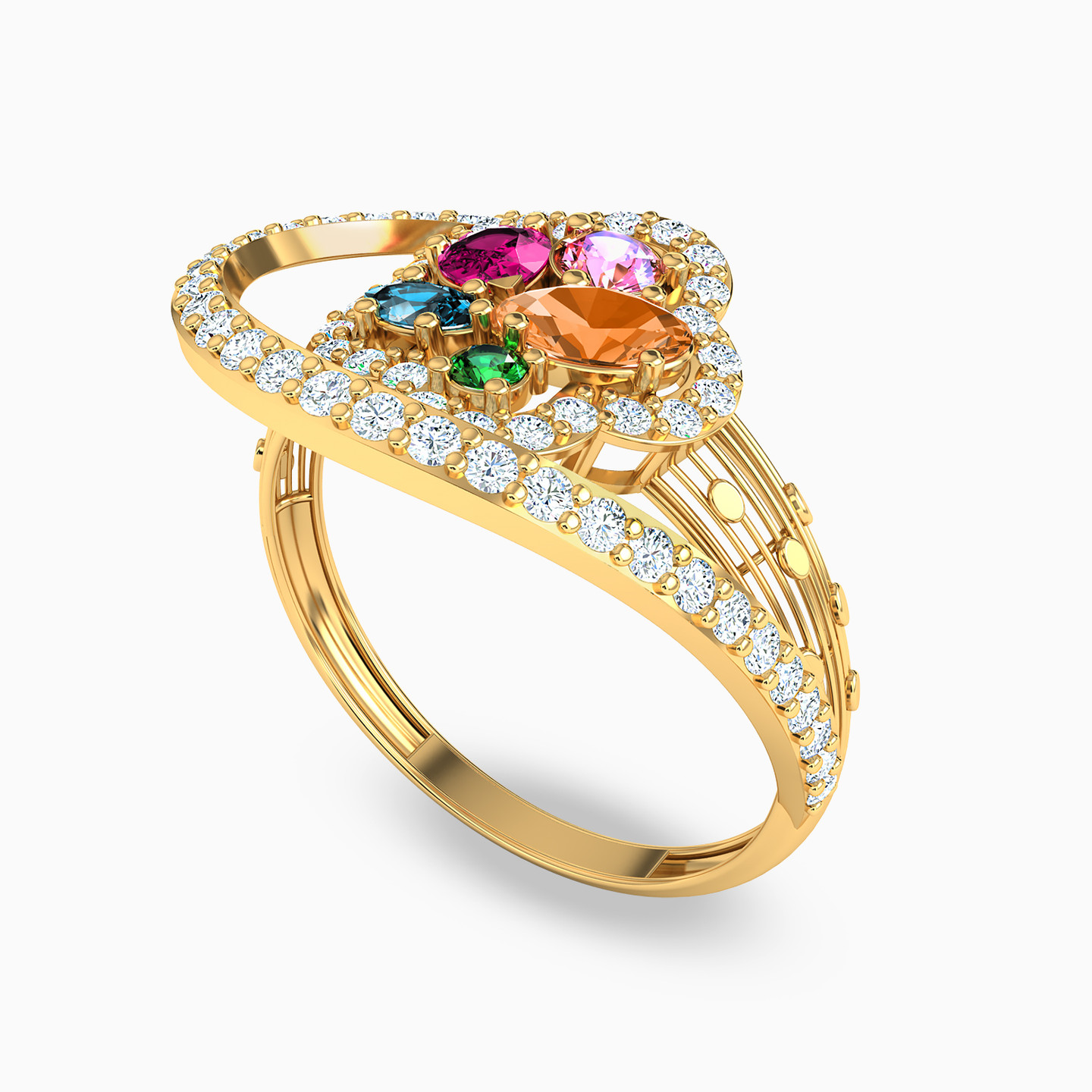 This bouquet of colors from L'azurde Gold will add an instant wow effect to your look. Cast in 21-karat yellow gold, this ring features slim cutwork on the band that's enhanced with a curved zirconia studded line and accented with stones in varied colors and shapes to the center. Sure to get you noticed, this will beautifully accentuate a solid contrasting hued outfit.