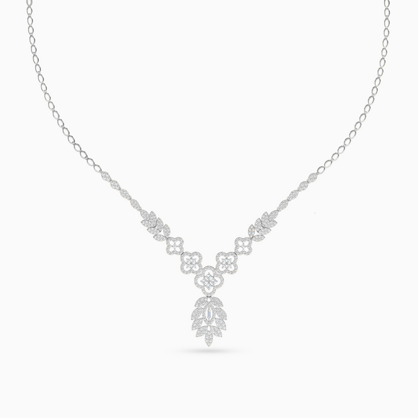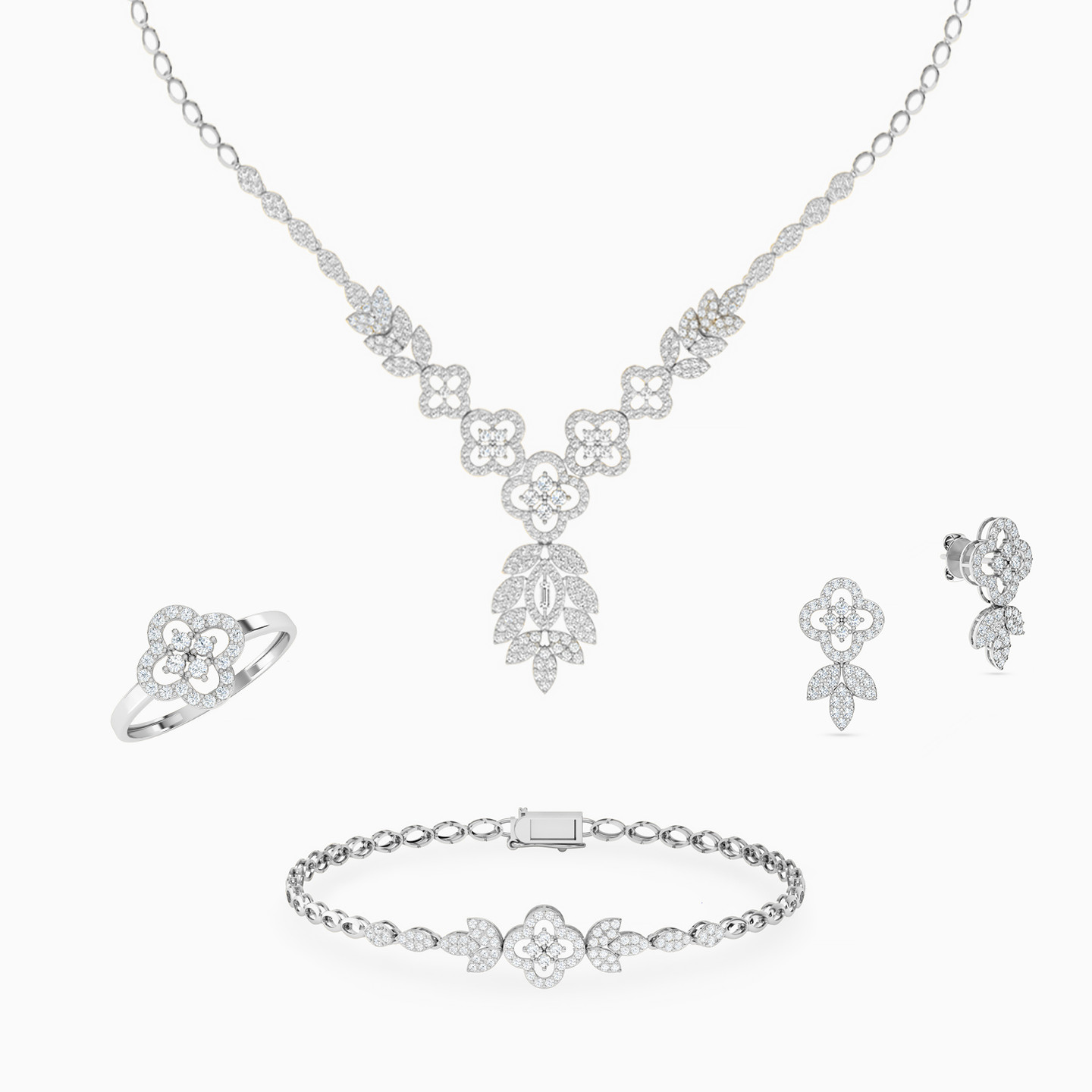 Always be party-ready with this mesmerizing jewelry set from L'azurde Gold. Showcasing floral and laurel leaf motifs, this elegant 18-karat white gold cubic zirconia jewelry set includes a stunning necklace, an eye-catching bracelet, a pair of drop earrings and a mesmerizing ring. Shimmering with chic cubic zirconia stones, this spectacular collection is guaranteed to turn heads.