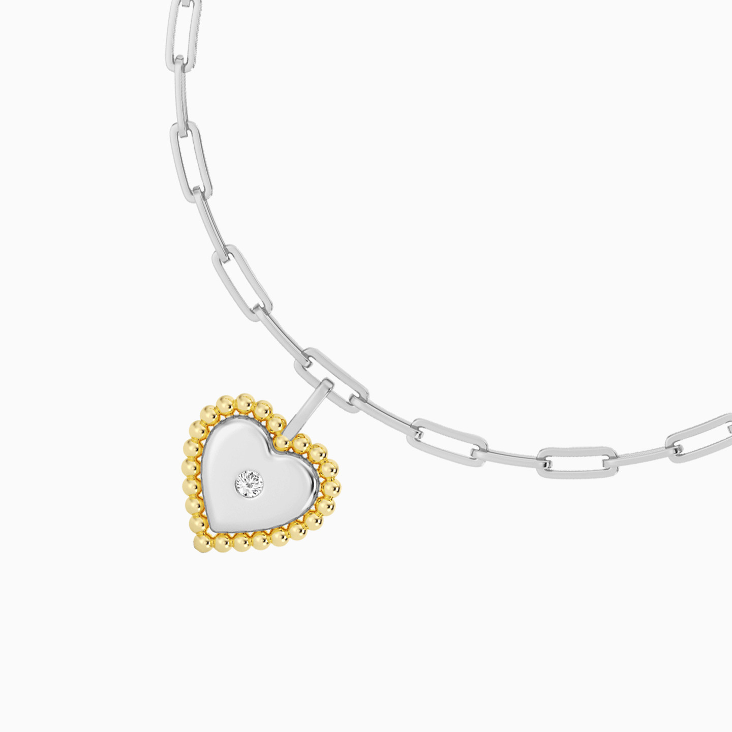 Discover affordable glamour and timeless style with this piece from Waves! This sterling silver bracelet radiates feminine charm with its delicate paperclip chain, featuring a lovely heart-shaped pendant in a mix of silver and gold plating tones, crowned by a sparkling lab-grown diamond at the center. A symbol of love and elegance, it’s the perfect piece to add a touch of romance and luminous beauty to your everyday style or special occasions.