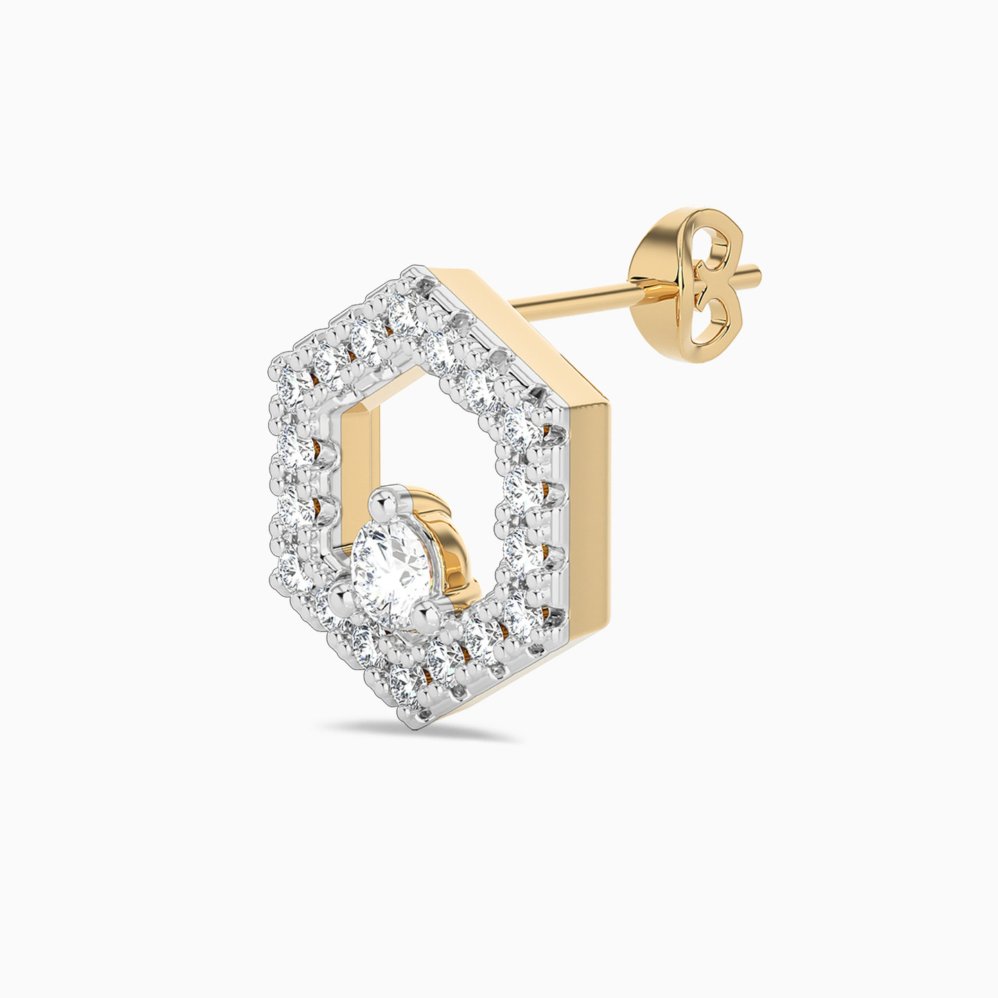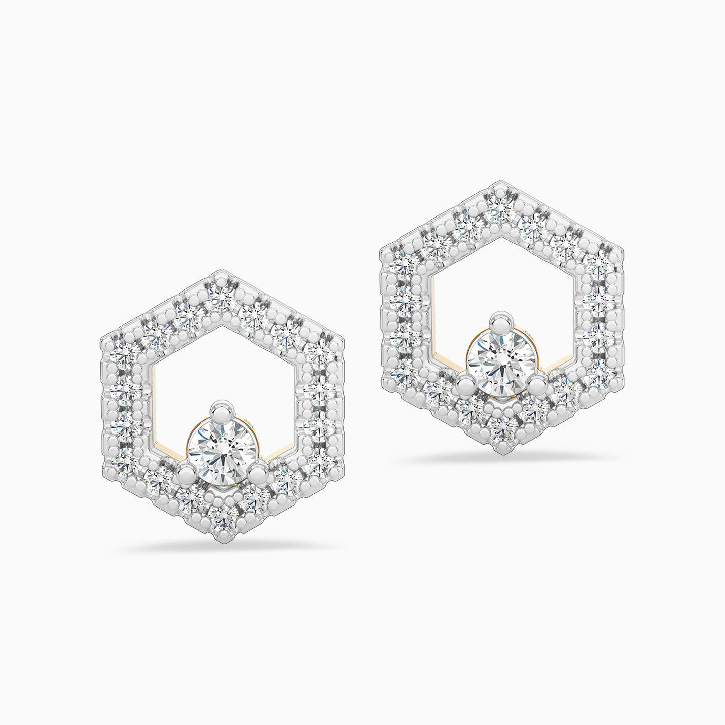 A pair of hexagon-shaped studs from L'azurde Diamonds to add to your everyday jewelry collection. Crafted from 18-karat yellow gold, these stud earrings come studded with 0.13-carat brilliant cut diamonds in a gorgeous castle setting and a single, prong set diamond on the base. A beautiful pick for days when you want to stand out yet keep it elegant.