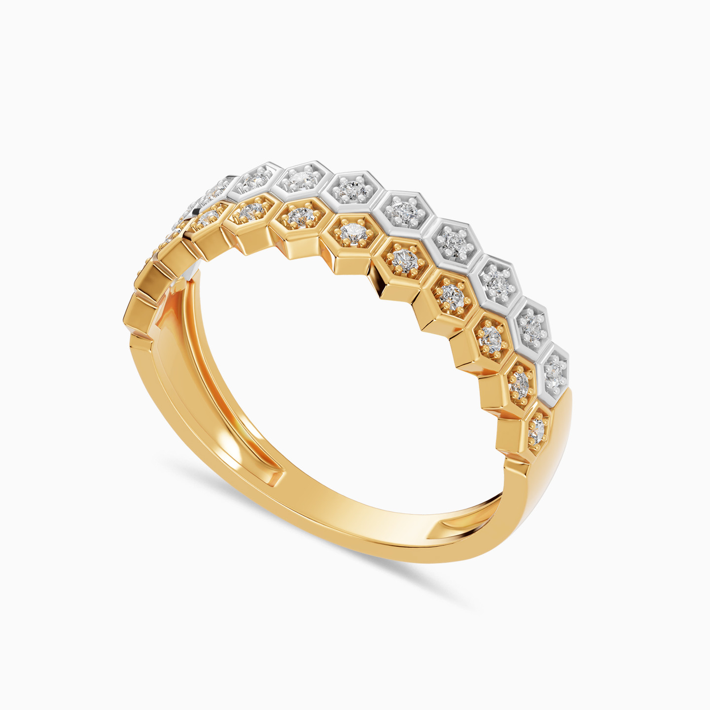 Geometry woven into luminous harmony. This Lazurde Diamonds ring in yellow and white gold features two rows of hexagon diamond frames seamlessly connected together in cohesive symmetry, each centering a brilliant stone within structured edges. The layered design enhances depth and radiance, wrapping the finger in bold yet refined brilliance. A distinctive piece to gift with meaning and cherish as a timeless investment in modern elegance.