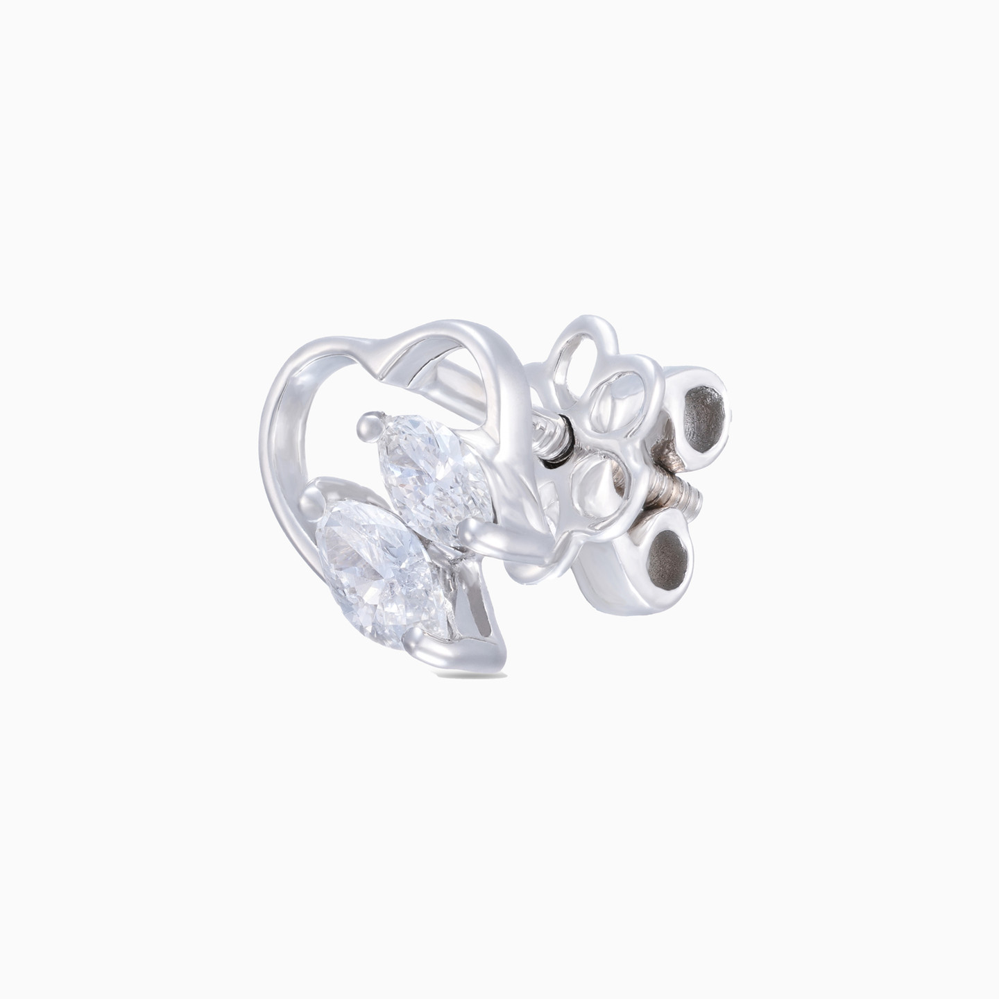 Open your heart to exciting possibilities with these earrings for little ones from L'azurde Diamonds. Lustrous 18-karat white gold open heart motifs adorn these beautiful stud earrings, with two 0.21-carat marquise cut diamonds gracefully tilted to give the design eye-catching interest. These magnificent diamond earrings will make your mini me shine.