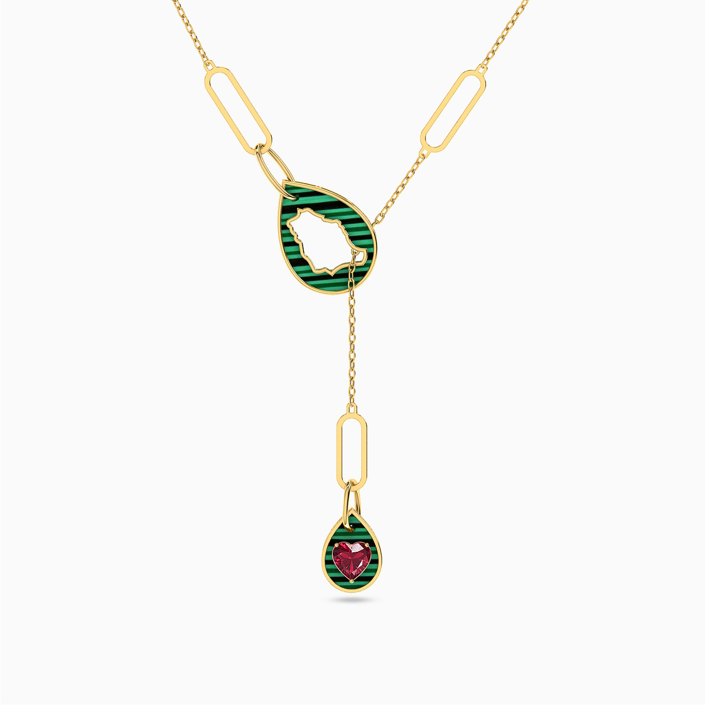 This unique drop necklace from L’azurde Instyle will make a grand gesture that expresses your love for your nation. Crafted in 18-karat yellow gold, this number features a cutwork of Saudi Arabia map to the pendant that's further enhanced with a slim drop studded with a red heart shaped stone. Wear yours with your everyday wardrobe or extend the kindness by gifting it to a special someone as a keepsake.