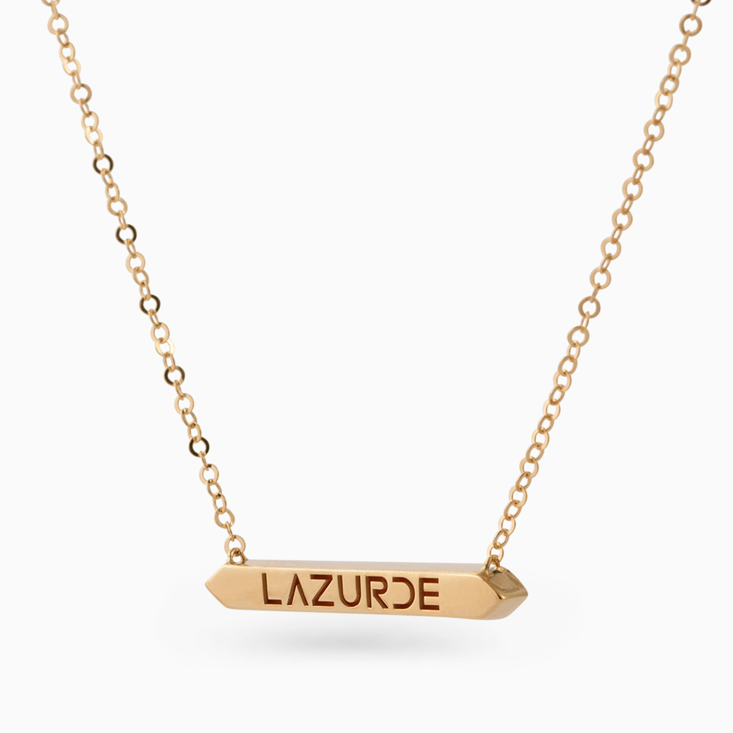 Exude confidence and premium style with this iconic necklace from L'azurde Diamonds. The sleek 18-karat yellow gold pendant shaped like a double headed arrow features the brand name embossed in red accent that stands out as it drops from the delicate chain. Wear this solo for a clean minimal look.