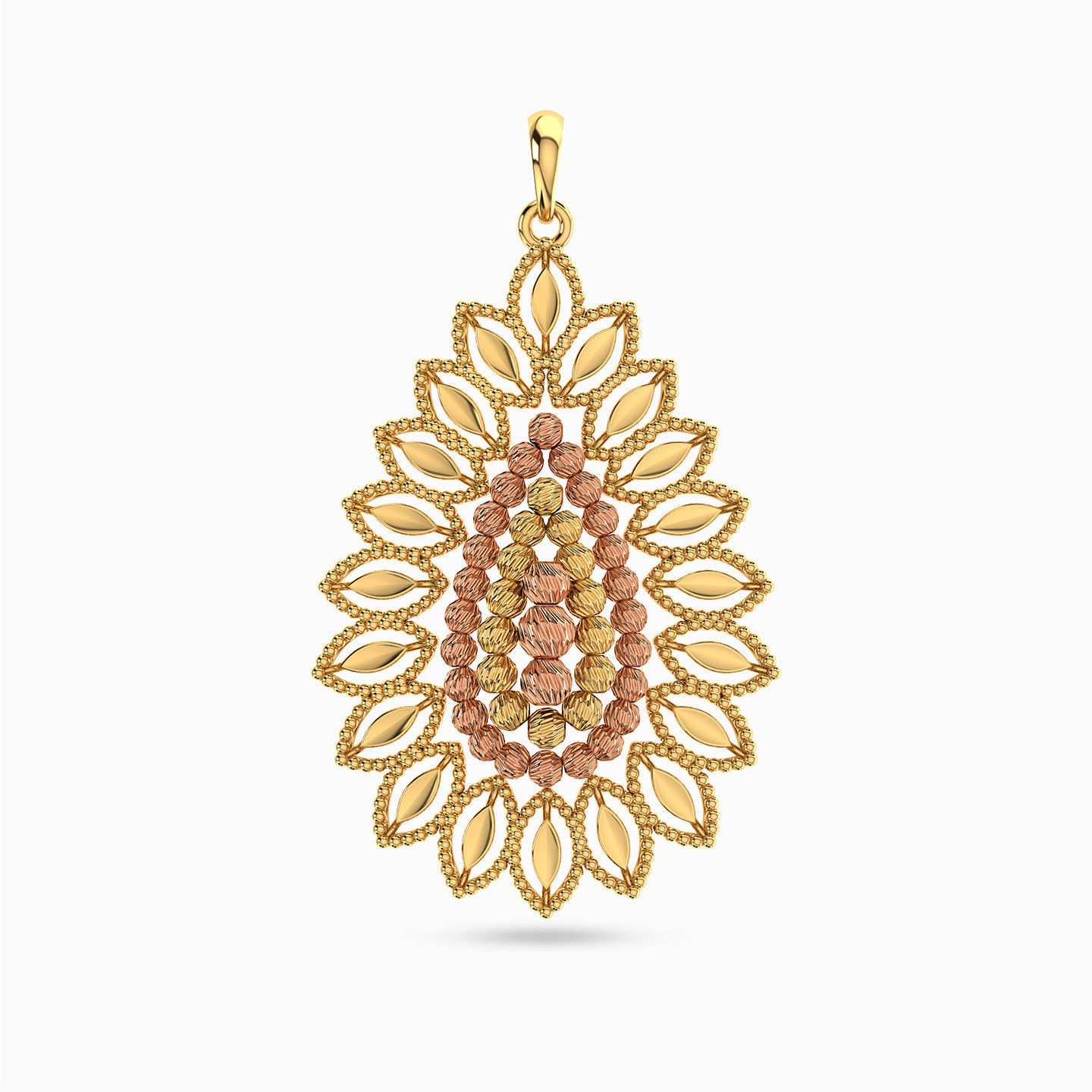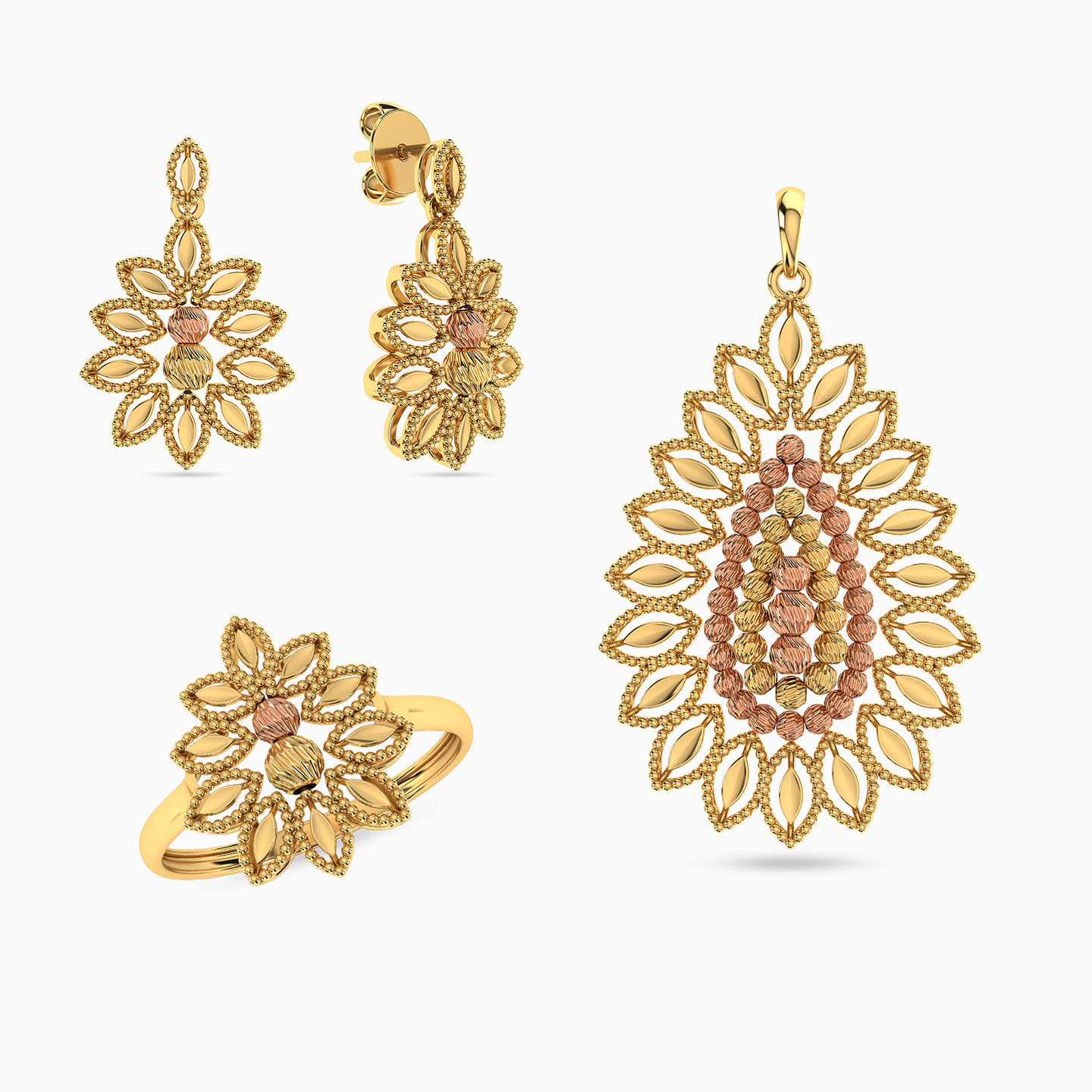 Raise the style bar and make a statement whenever you enter the room wearing this gorgeous half jewelry set from L’azurde Gold. A cascade of gleaming 21-karat yellow gold leaves gives this exquisite set its magnificent appeal. Easy and elegant, the stunning ring, drop earrings and pendant are the obvious choices when you want to add instant sophistication and a touch of luxurious style to formal, workday or weekend wear.