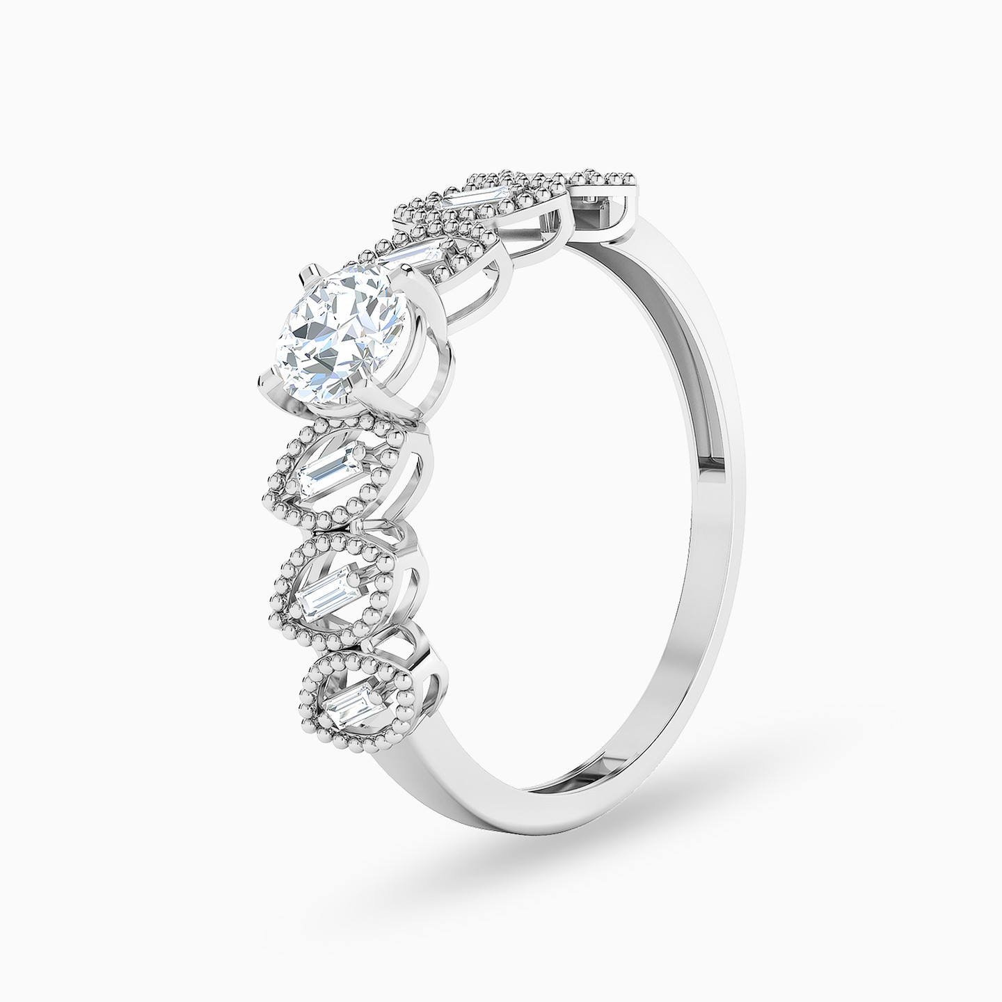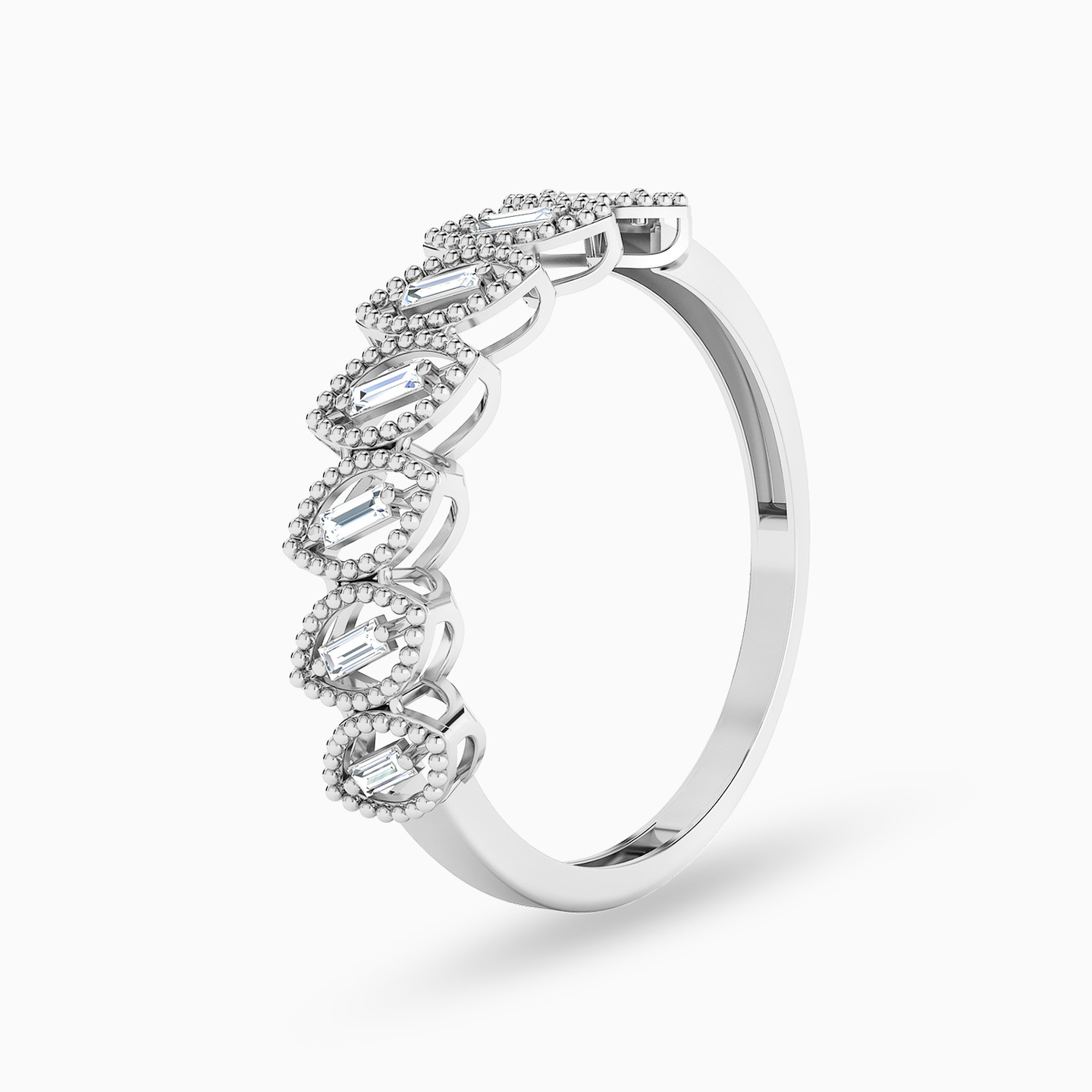 Delicate sophistication defines this striking twin ring set from L'azurde Gold. The elegant beaded marquise shaped motifs come gracefully studded with baguette cut stones, along with a center stone on one of the rings. This set makes a wonderful choice for everyday wear, whether you wear it together or individually.