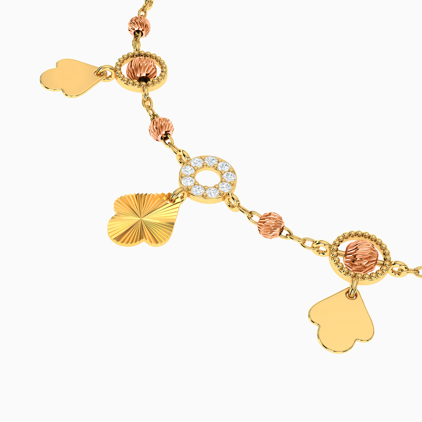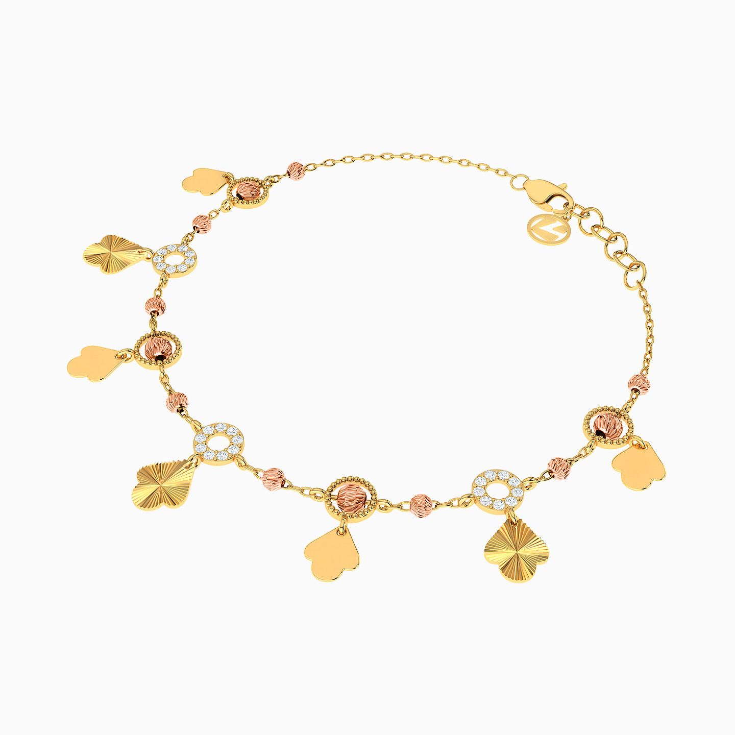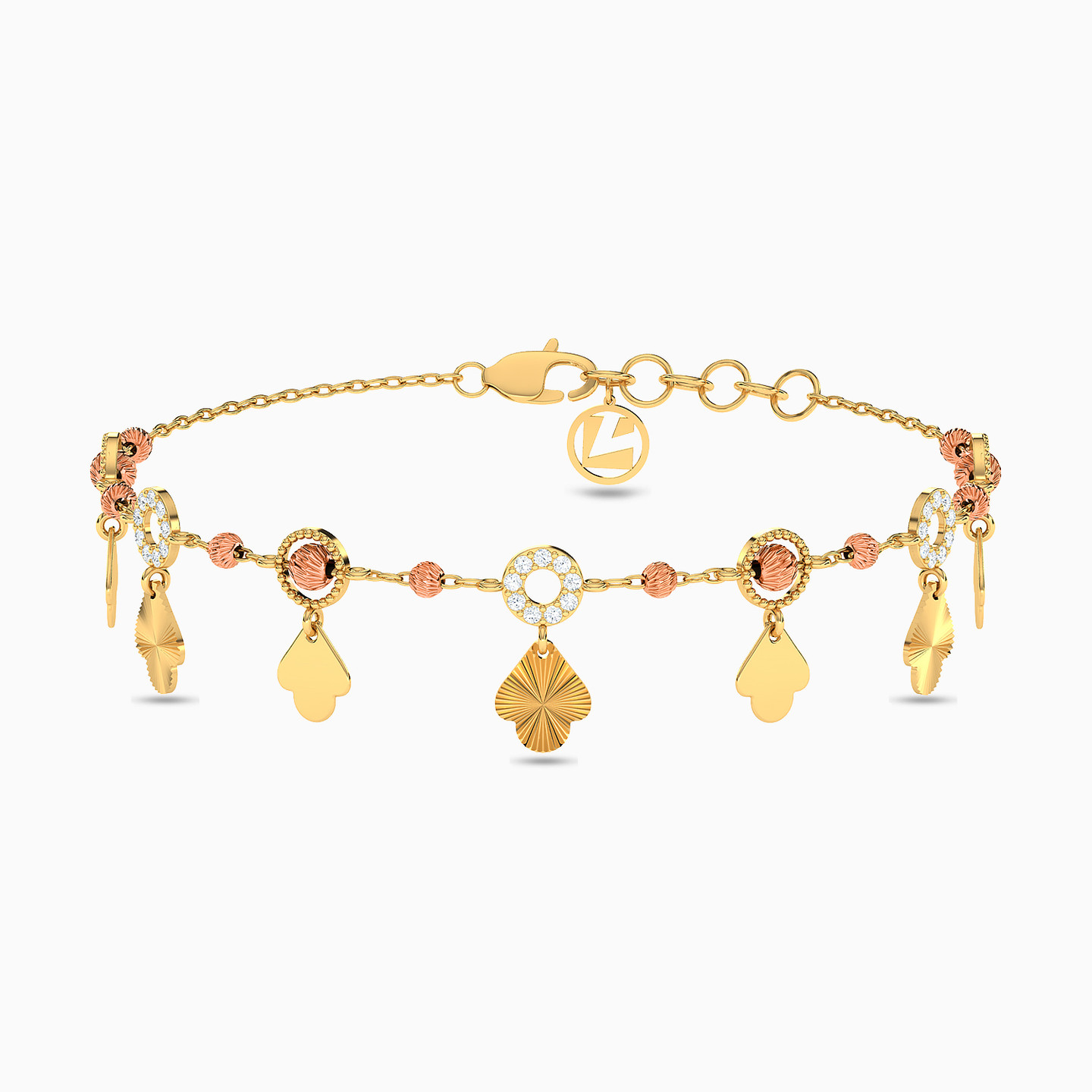 Wrap your wrist in pure perfection, with this stunning chain bracelet from L’azurde Gold. This gorgeous bracelet features 21-karat yellow gold charms suspended from rings of round cubic zirconia, alternating with detailed yellow gold charms suspended from shimmering rose gold balls. Take your wardrobe to new heights of elegance by wearing this bracelet to your next business meeting or social event.