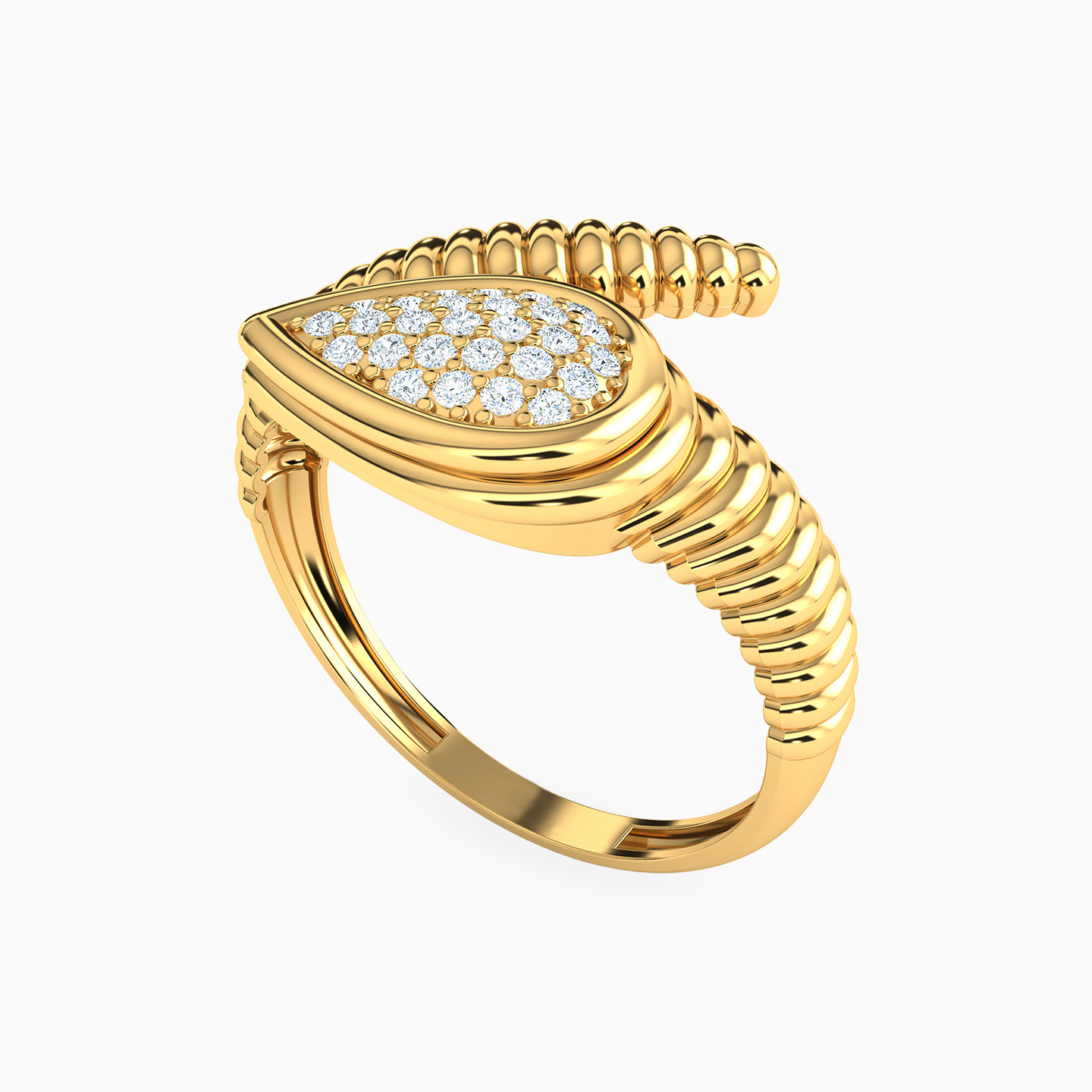 Looking for something edgy and bold? Then this ring by L’azurde Gold is your answer. Featuring a gorgeous teardrop-shaped head studded with sparkling stones and completed by a classy ribbed band, this bypass-style ring creates a very modern statement on the fingers. Style this 21-karat yellow gold ring with a cocktail dress for a party or formal outfits for a workday.