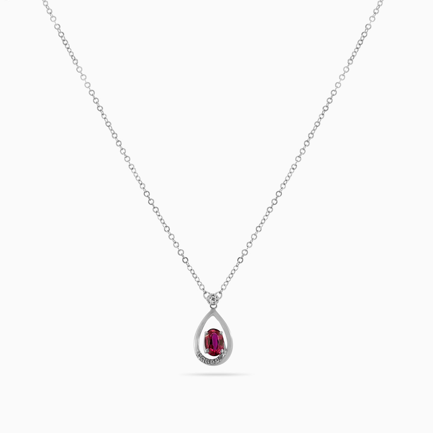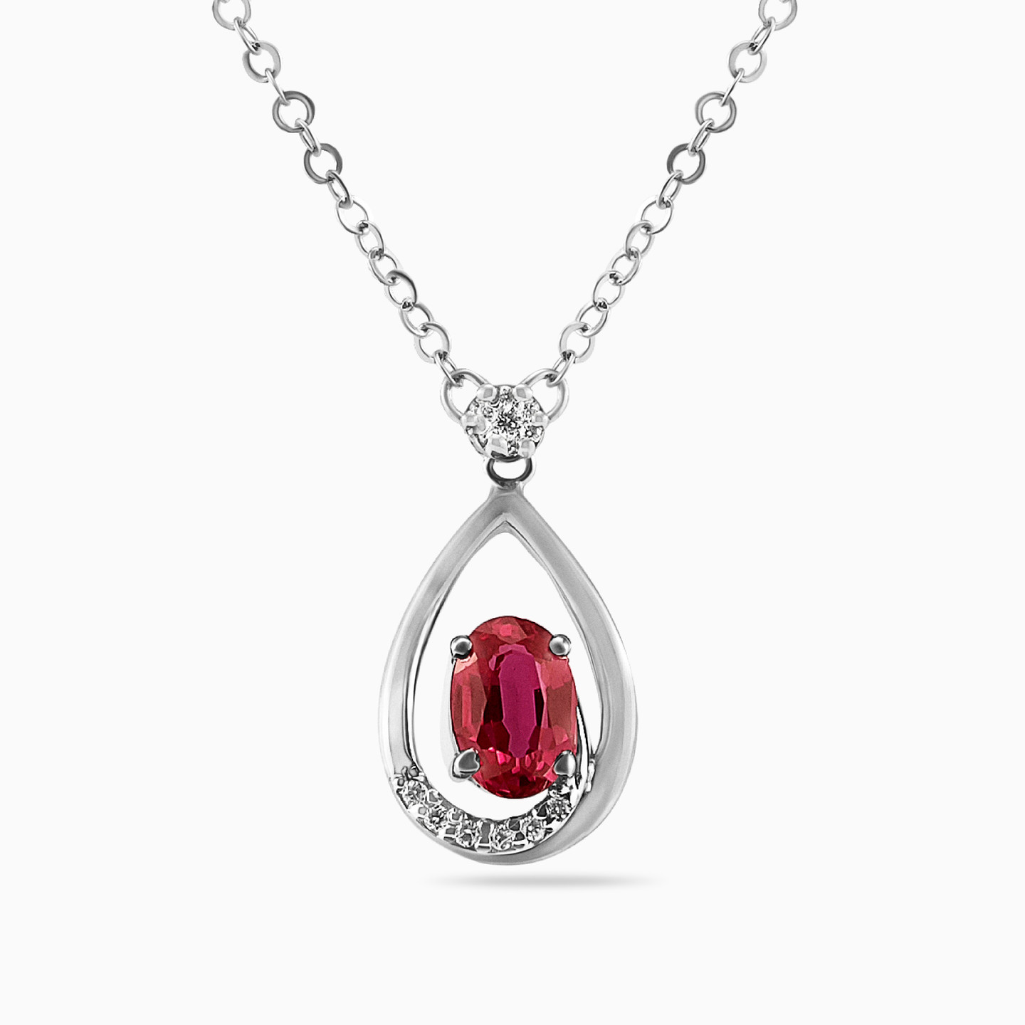 This 18-karat white gold pendant necklace from L'azurde Diamonds is a masterpiece that marries timeless design with vibrant sophistication The pendant showcases a graceful pear-shaped silhouette, delicately lined in the corner with 0.03-carat brilliant cut diamonds that glimmer like stars. Nestled at its heart is a prong-set red oval-shaped colored stone, radiating a deep and captivating hue that adds a touch of luxurious charm to this necklace. Style this necklace with a cocktail dress and effortlessly capture attention.