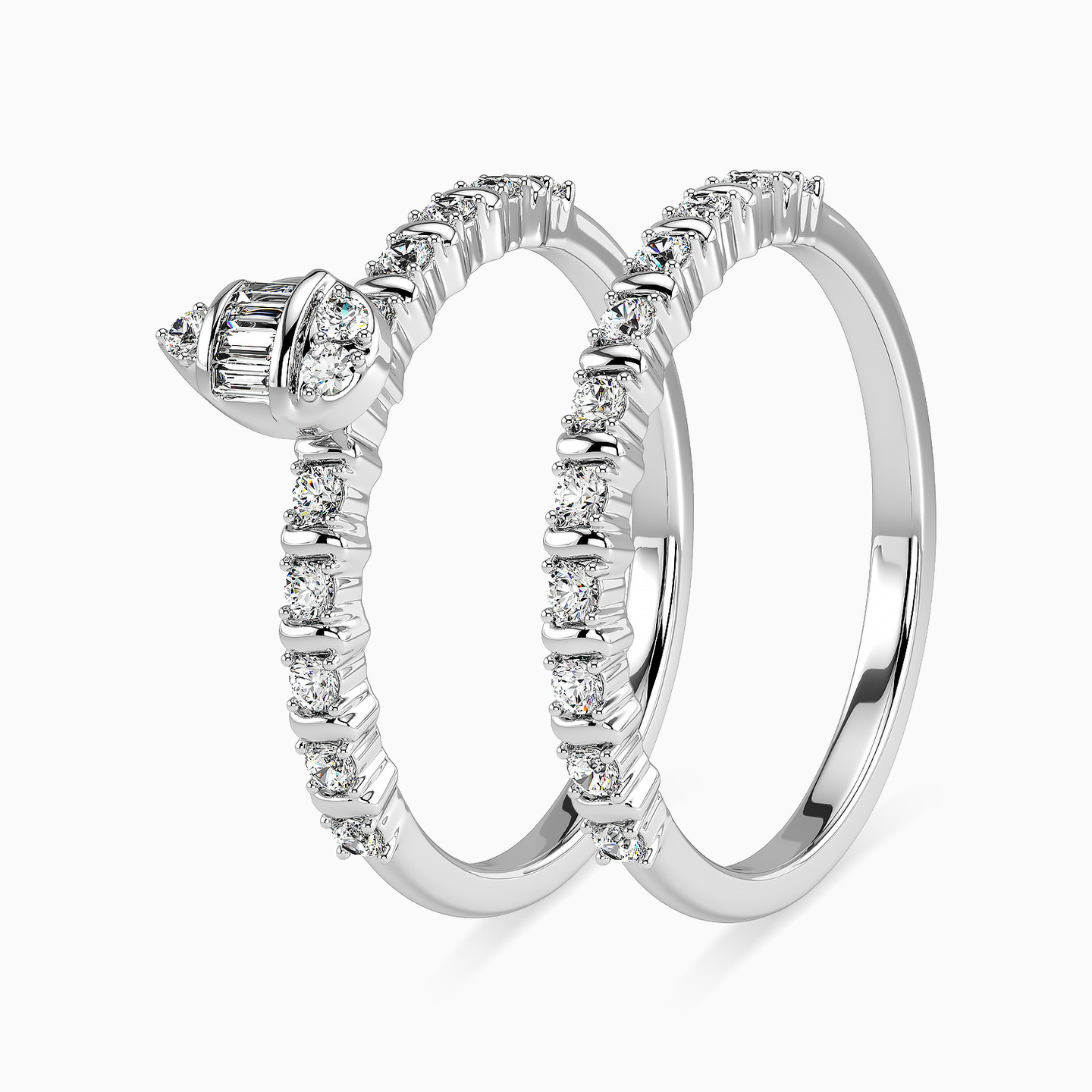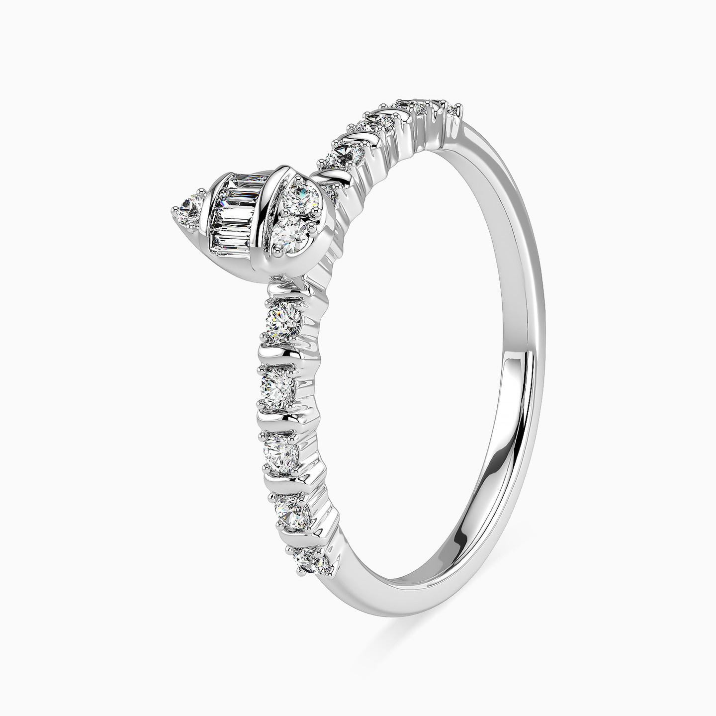 Express your love with the gift of this breathtaking diamond statement ring from L'azurde Diamonds. Elegant shapes and a stunning dual band give this magnificent ring its allure. We love the brilliance of the 0.36-carats of dazzling diamonds that grace the shank of the ring and the center teardrop in a mix of round and baguette shapes. Shimmering in lustrous 18-karat white gold, this exquisite ring will leave that special someone speechless.