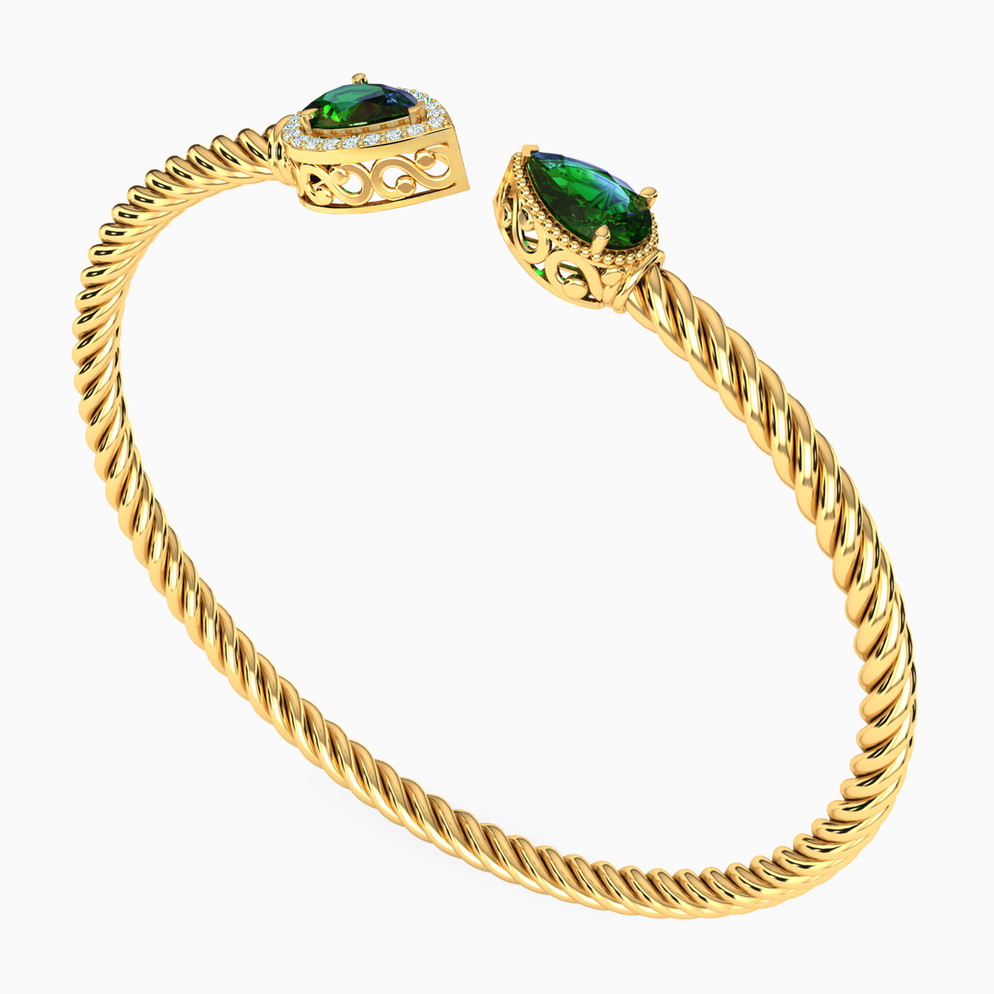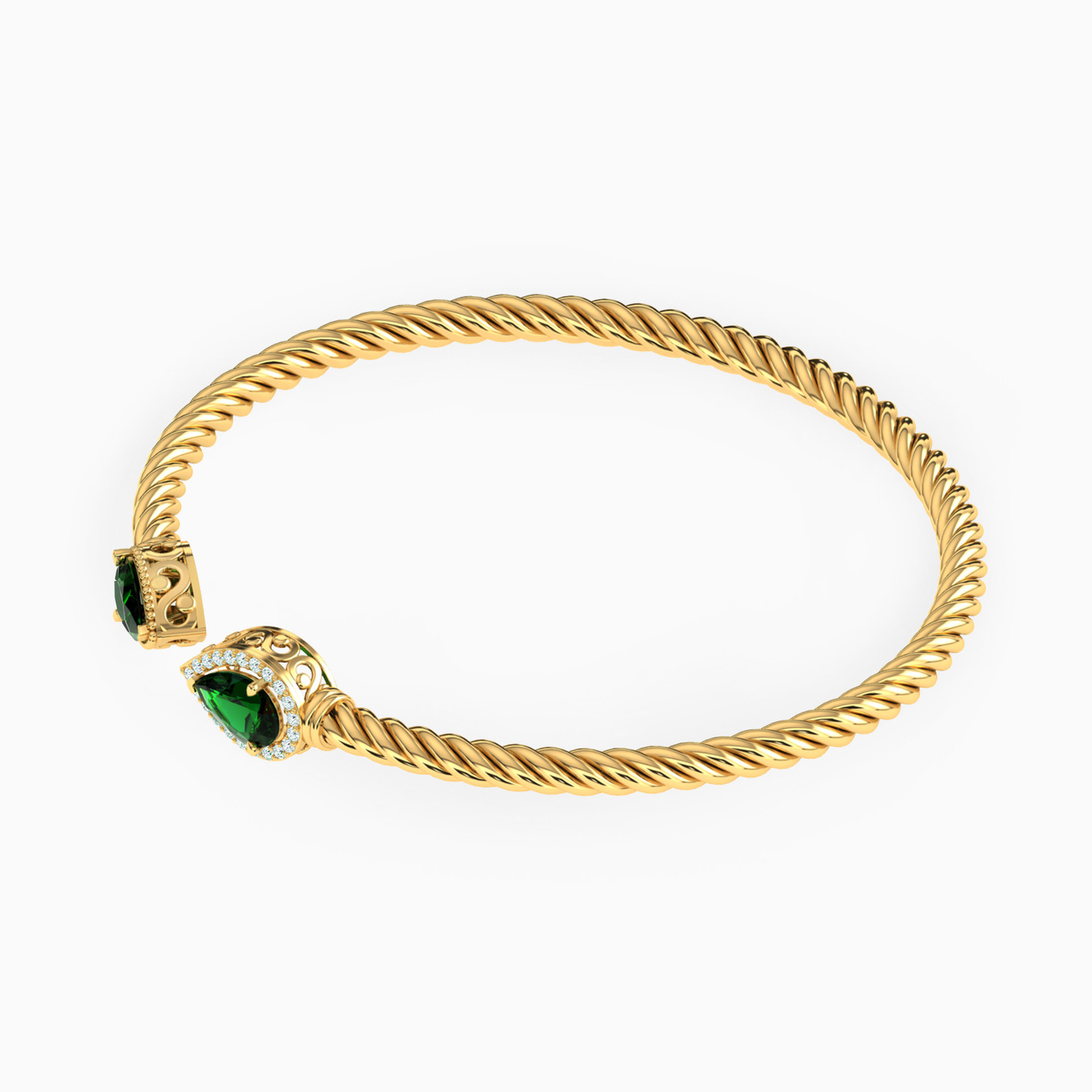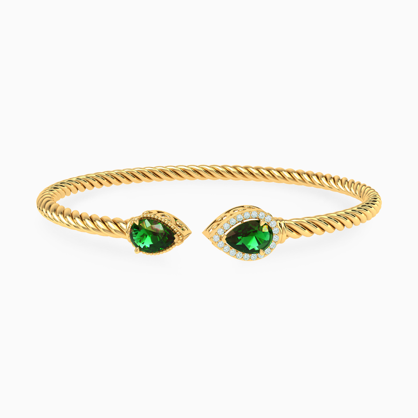 Carry your distinct style everywhere you go with this bangle from L'azurde Gold. The open design and twist textured construct in 18-karat yellow gold is complemented with deep green pear shaped stones and sparkling zirconia. A matching ring would make the ideal pair with this piece.