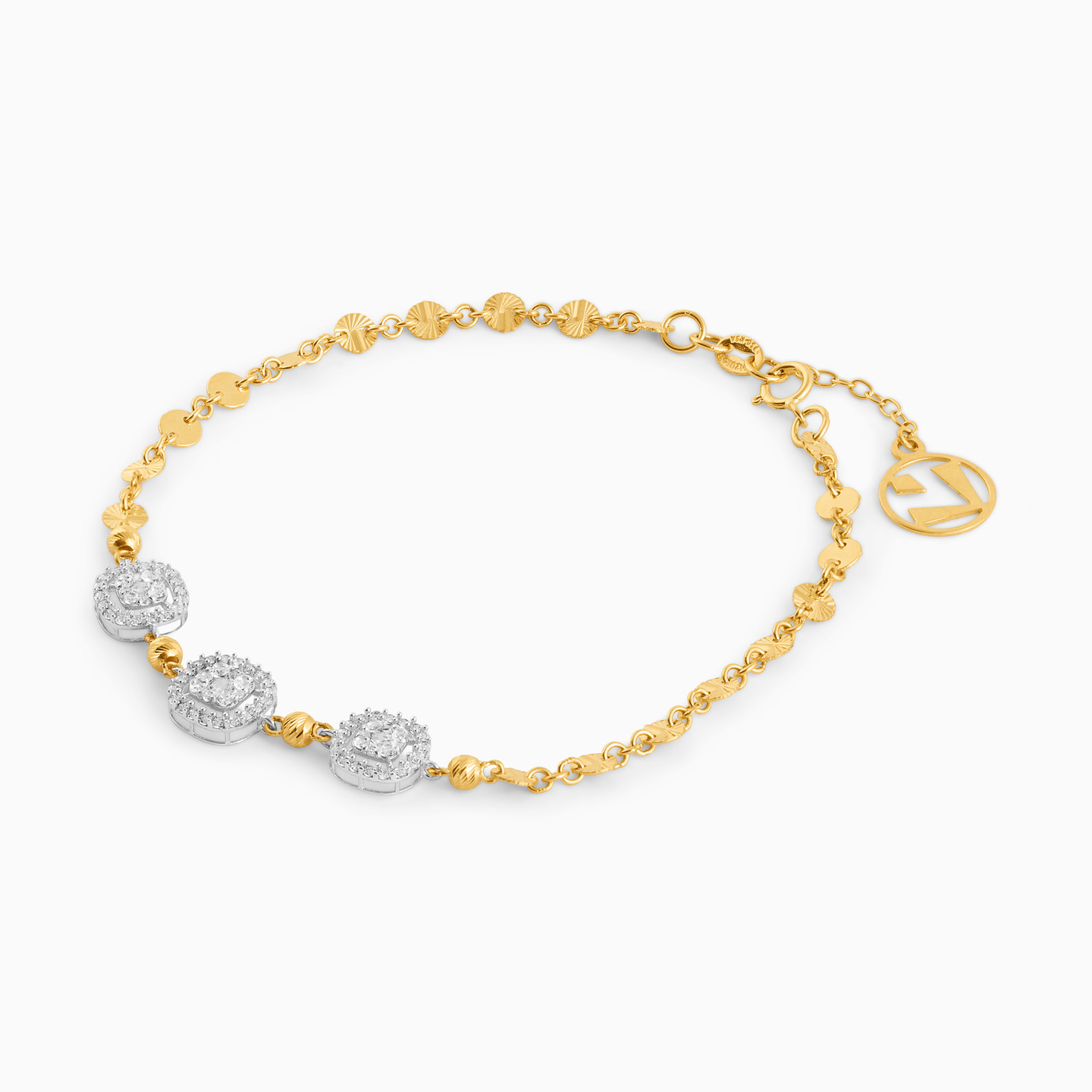 Inspired by the beauty that oozes elegance and royalty comes this gorgeous bracelet from L'azurde Gold. A delicate chain bracelet made of sequins and chain links and completed by three square-shaped 18-karat white gold frames studded with sparkling cubic zirconia stones in the center. This 18-karat yellow gold bracelet is just breathtakingly beautiful!