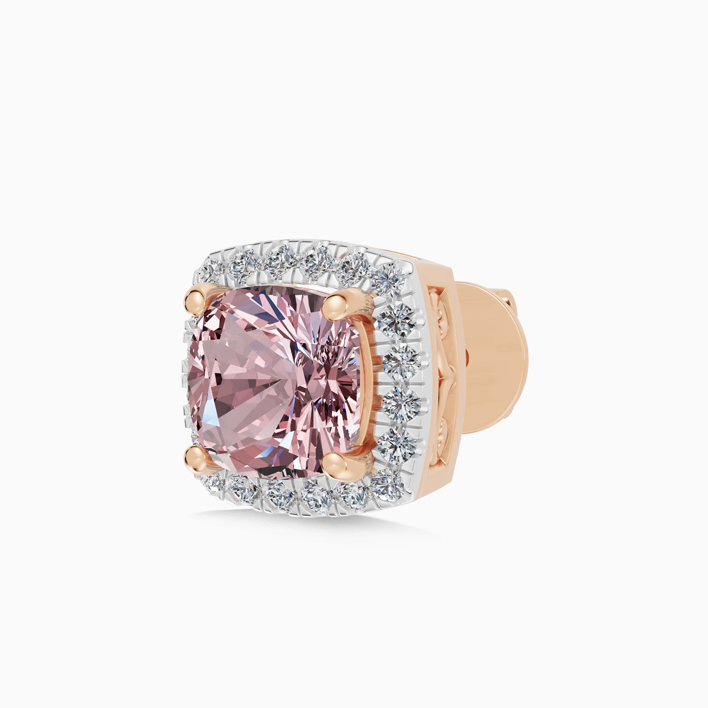 Soft warmth meets refined brilliance. These Lazurde Diamonds stud earrings are centered with cushion-shaped peach morganite stones, each framed by a halo of brilliant-cut diamonds that enhance their gentle glow and sculpted silhouette. Designed for women drawn to understated romance and confident elegance, they’re timeless pieces that elevate everyday moments and stand as a lasting investment in personal style.