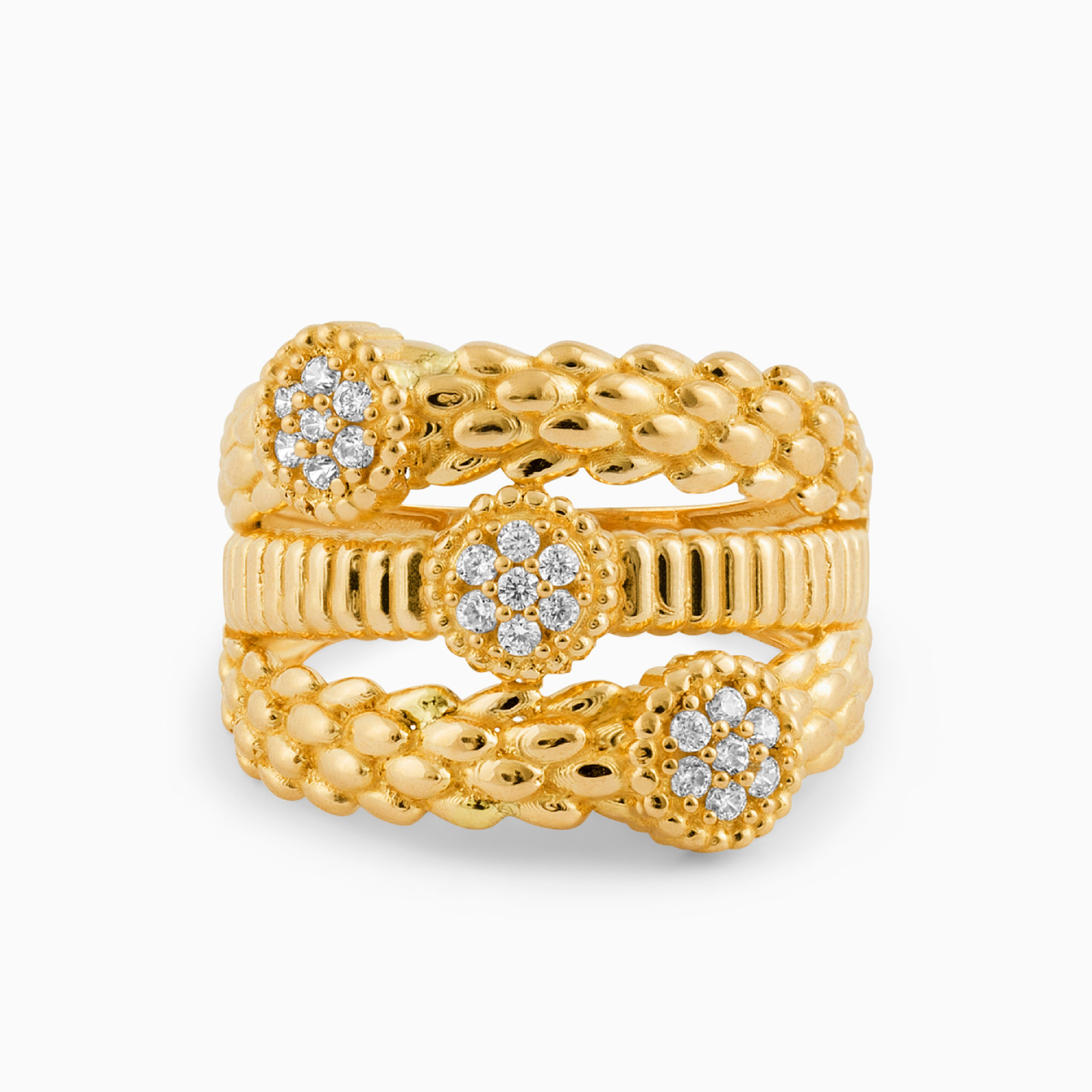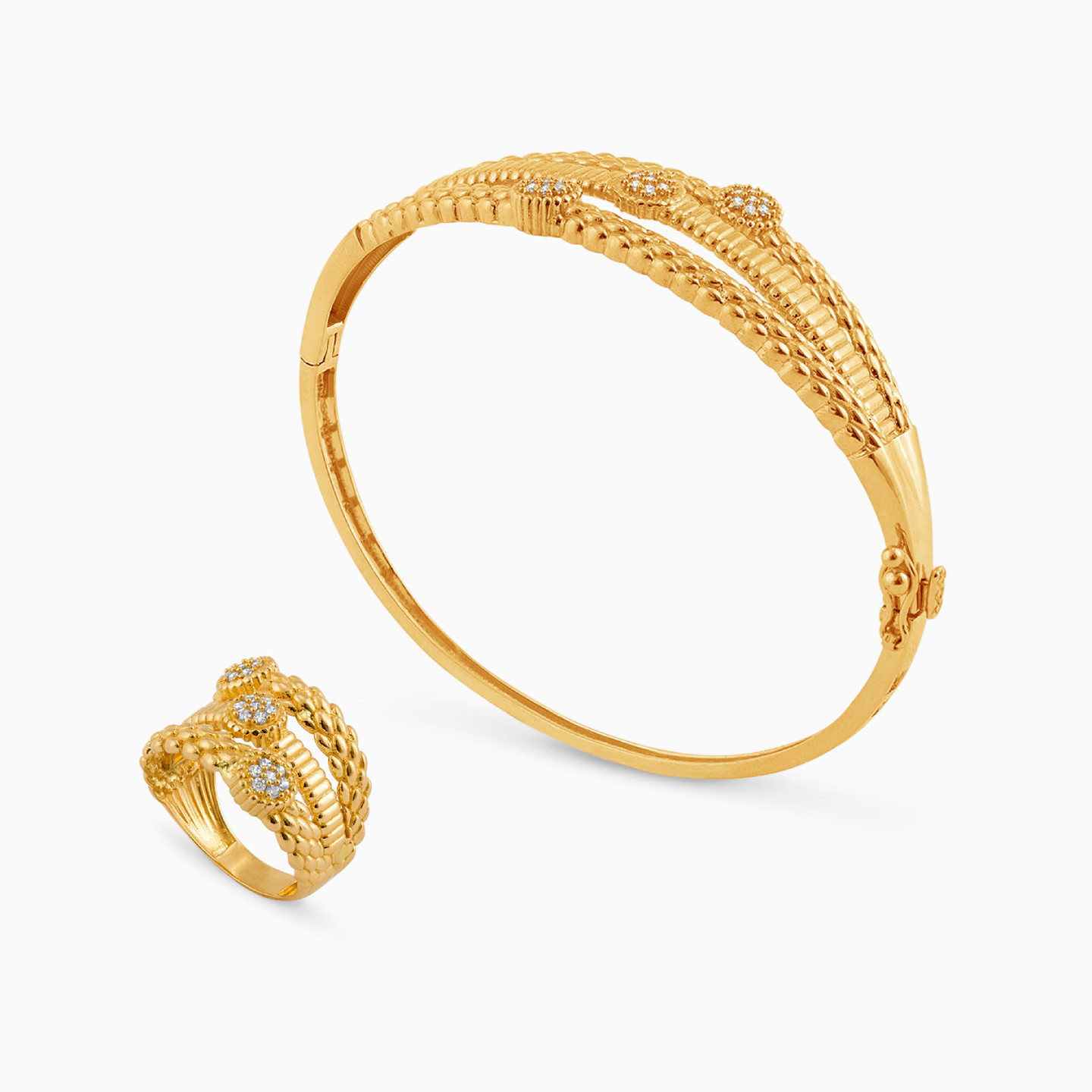 Timeless gold jewelry is always in style and this stunning 21-karat yellow gold jewelry set from L’azurde Gold will continuously impress. This chic bracelet and ring set features textured gold details, exceptional cutwork and dazzling cubic zirconia floral-inspired accents. Every woman should have a jewelry set in her collection to dress up any look with effortless sophistication.