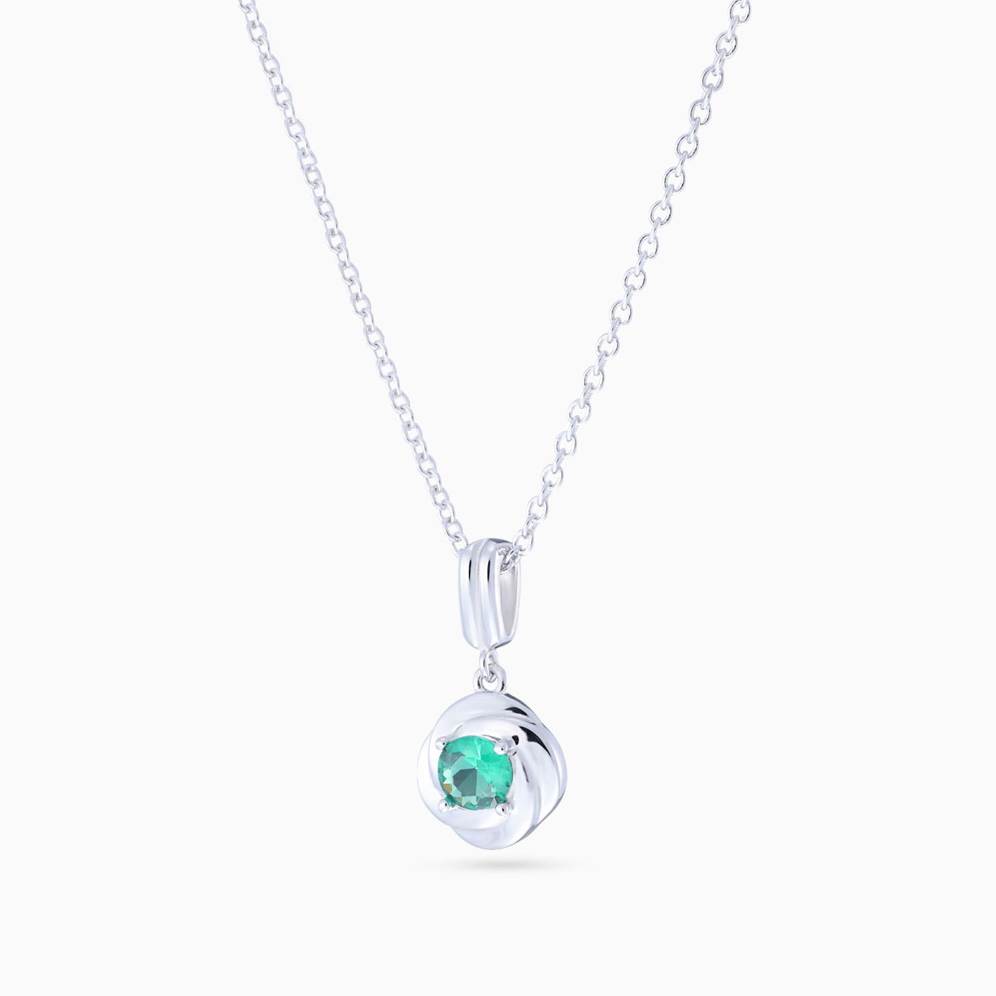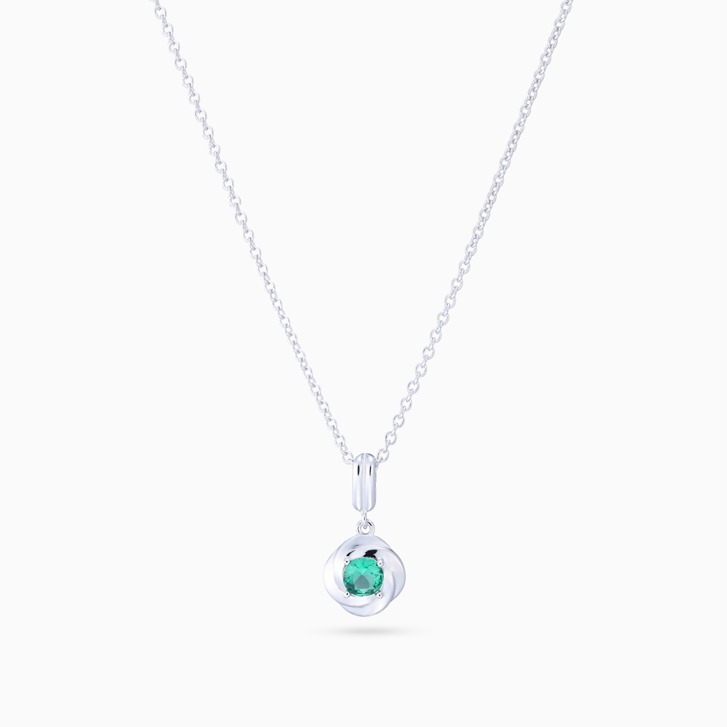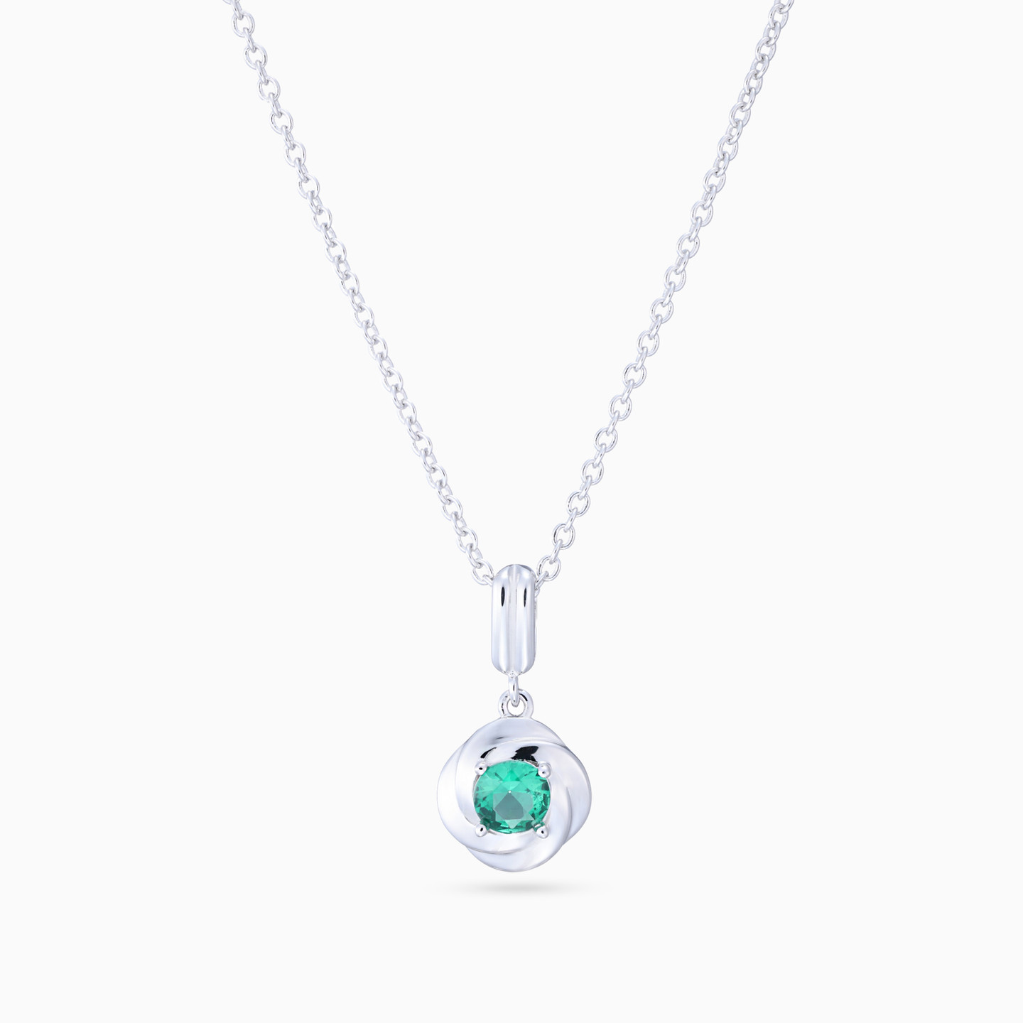 Discover affordable glamour and timeless style with this piece from Waves! This stunning sterling silver necklace features an elegant intertwined circle design, with a vibrant round green stone at the center. The delicate fusion of sleek silver and the eye-catching green stone makes this necklace a perfect blend of simplicity and sophistication, ideal for adding a touch of color and elegance to any outfit. A must-have addition to your jewelry collection for both everyday wear and special occasions.