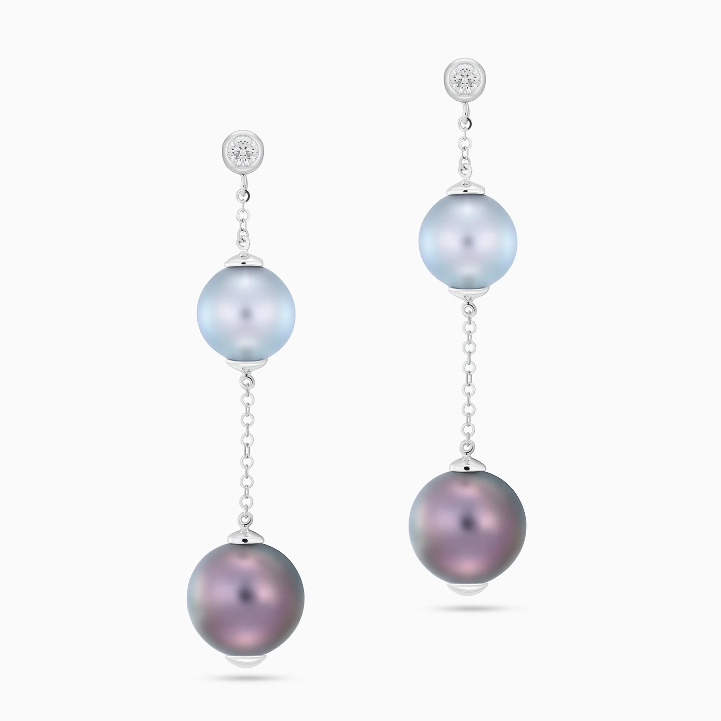Movement captured in perfect balance. These Lazurde Diamonds drop earrings feature two luminous black pearls connected by a delicate chain, suspended from a single small diamonds stone, creating a fluid silhouette that sways with effortless elegance. The vertical composition feels bold yet refined, reflecting confidence and modern femininity. A meaningful pair to gift with intention or to treasure as a timeless investment in distinctive style.