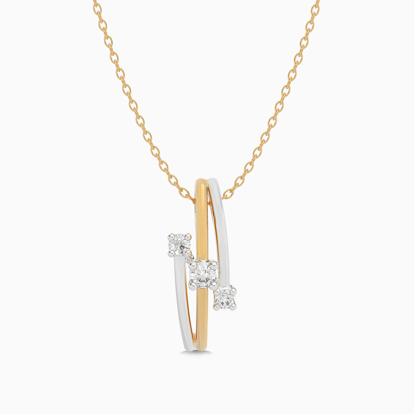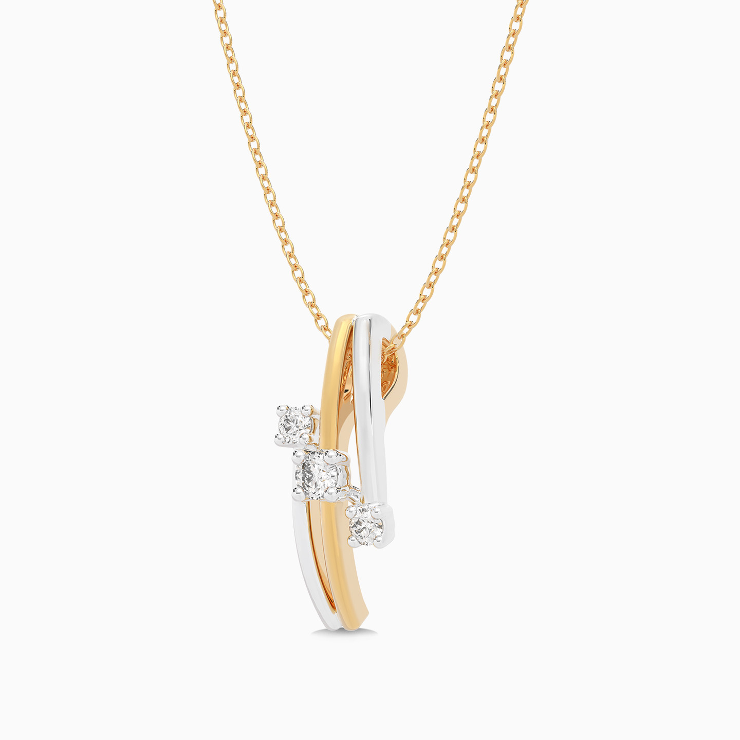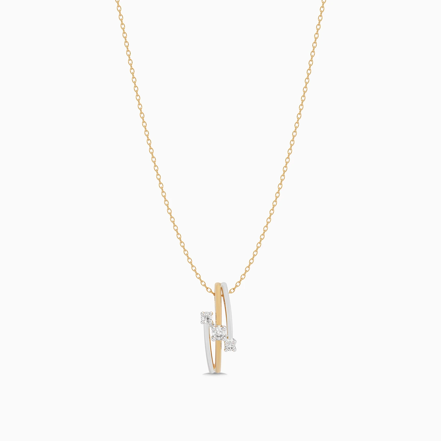 Indulge in timeless elegance with this beautiful pendant from L'azurde Diamonds. Crafted from luxurious 18-karat yellow and white gold, it features a sleek band adorned with a brilliant-cut diamond at its center and flanked on either side by sleek white gold bands emerging from opposite directions, each culminating in a brilliant-cut diamond. This pendant is a symbol of refined beauty and is sure to illuminate any neckline with grace and glamour.