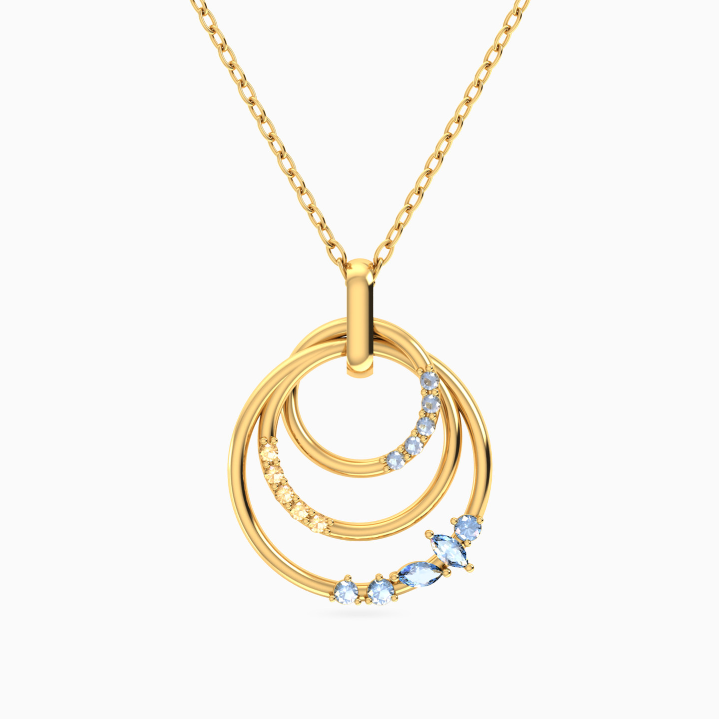 Eternal circles of sparkle. This Miss L’ necklace features three interlocked golden rings, each adorned with shimmering blue and yellow stones and diamonds—like orbits dancing in harmony. A symbol of connection, balance, and endless elegance, perfect for the dreamer who shines from within.