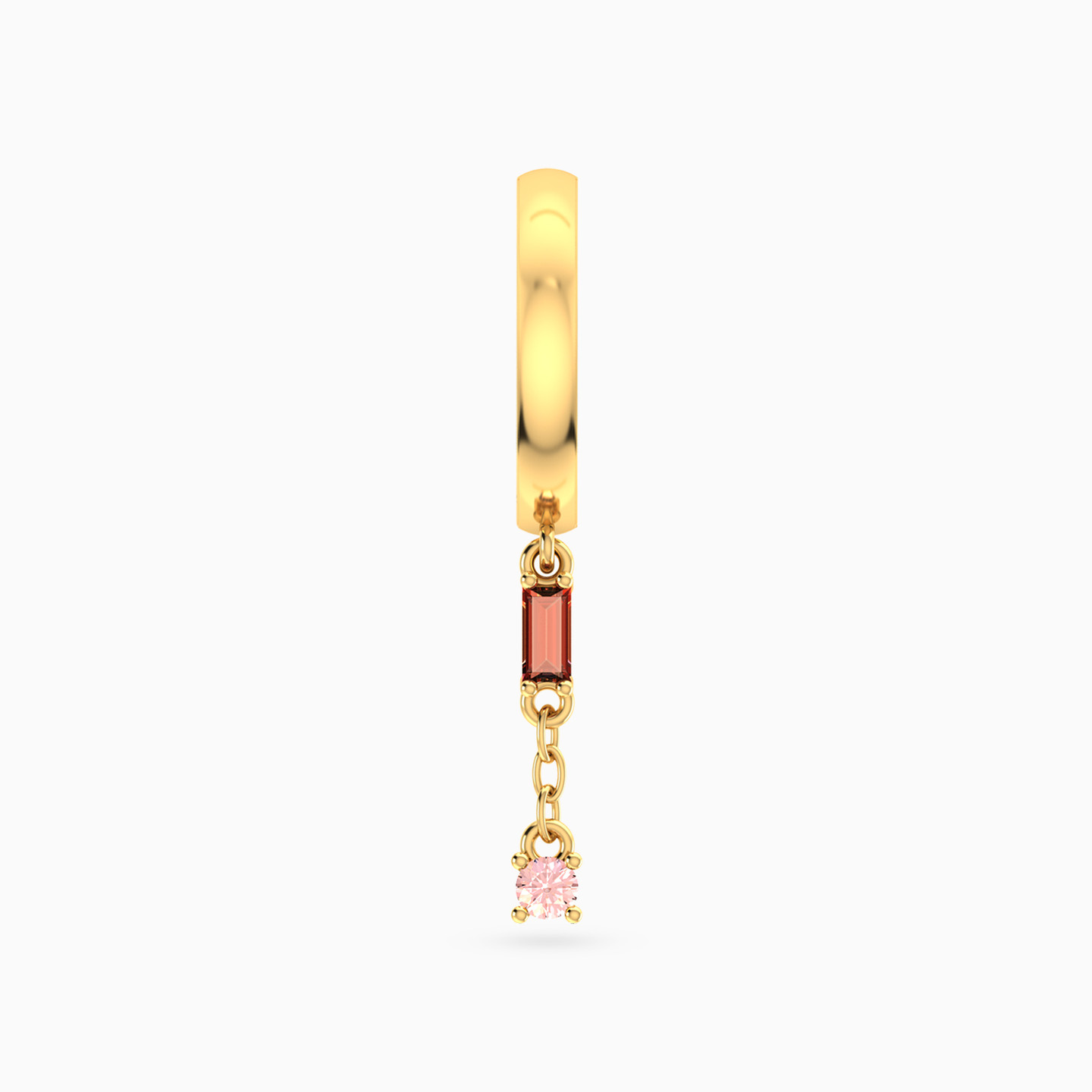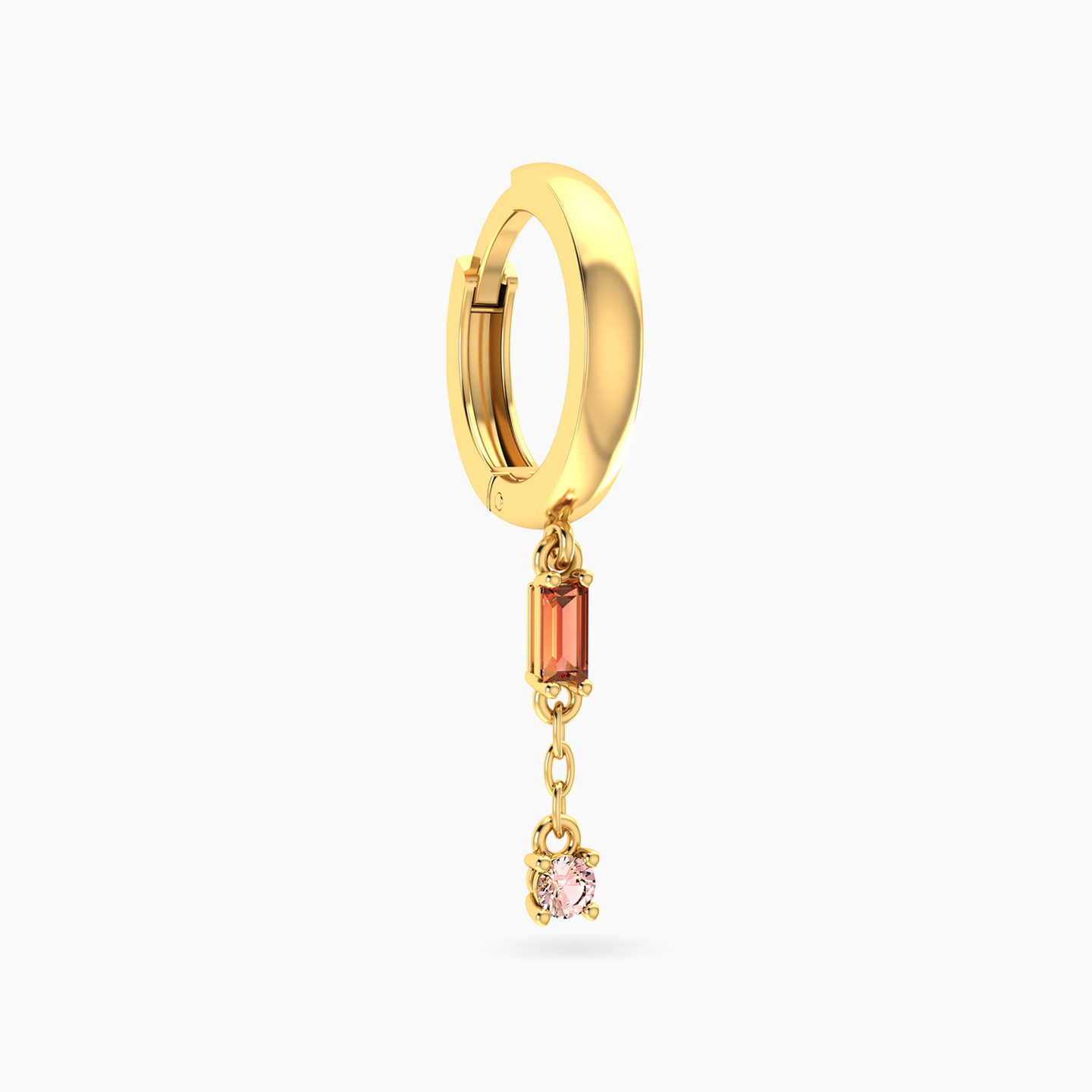 Showcase your statement-making style by wearing this eye-catching hoop earring from Miss L' for daytime to evening glam. Crafted in 18-karat yellow gold, this elegant hoop earring captivates with a baguette shaped colored stone that drops to a round colored stone via a dainty gold chain. Sweet and sophisticated at the same time, this hoop earring makes a versatile addition to your ear stack.