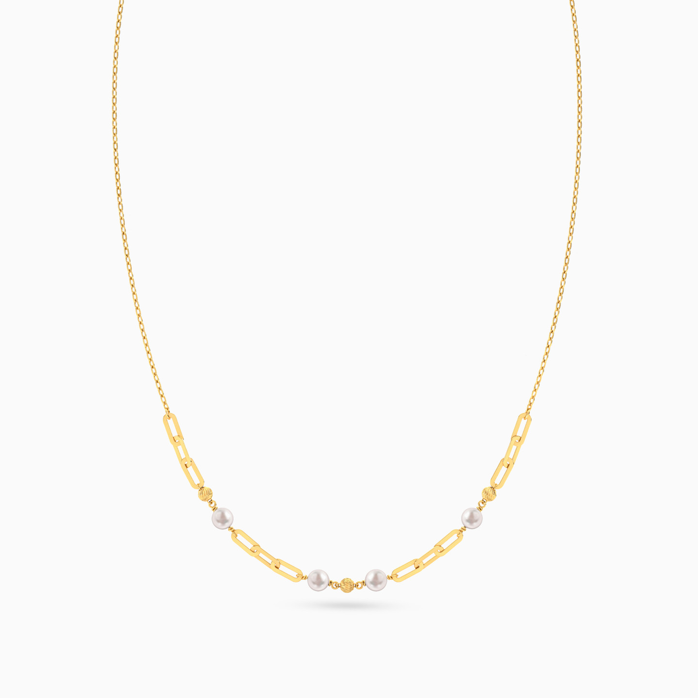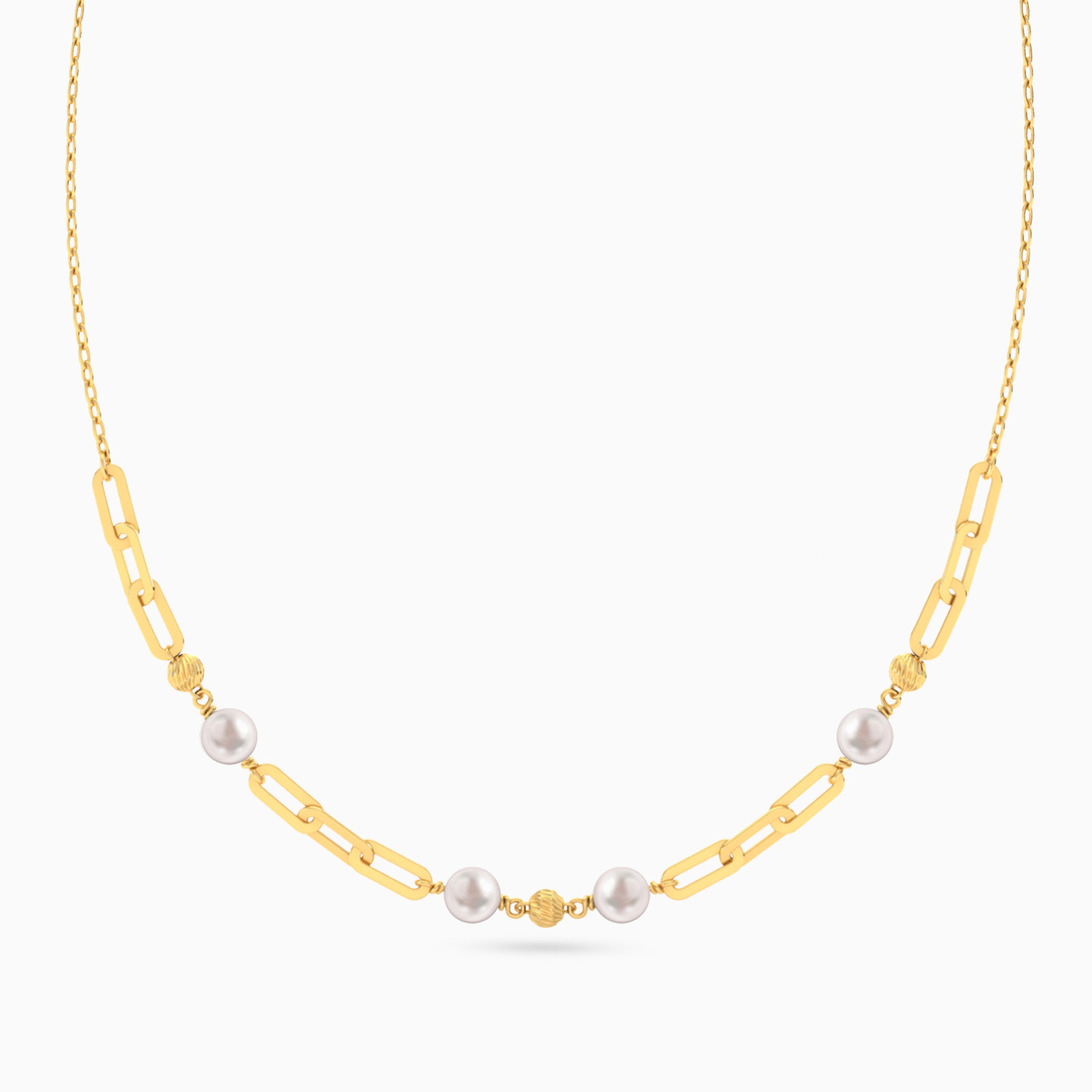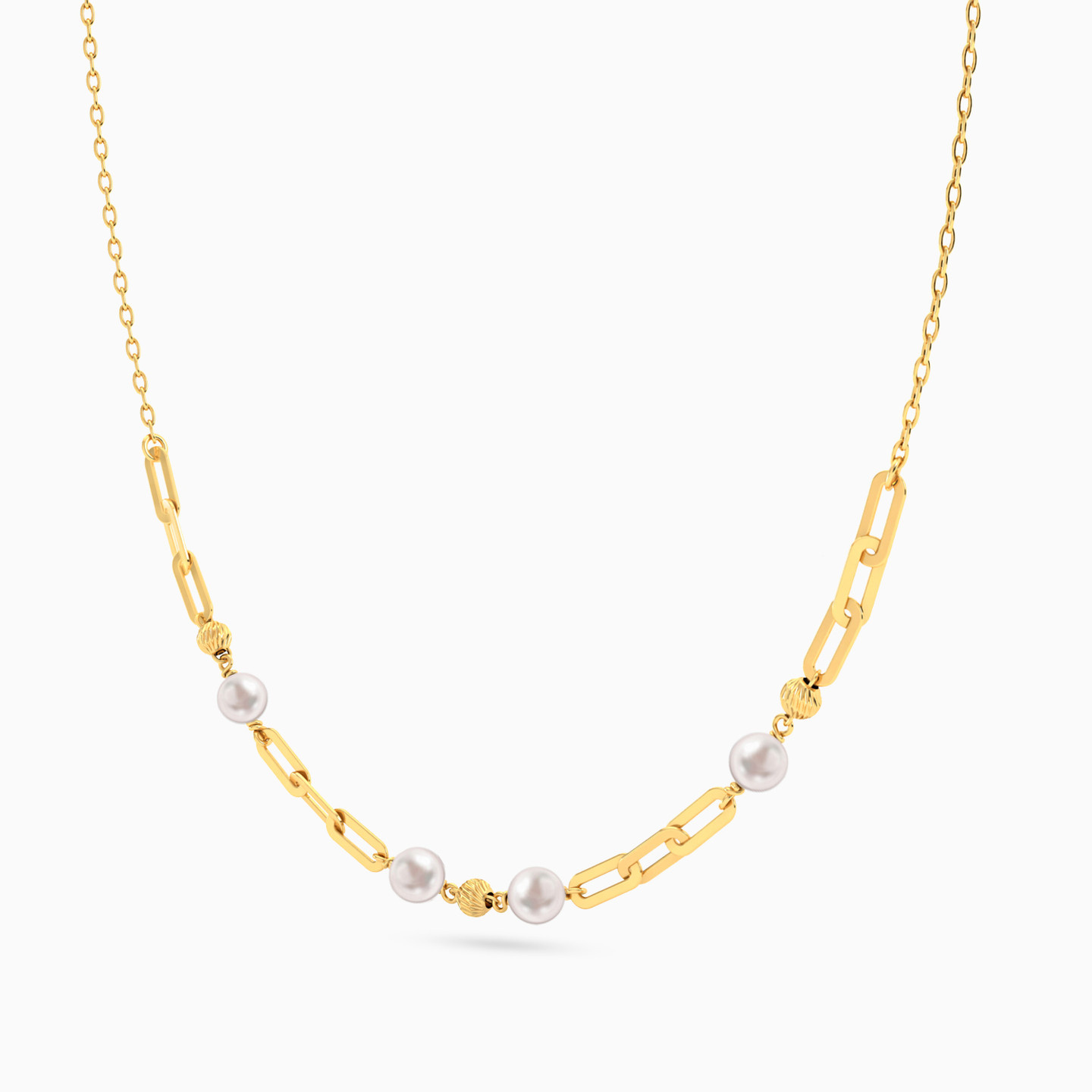 Modern links softened by the glow of pearls. This Miss L’ necklace pairs paperclip-style chains with luminous pearls and golden beads, creating a refined harmony of strength and delicacy. A versatile gift for someone who cherishes elegance in every detail.