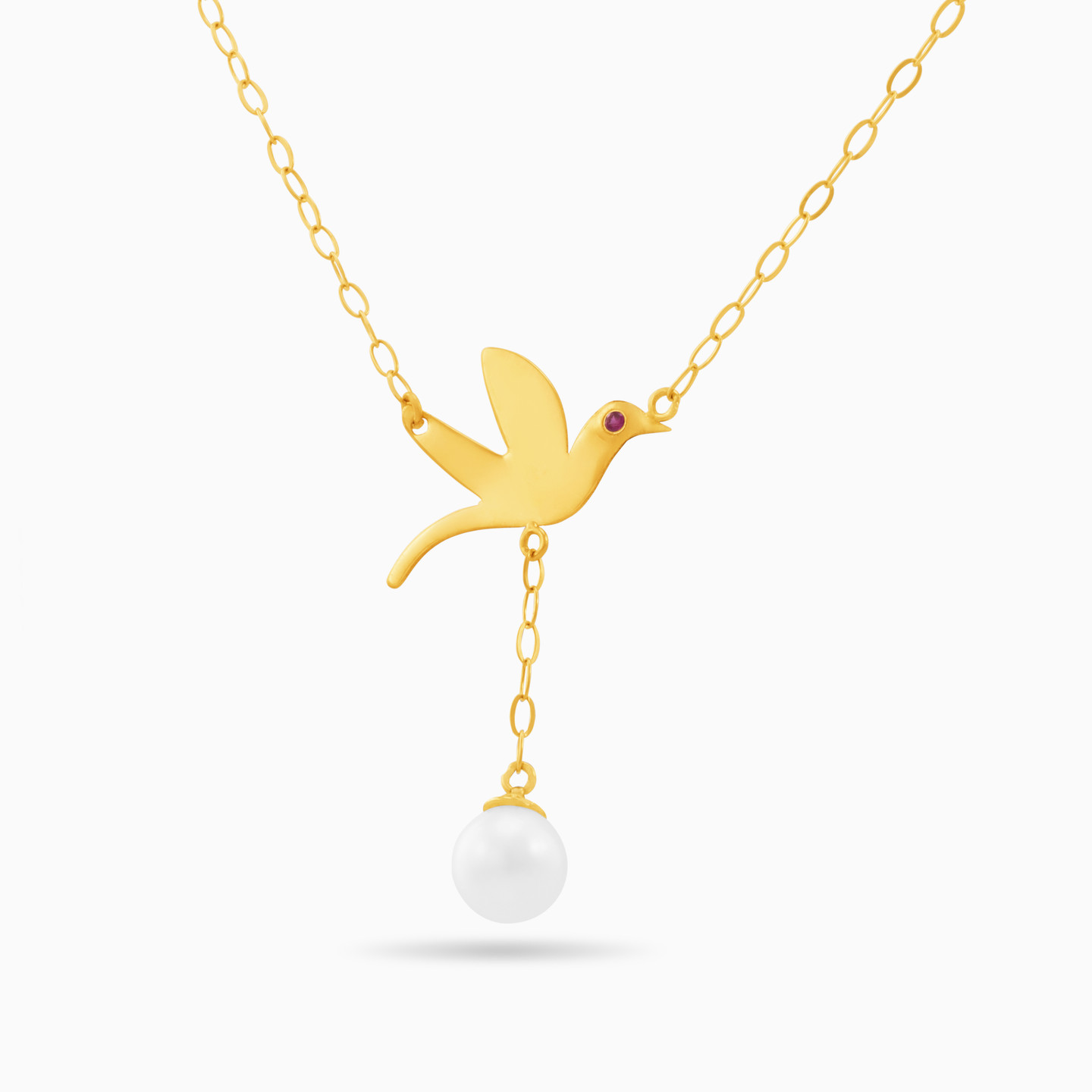 Fly through your day in style with this whimsical 18-karat yellow gold pendant necklace from L'azurde Gold featuring a delightful bird motif – because who said feathers should have all the fun? The delicate chain supports a charming avian friend with a dazzling round-shaped colored stone for an eye. As the pendant leads to a chain dangle, it ends with a flourish – a lustrous pearl, ensuring this necklace is not just a piece of jewelry but a flight of fancy and sophistication around your neck!